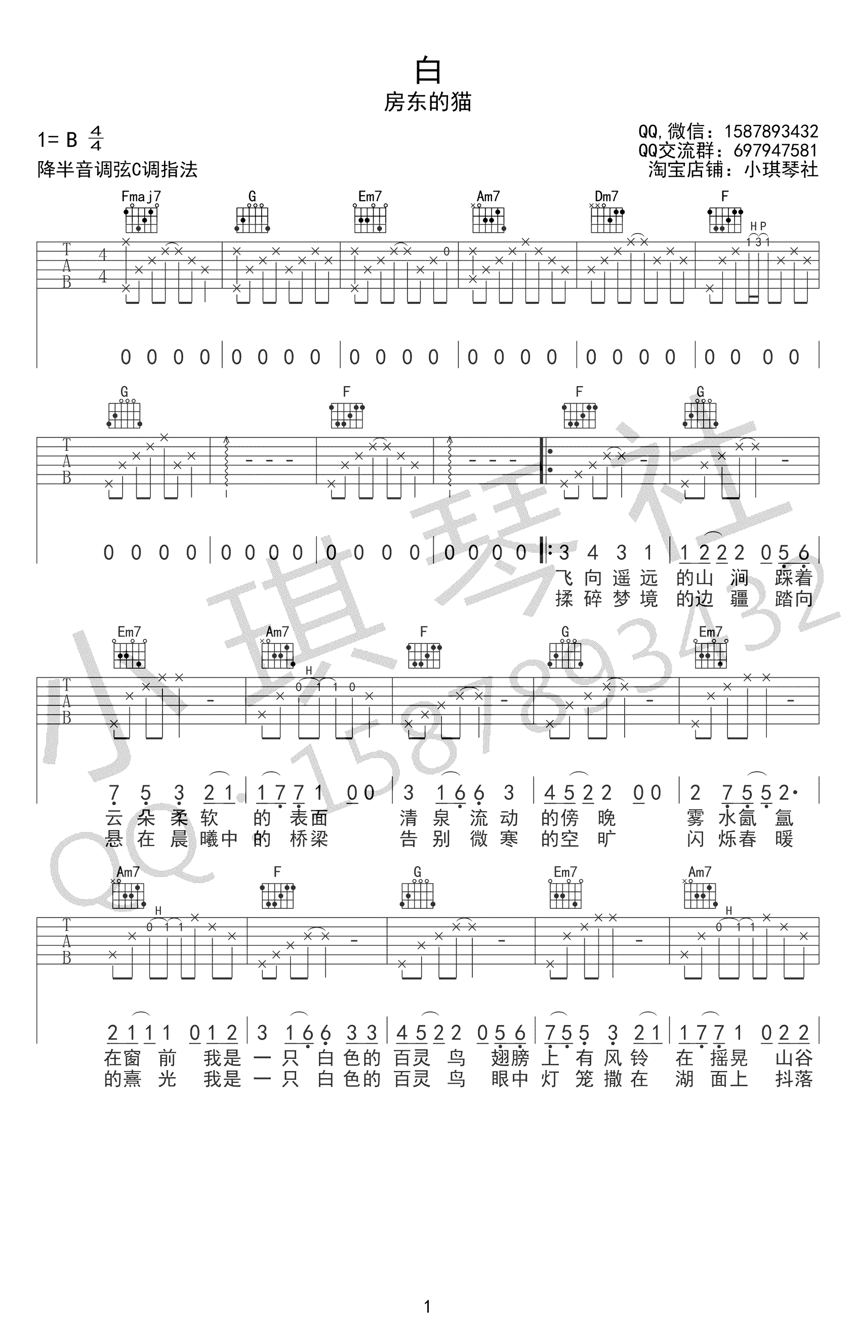 房东的猫《白》吉他谱,原调B,降半音调弦,选用C调指法,《白》吉他六线谱,高清弹唱图片谱,小琪琴社编配出品,吉他吧网站上传收藏。 房东的猫的新专辑《柔软》中的一首好听的歌曲,歌名叫《白》, “白”的读音和“拜”是一样的,是告别过去, 迎接新的生活的寓意,在纯白的天地,我们可以画出自己想要的样子。