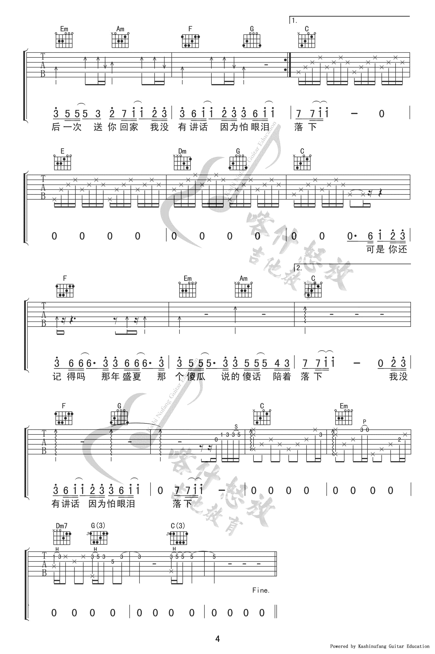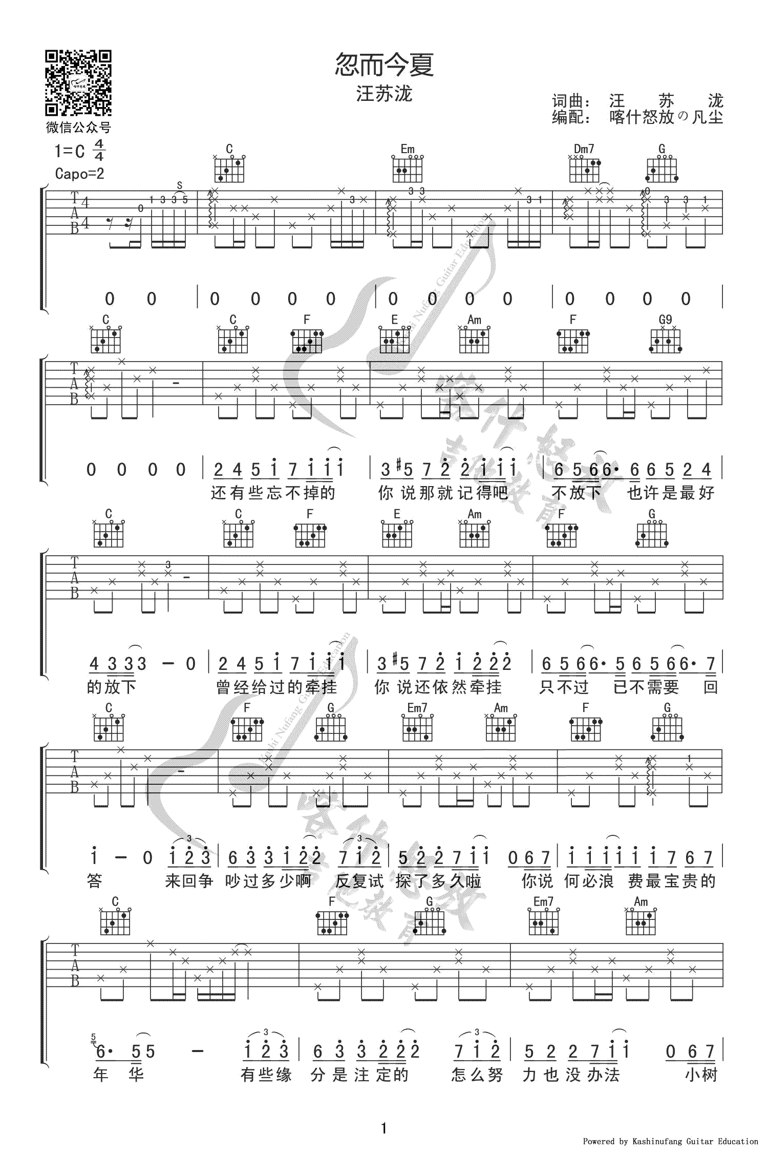 忽而今夏吉他谱,汪苏泷创作演唱,青春剧《忽而今夏》主题曲,C调指法,变调夹夹第二品。忽而今夏六线谱,高清弹唱图片谱,感谢喀什怒放编配出品,吉他吧网站上传分享。 汪苏泷温暖而伤感的歌声,搭配甜酸的剧情,娓娓唱出了异地恋中那些细碎的往昔。唱着剧中他们的故事,却唱中了无数人的曾经。