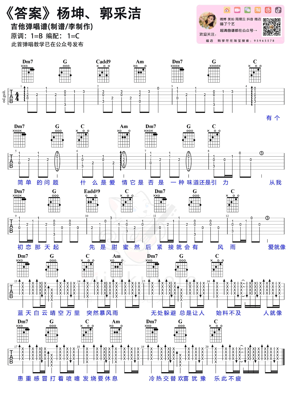 杨坤郭采洁《答案》吉他谱,原调B,选调C,一首热门抖音歌曲,答案吉他六线谱,前奏到副歌部分简单版本,感谢喵了个艺编配出品,吉他吧上传。喜欢这首歌曲的琴友们跟随李老师的吉他弹唱教学视频练习起来。爱情的主题如同晴雨表一,让人琢磨不定。杨坤和郭采洁合唱的这首歌曲,给出了爱情一个适合的《答案》。