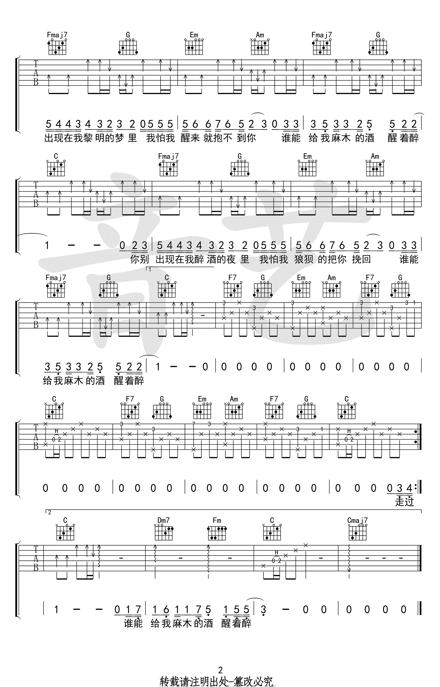 马良《醒着醉》吉他谱,原调F调,变调夹五品,选用C调指法编配,独立音乐人马良继《往后余生》之后的一首走心作品,醒着醉六线谱,高清弹唱图片谱,音艺出品,吉他吧网站上传。你别出现在我黎明的梦里, 我怕我醒来就抱不到你。人生不如意十有八九,谁又没有经历过一段低谷呢?在低落的时候醒着醉,没什么大不了的。且听马良把往事唱成一首歌吧。