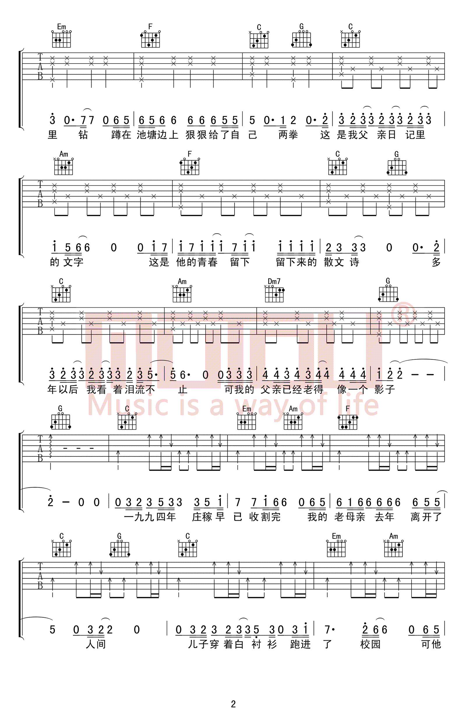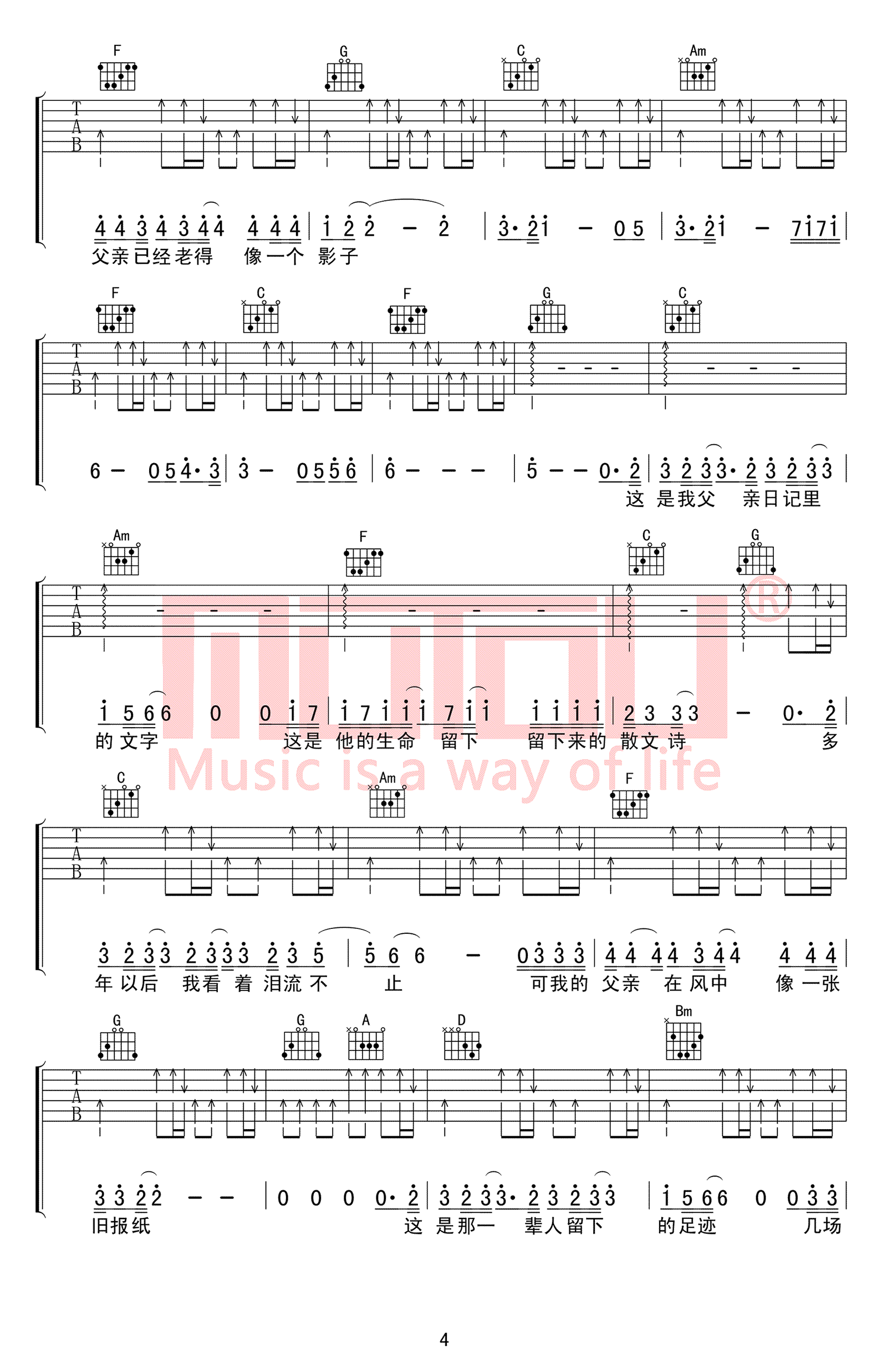 父亲写的散文诗吉他谱,李健演唱,C调指法编配,高度还原版本,歌曲原唱许飞,父亲写的散文诗六线谱,吉他弹唱高清图片谱,完整版共五张谱例,感谢木头吉他屋出品,吉他吧网站整理上传。 一首唱给父亲的歌,没有华丽的辞藻,平铺直叙却质朴动人,唱进了无数人的心中,让人潸然泪下,引起了我们对父亲的回忆。