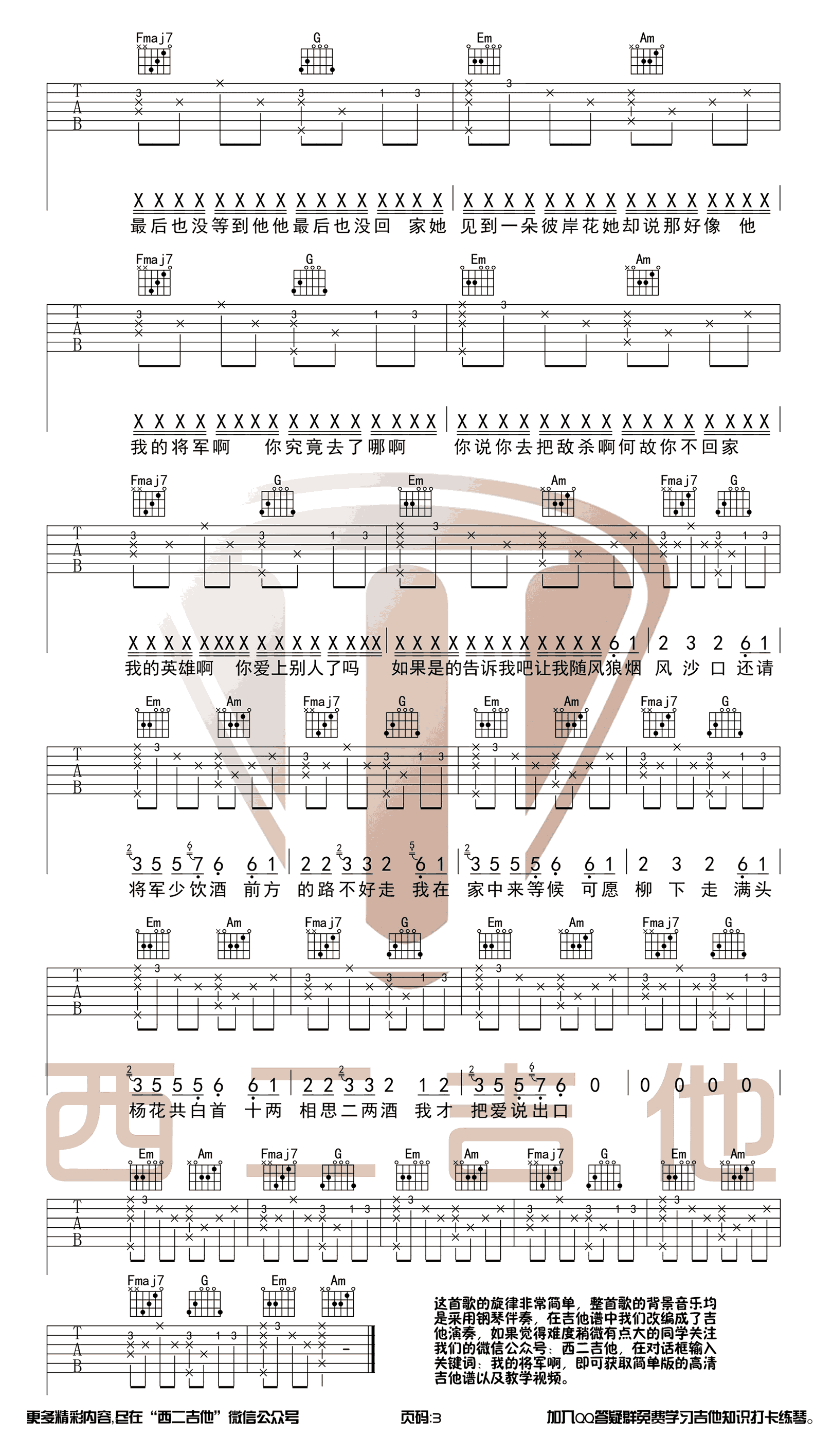 抖音歌曲《我的将军啊》吉他谱,C调和弦原版伴奏,变调夹夹一品,《我的将军啊》六线谱,歌手半阳演唱的一首歌曲,由半阳作词,原曲来自英文歌《watch the pacific》,旋律非常简单,原曲为钢琴伴奏,这里改编成吉他演奏。感谢西二吉他出品。 狼烟风沙口,还请将军少饮酒,前方的路不好走,我在家中来等候。这首歌在抖音上火的不得了,众多粉丝纷纷点赞,转发量更是惊人,附上一个《我的将军啊》手势舞教程。