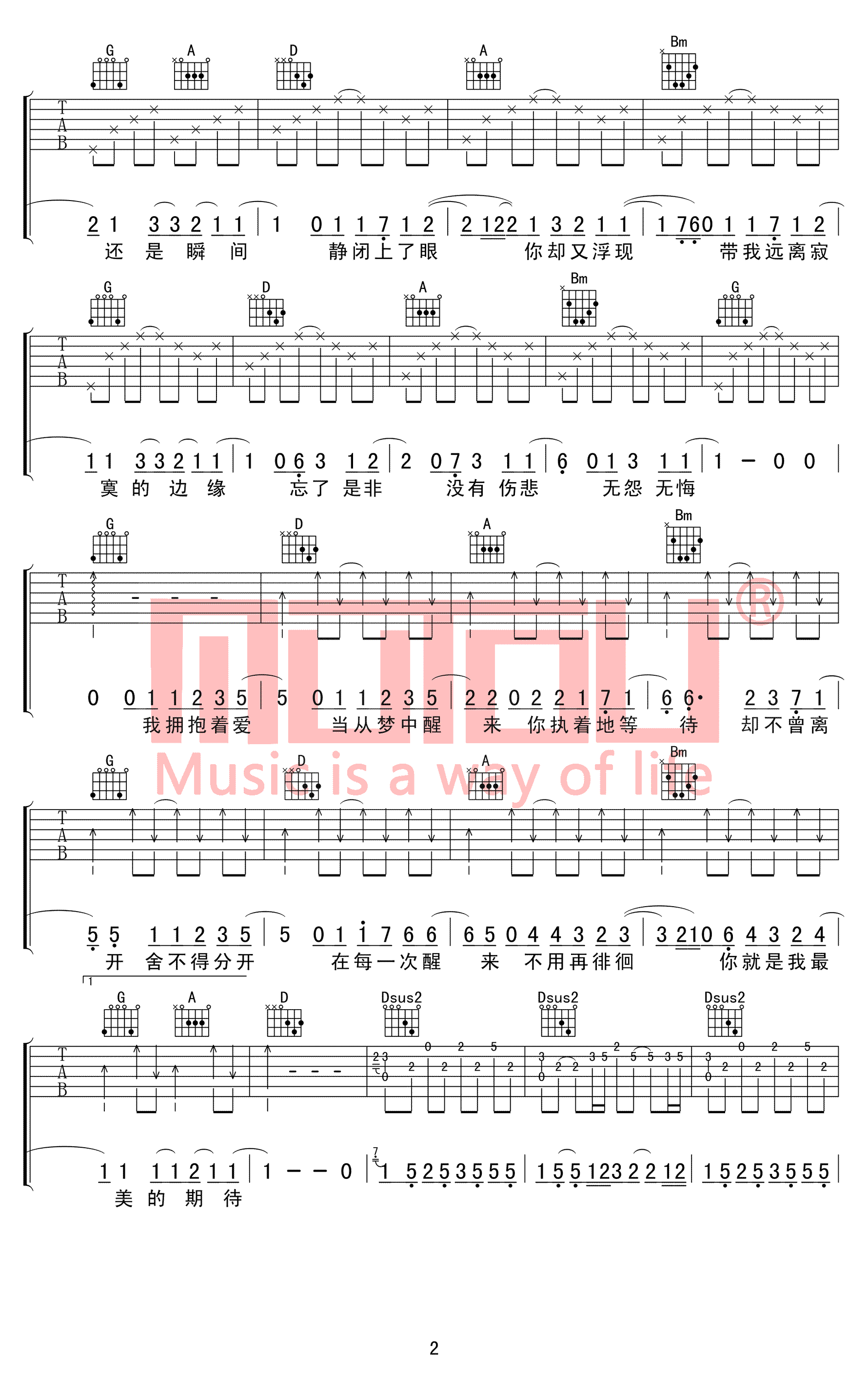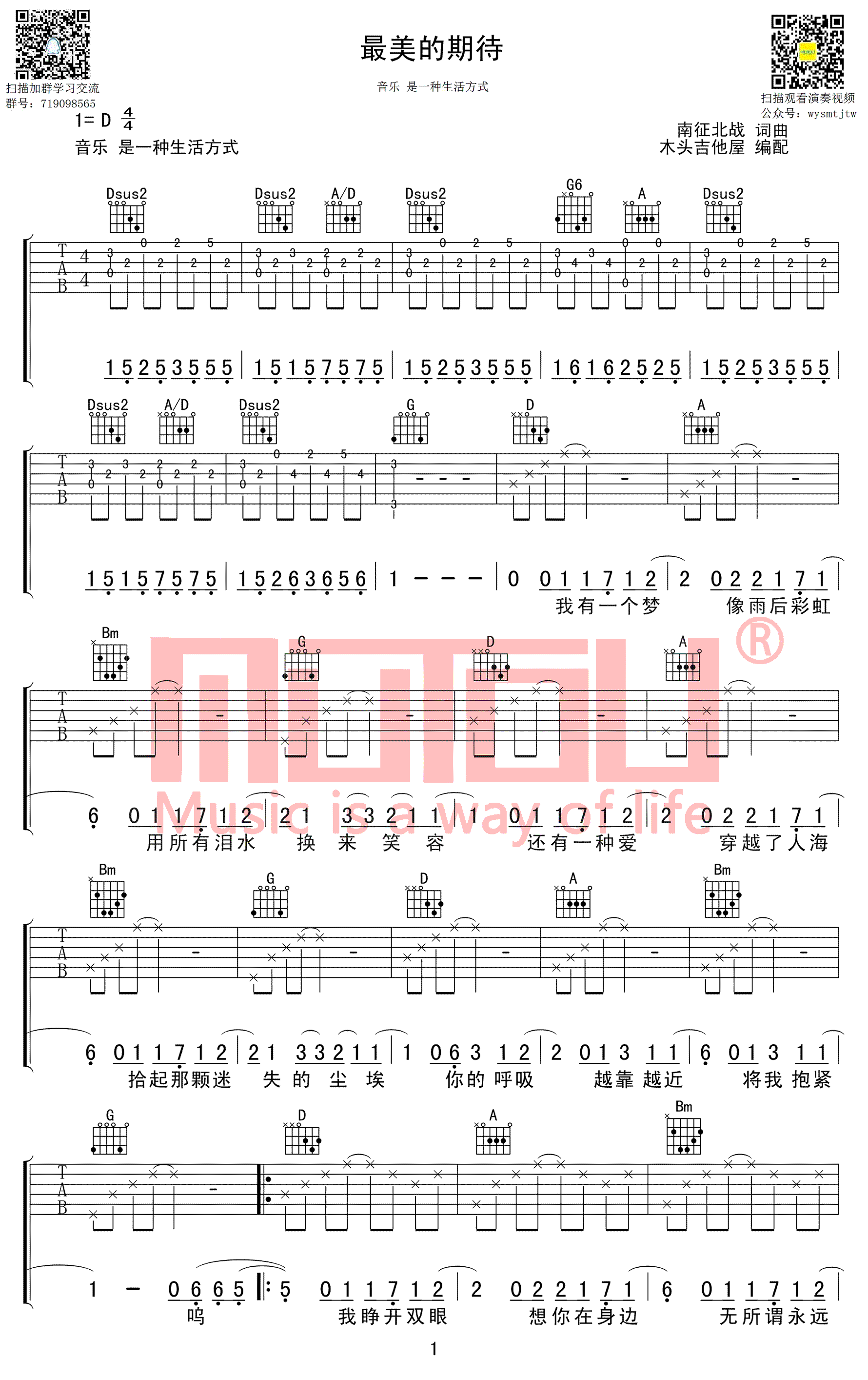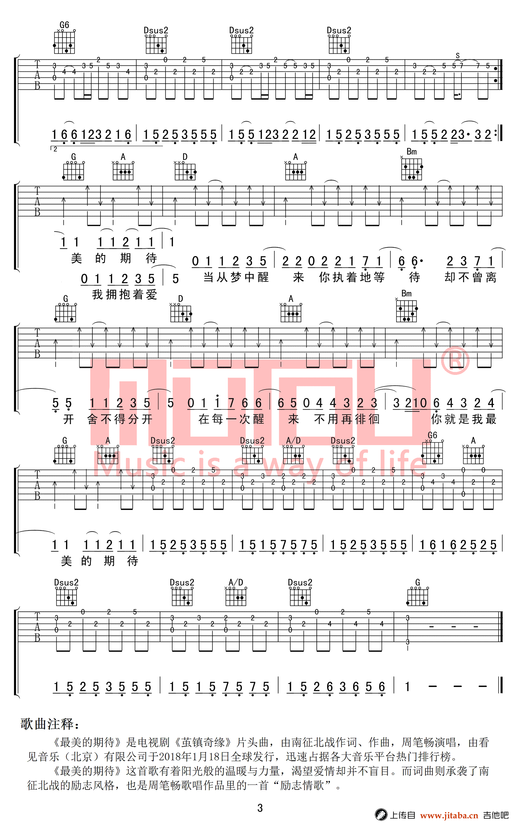 周笔畅《最美的期待》吉他谱,D调指法原版编配,热门抖音歌曲《最美的期待》六线谱,高清弹唱图片谱,木头吉他屋出品,吉他吧网站上传。 也许,做最好的自己,就是最好的想你。也许,最美的期待,就是不断的努力,然后在不远的前方遇见想要的我和你。世界那么大,人生那么长,为了你,我愿意成为最好的自己。