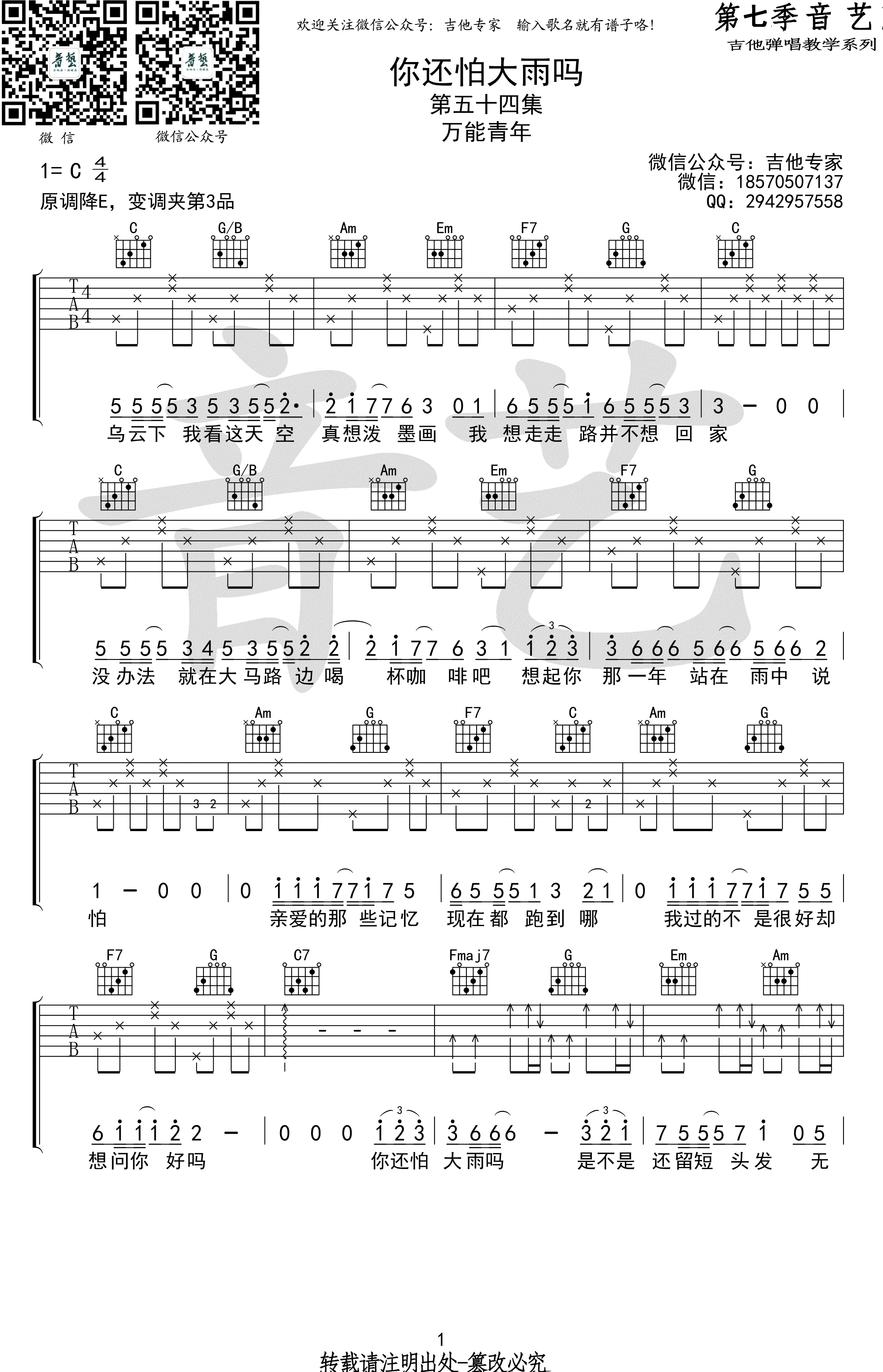 你还怕大雨吗吉他谱,周柏豪原唱,万能青年旅店翻唱版本,热门抖音歌曲,你还怕大雨吗六线谱,原调E,变调夹夹三品,选用C调指法编配,高清弹唱图片谱,感谢音艺出品,吉他吧网站上传。 你还怕大雨吗,是不是还留短头发。这首最近火于抖音,关于失恋伤心的歌曲。抖音歌曲C调简单版,很适合一个人弹唱!