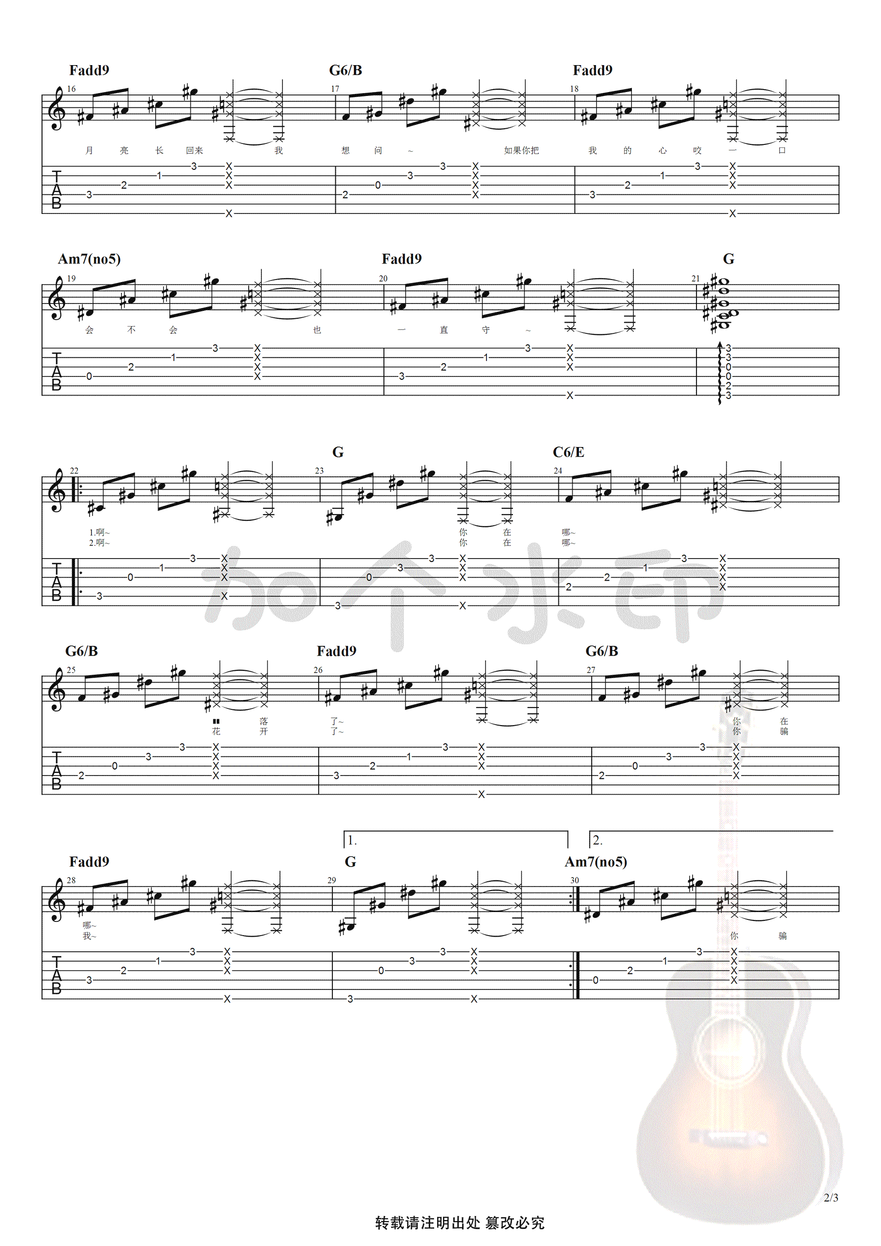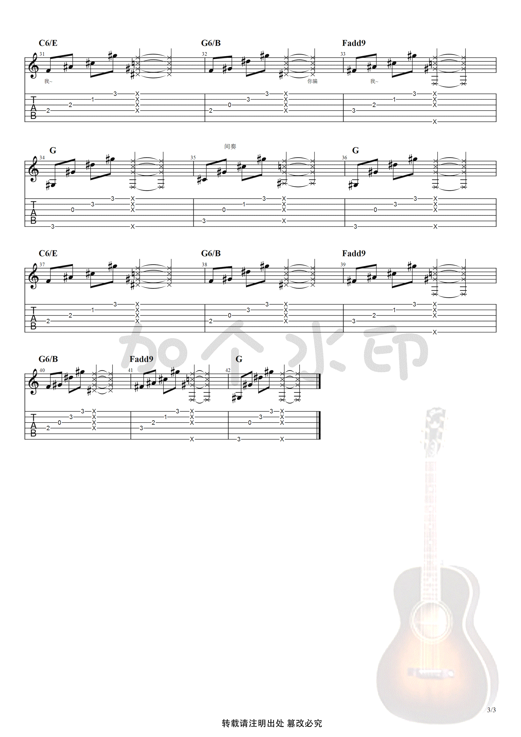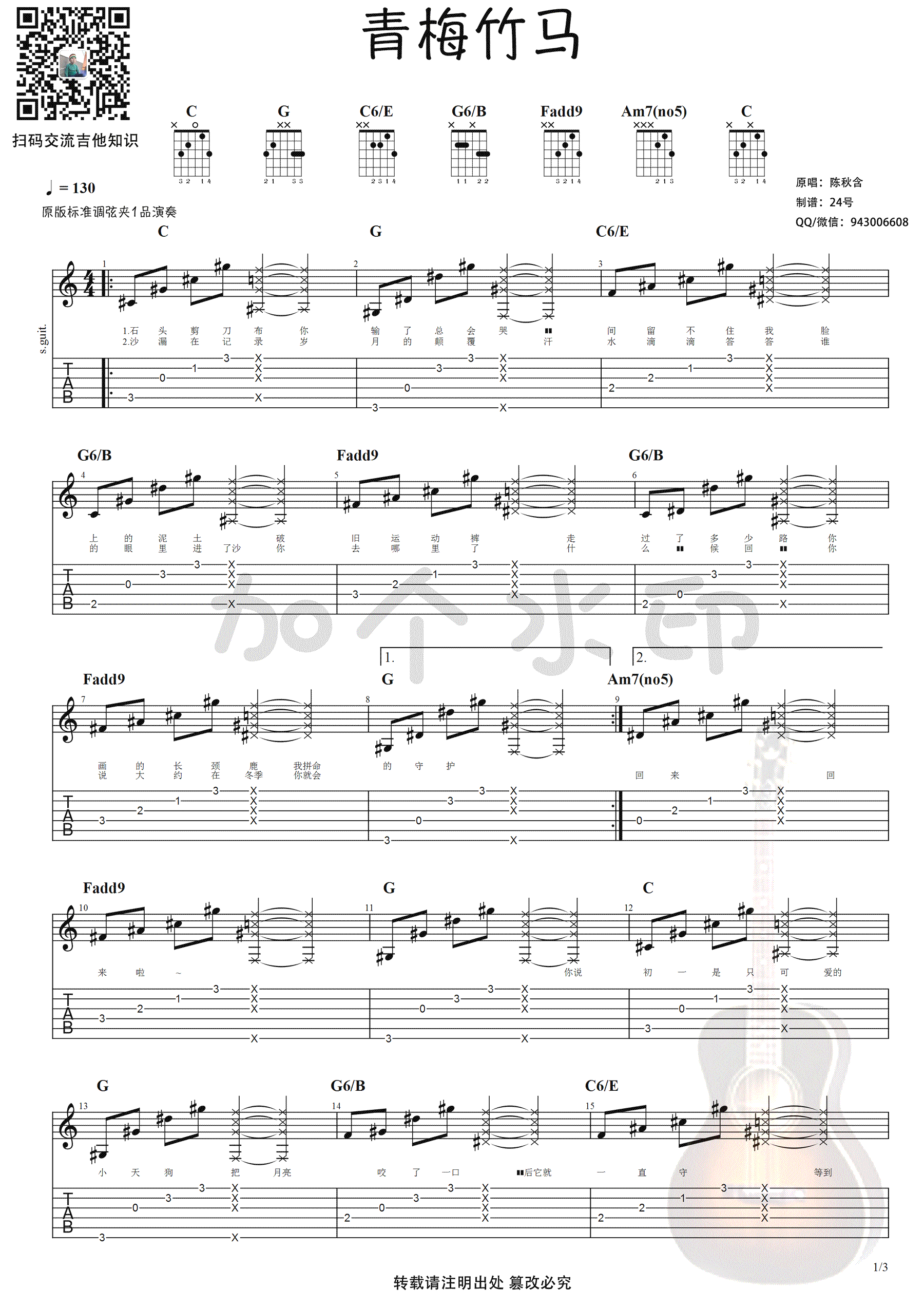 陈秋含《青梅竹马》吉他谱,原调升C调,原版标准调弦夹一品演奏,第二遍主歌节奏型有变化,和弦一样。抖音歌曲吉他弹唱谱,青梅竹马六线谱,高清图片谱,感谢24号编配出品,吉他吧网站上传。 歌曲充满童真,却又带着淡淡的忧伤,成长的可爱到岁月的蹉跎,纵然为你付出最美的青春,老去了容颜,但从未后悔。