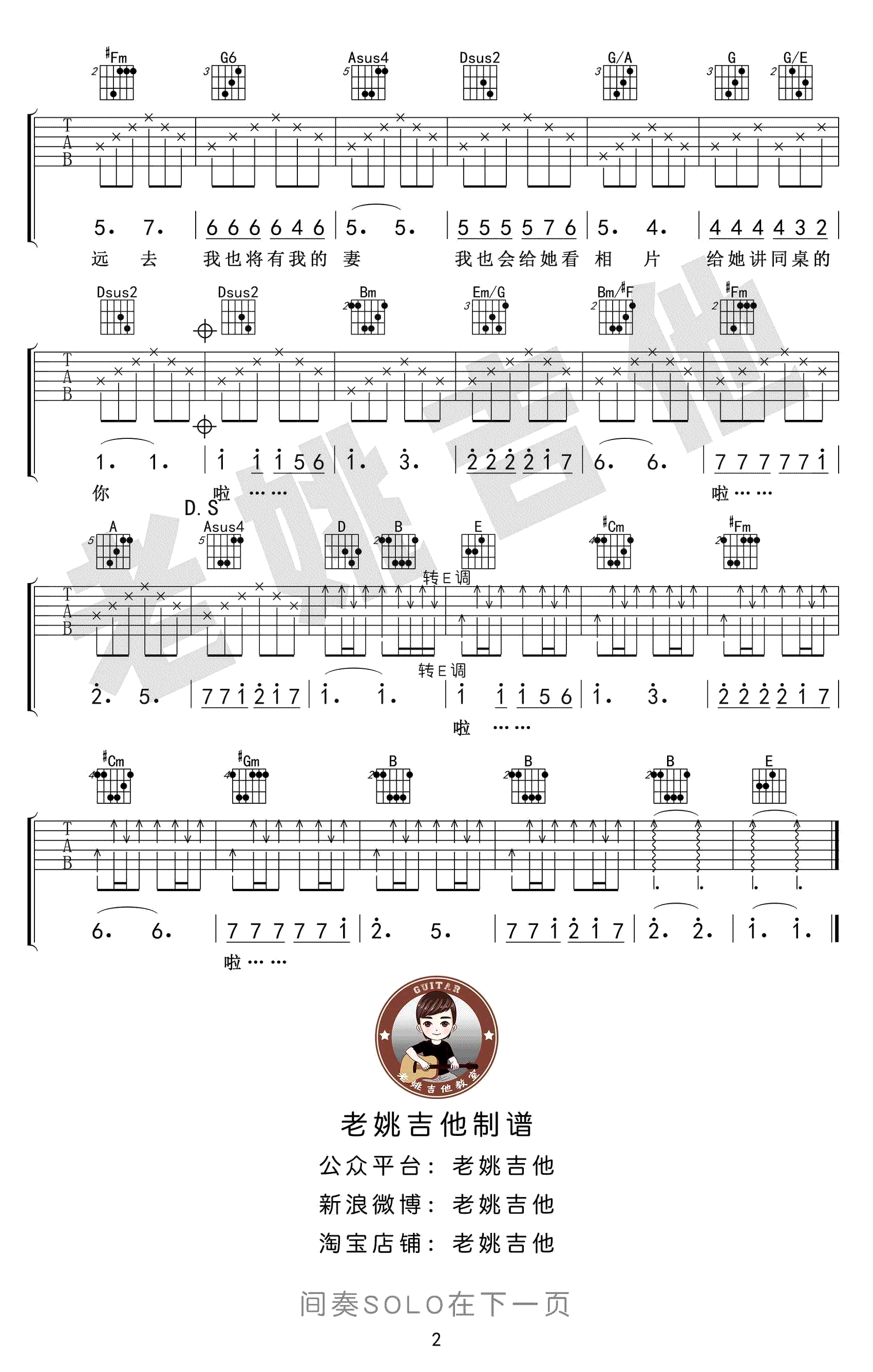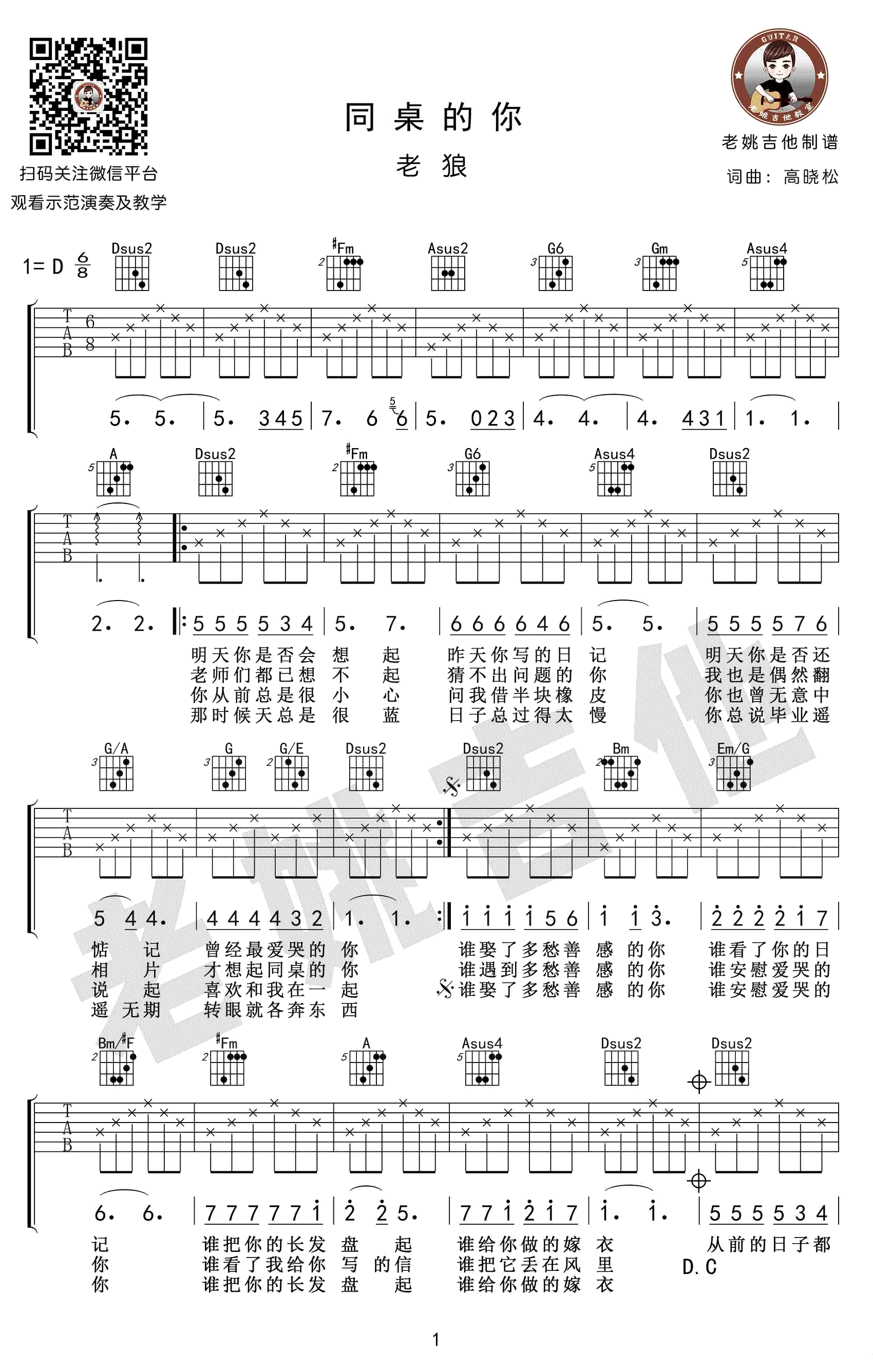 同桌的你吉他谱,老狼调一首经典校园民谣歌曲,D调高清弹唱谱,同桌的你六线谱,带间奏Solo,老姚吉他编配出品,吉他吧网站推荐分享。又是一年毕业季,感怀与伤感齐来,学生时代的日子总是让人怀念。还记得当年,坐在你前后左右的同学吗?还记得当年你暗恋过的女孩吗?青葱岁月转瞬即逝,挥挥手告别从前,怎还忍去怀念,一首老歌带给你。