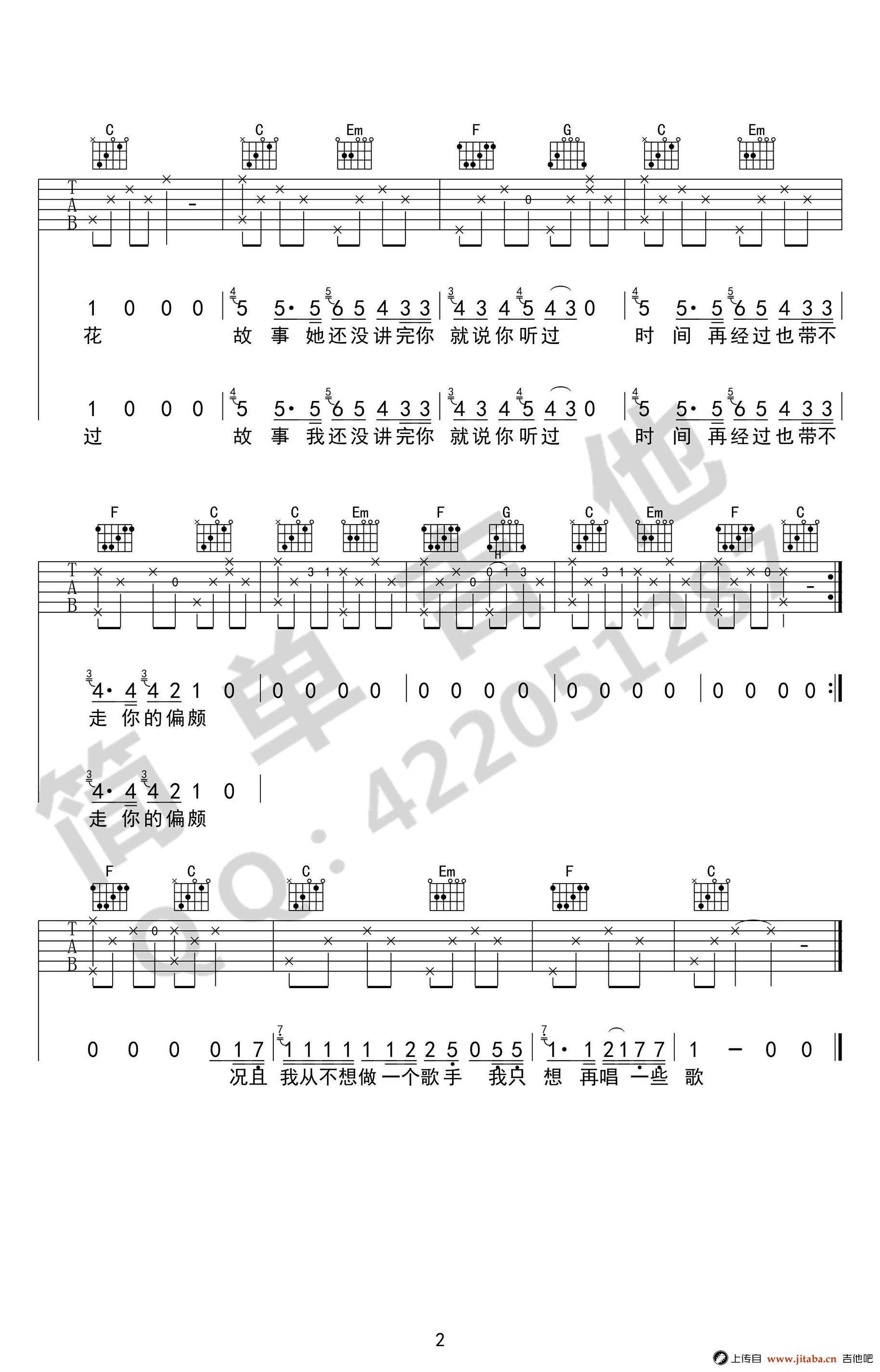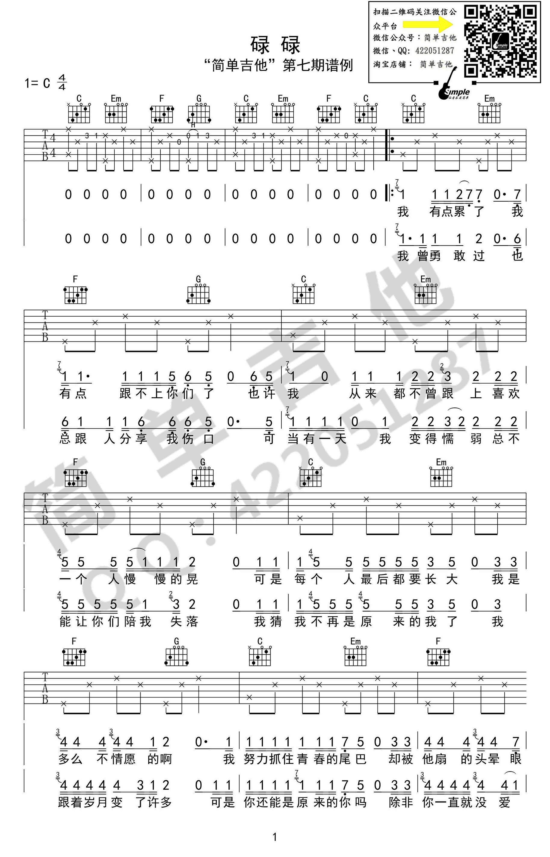 花粥《碌碌》吉他谱,C调指法完美简单版,高清弹唱图片谱,花粥用她慵懒的嗓音,随性的风格,真实的情感,唱出来最简单又最直接的歌。碌碌六线谱,简单吉他出品,吉他吧网站上传。 我们总是碌碌无为,每天活的浑浑噩噩。时间空虚,但是每天都很疲惫。装的深沉,对所有人说,不许小瞧我的孤独,其实骨子里比谁都幼稚。坦然平凡,又不甘下等。一边感慨愧不如人,一边抱怨得不偿失。