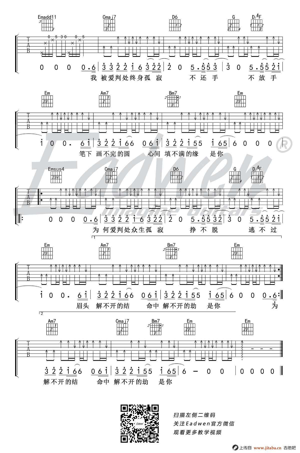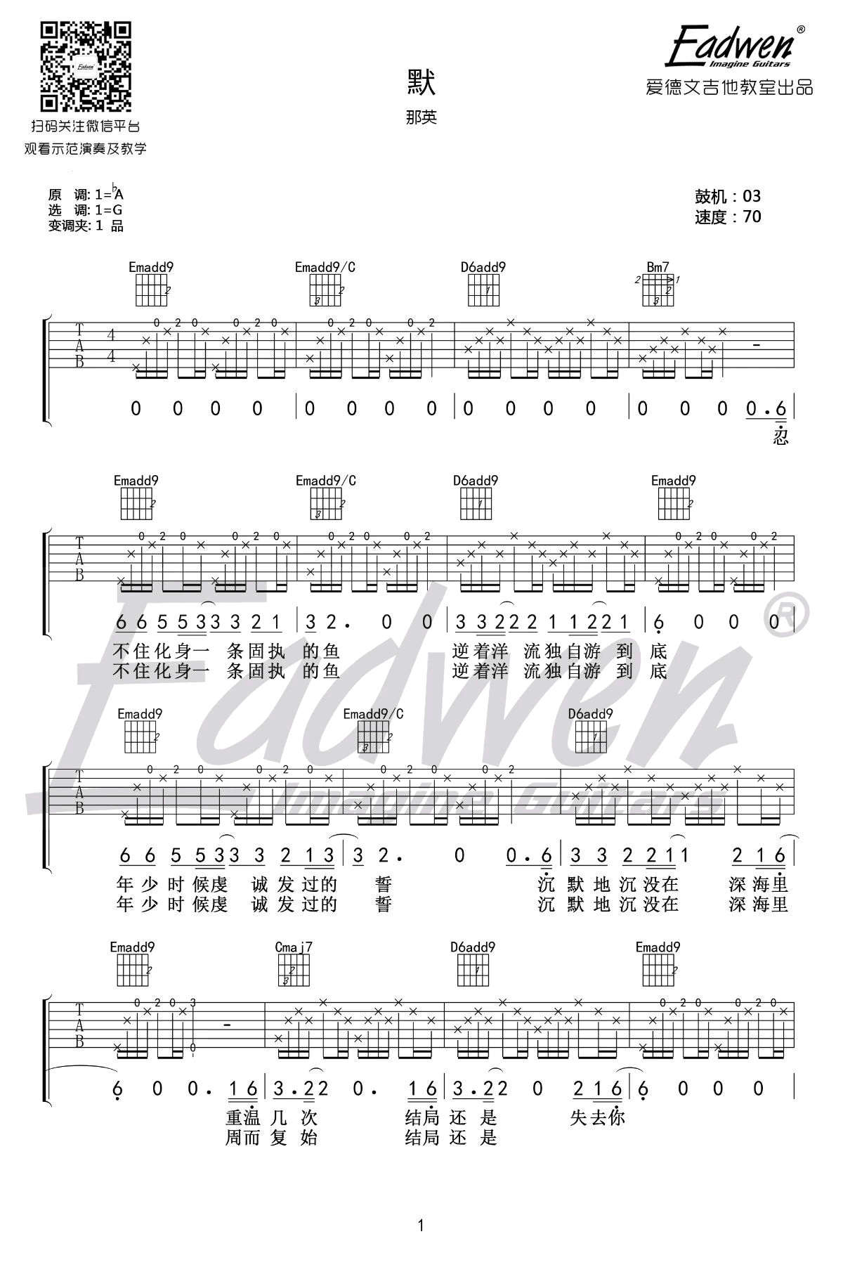 那英《默》吉他谱,《何以笙箫默》电影主题曲,默吉他六线谱,原调bA,选调G,变调夹夹一品,爱德文吉他编配出品,吉他吧网站上传。琴友们跟随陈佰老师,参照配套吉他教学视频练习吧。