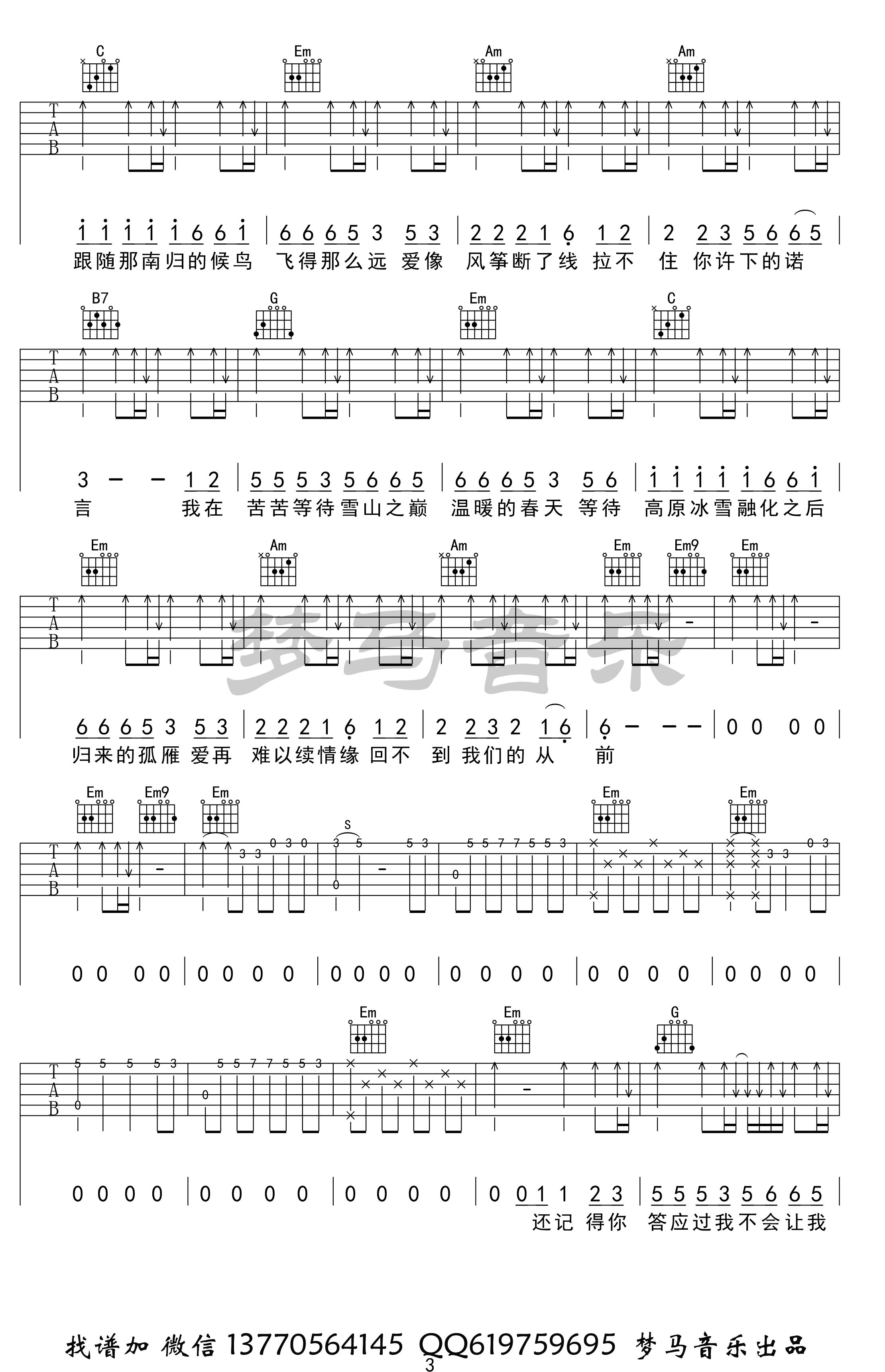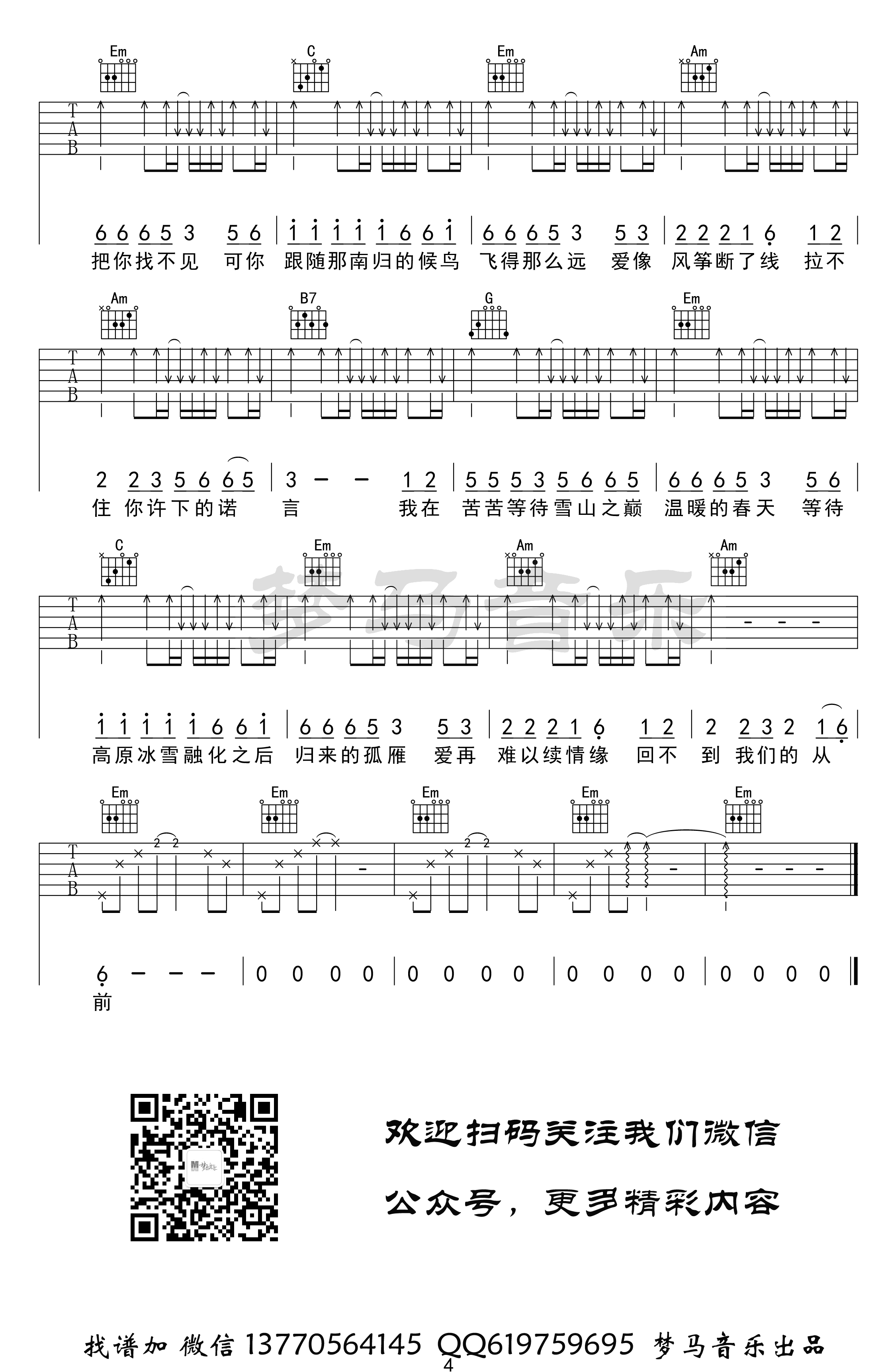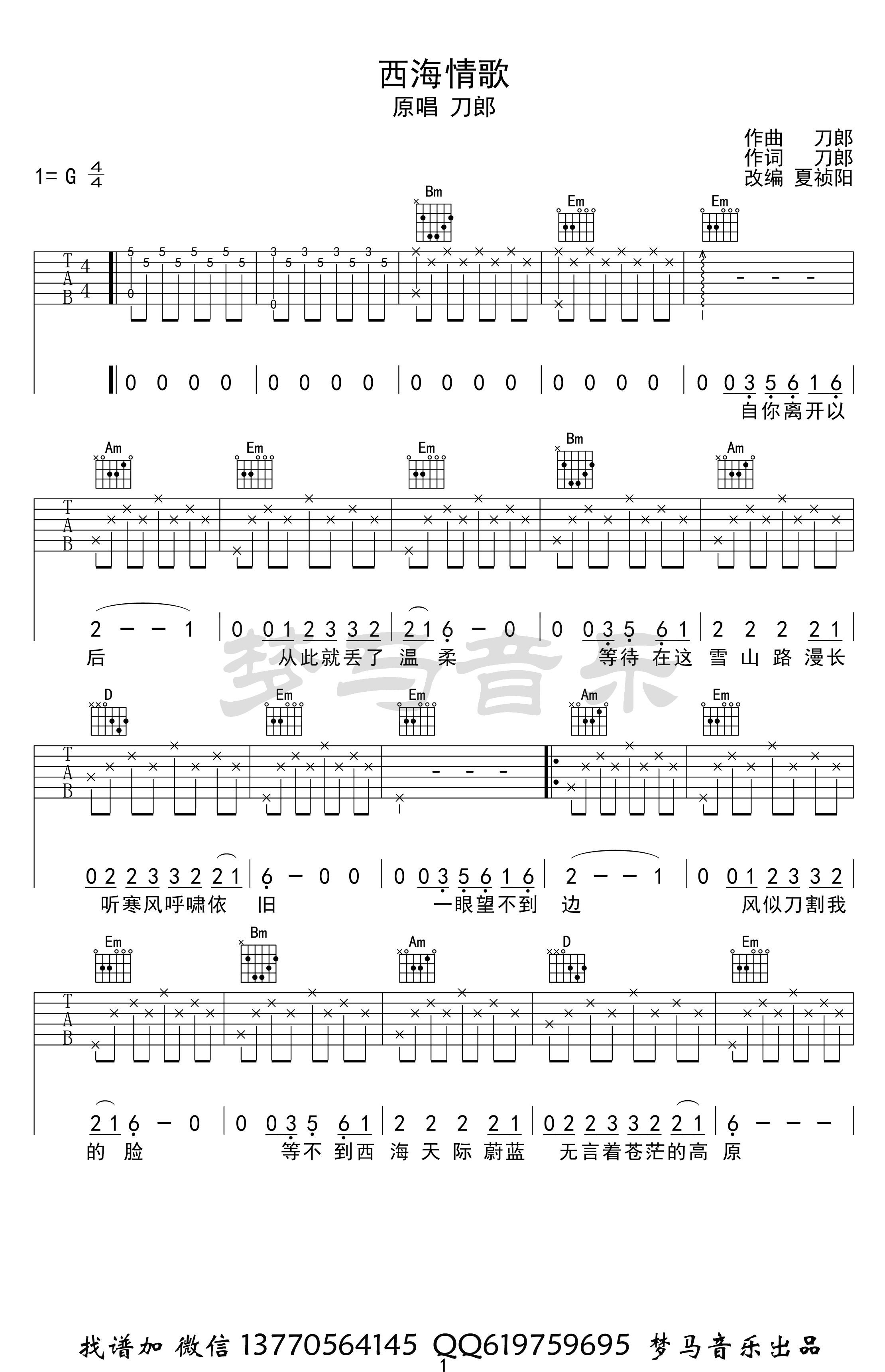 刀郎《西海情歌》吉他谱,G调指法,高清图片谱,完整版共四张六线谱。一首经典的歌曲,现在在抖音上又火了起来,刀郎和降央卓玛的演唱版本受到大家的欢迎。西海情歌六线谱,吉他谱,梦马音乐出品。夏祯阳老师要点讲解: 我用这首歌的一段旋律编了一段演奏指法,加在了歌曲的后半段。这是我偶然编出来的。我想怎么也得加进去。指法很简单。适合大家弹弹。其他都没啥好说的,就看唱的怎么样了。声音粗犷的人更能唱出西部的苍凉,西部的爱情。