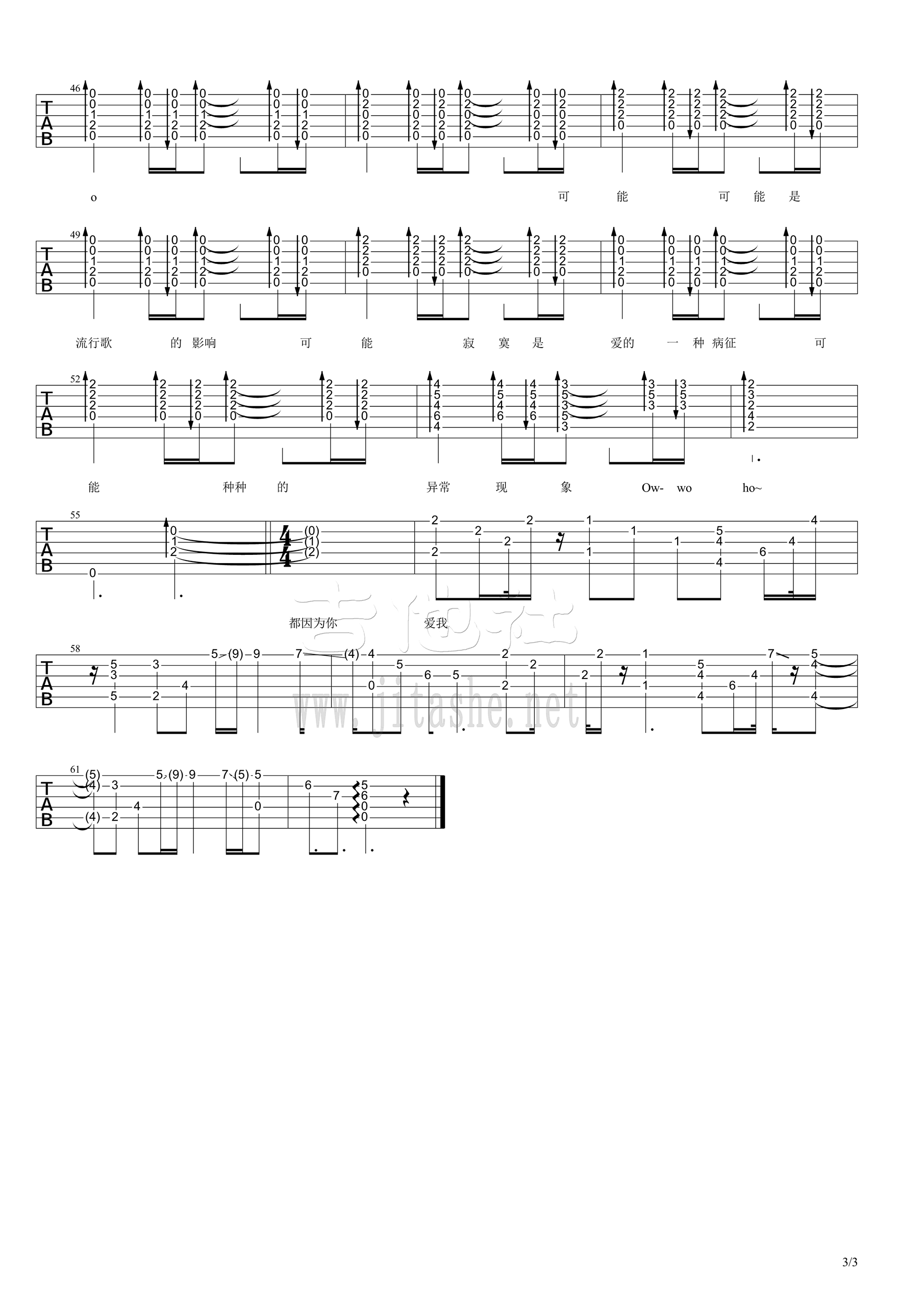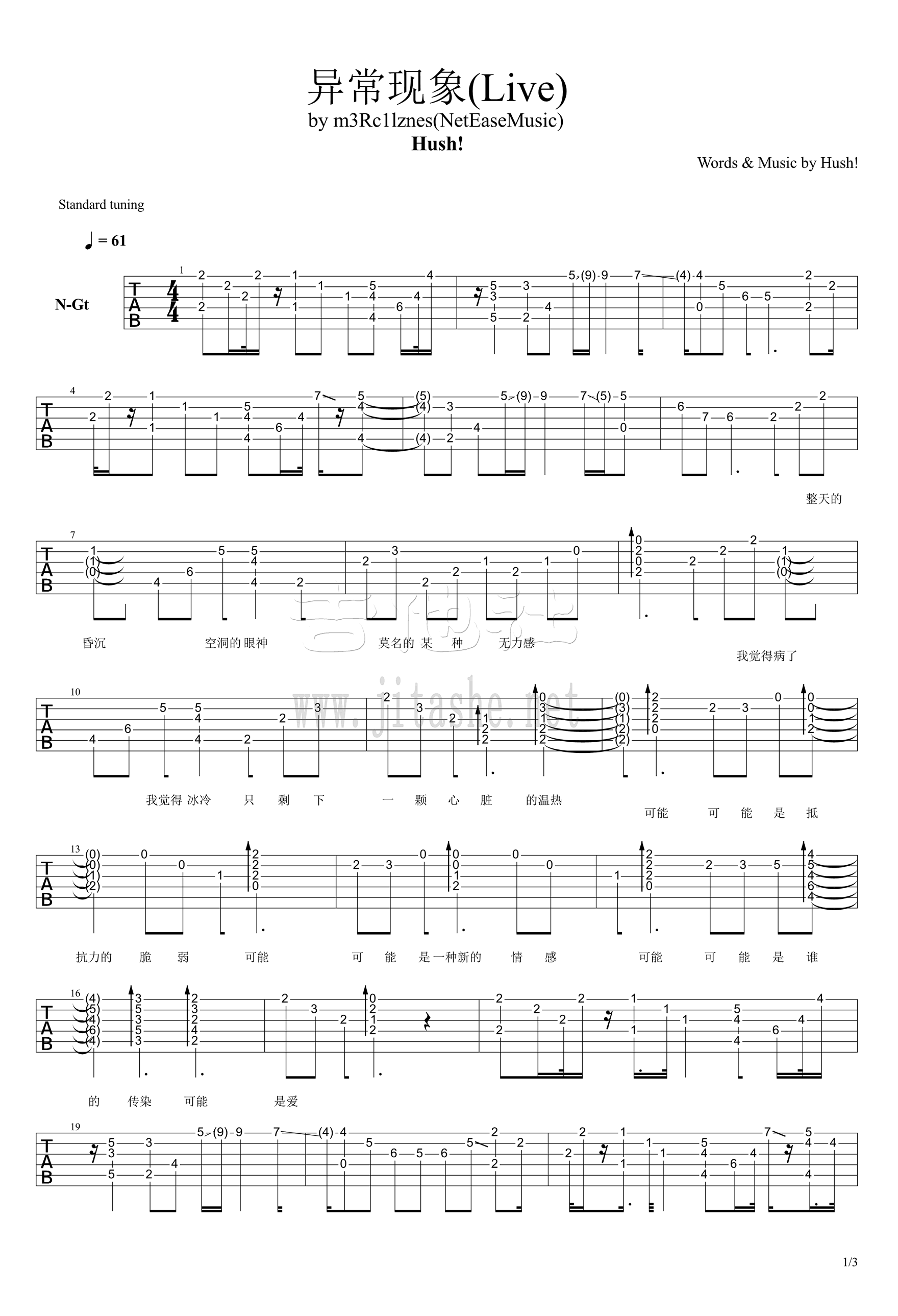 HUSH《异常现象》吉他谱,高清弹唱图片谱,每个人多少都和爱共生,可能,寂寞是爱的一种病征。Hush!演唱,《异常现象》六线谱,by m3Rcllznes,吉他吧网站上传。 带着寂寞心灵的碰撞伤痕,为你唱出难以捉摸的恋爱心情,唤醒夜里每一个过来人,无法躲避的羞赧微温,只为这个季节最后一场浪漫。 前半段低沉抑郁,最后一句猝不及防一把狗粮“种种的异常现象,都是因为你爱我”,调子急转而上欢快到让单身狗抓狂。