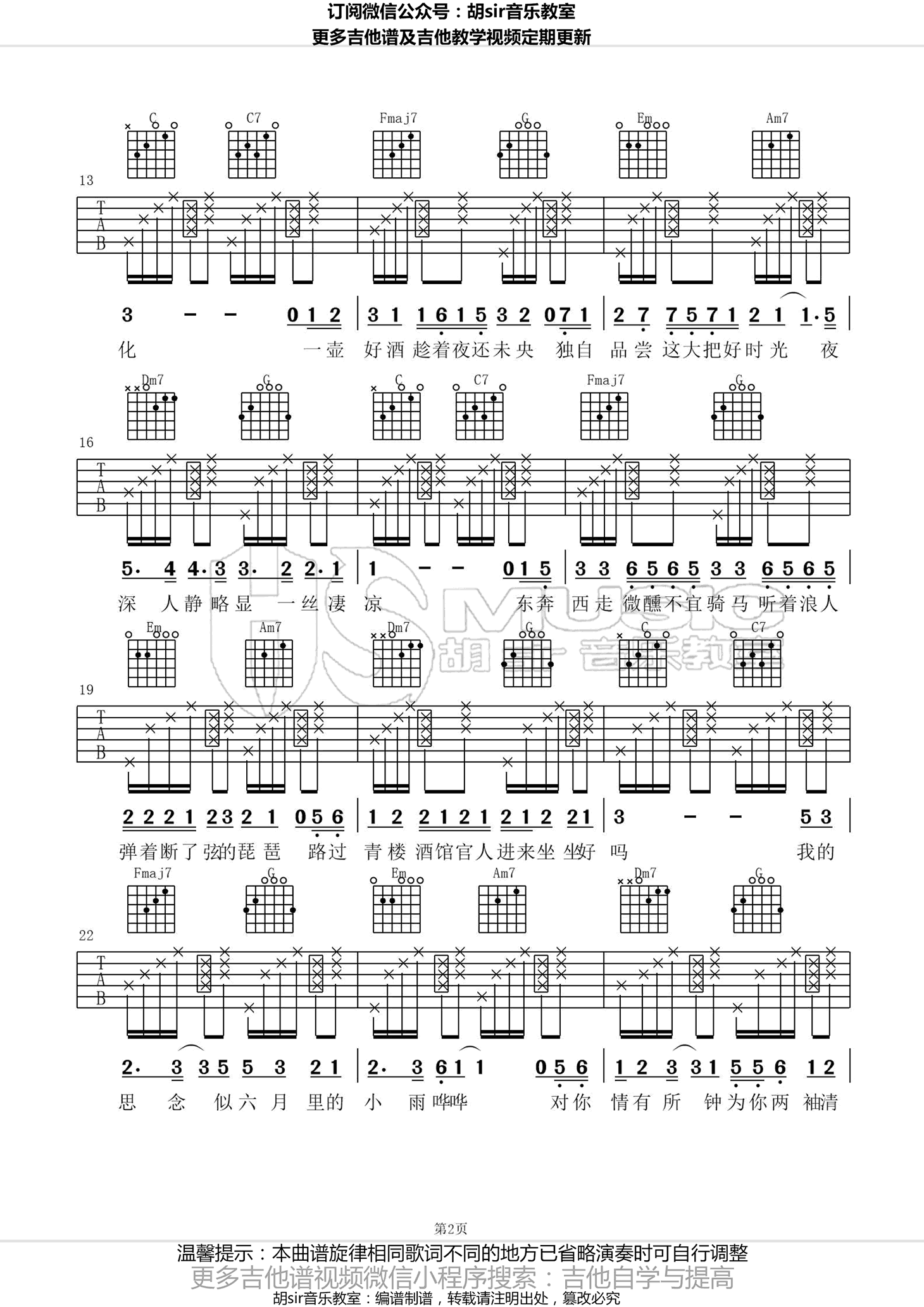 浪人琵琶吉他谱,胡66演唱的一首新歌,浪人琵琶六线谱,原调#C调,选用C调,变调夹夹一品为原调,变调夹推荐,男生夹5品,女生夹一品。胡sir音乐教室出品,吉他吧网站推荐分享。 小生的花伞还落在你家,你美眷如花我浪迹天涯。一首抖音热门歌曲又来洗脑了,胡66独特的嗓音,将一曲江湖儿女爱恨柔肠演绎的别有韵味。