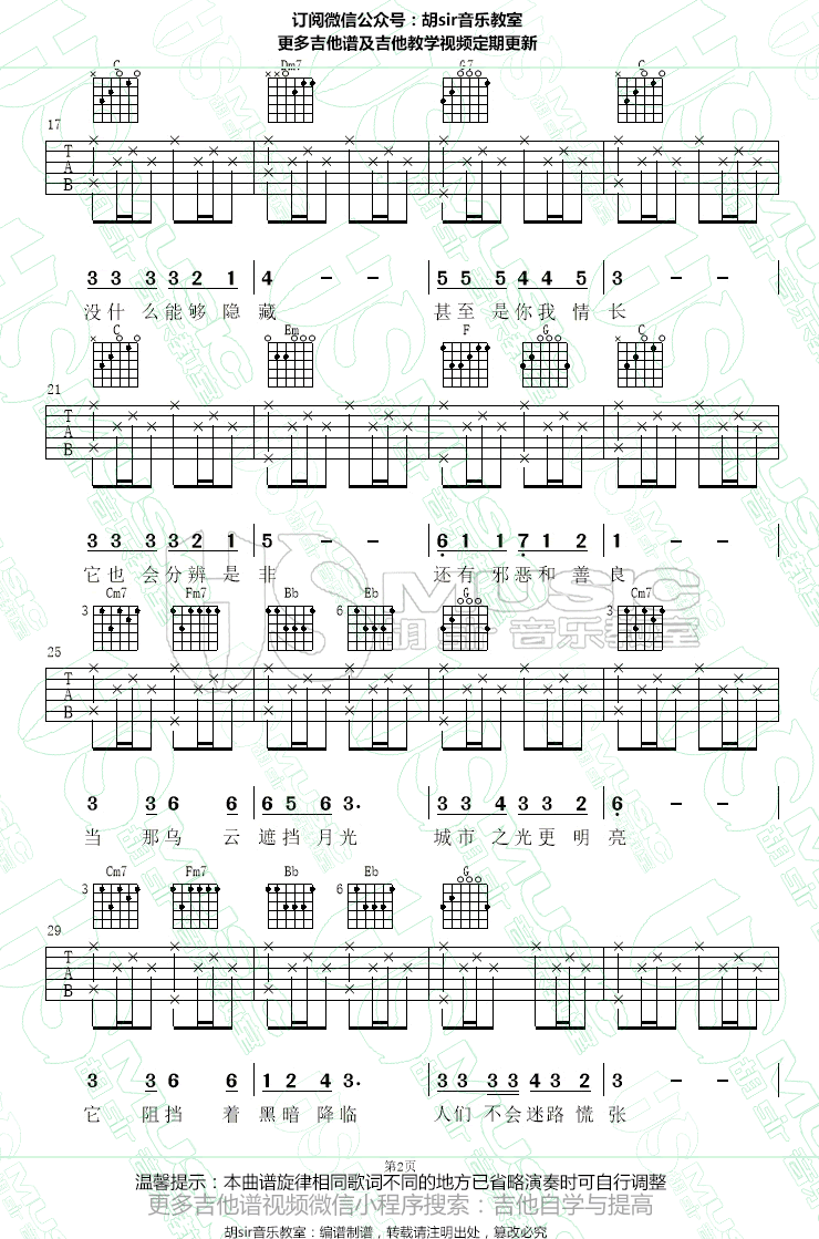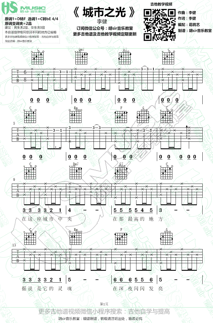 李健《城市之光》吉他谱,电影 《心理罪之城市之光》 主题曲,词曲演唱李健,原调D转F调,选调C转bE,变调夹推荐,男生夹2品。城市之光六线谱,胡sir音乐教室编配出品,吉他吧推荐上传。 悠远纯净带画面感的歌声,很容易将听者带入到故事情节中,瞬间入戏,歌曲舒缓不乏高亢,柔情又有力量。城市之光应该照耀它所有的人,无论日与夜。
