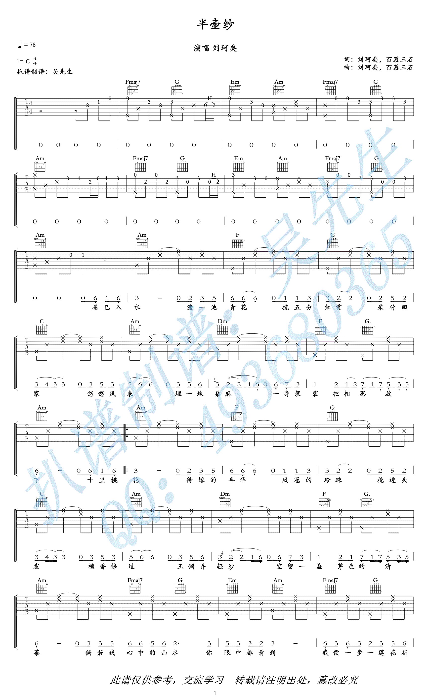 半壶纱吉他谱,古风歌手刘珂矣演唱的一首别致清雅的禅意歌曲。半壶纱六线谱,C调弹唱谱,高清图片谱,感谢吴先生扒谱制谱。 旋律流畅飘逸,歌词意蕴丰富,从容清雅的吟唱,蕴藏着净心脱尘的能量。红尘滚滚,纷繁世事,人心变得日渐浮躁,歌曲如涓涓细流涤荡人的心灵,让人沉静下来,梳理杂乱的思绪,给人以耳目一新、清新脱俗的听觉享受。