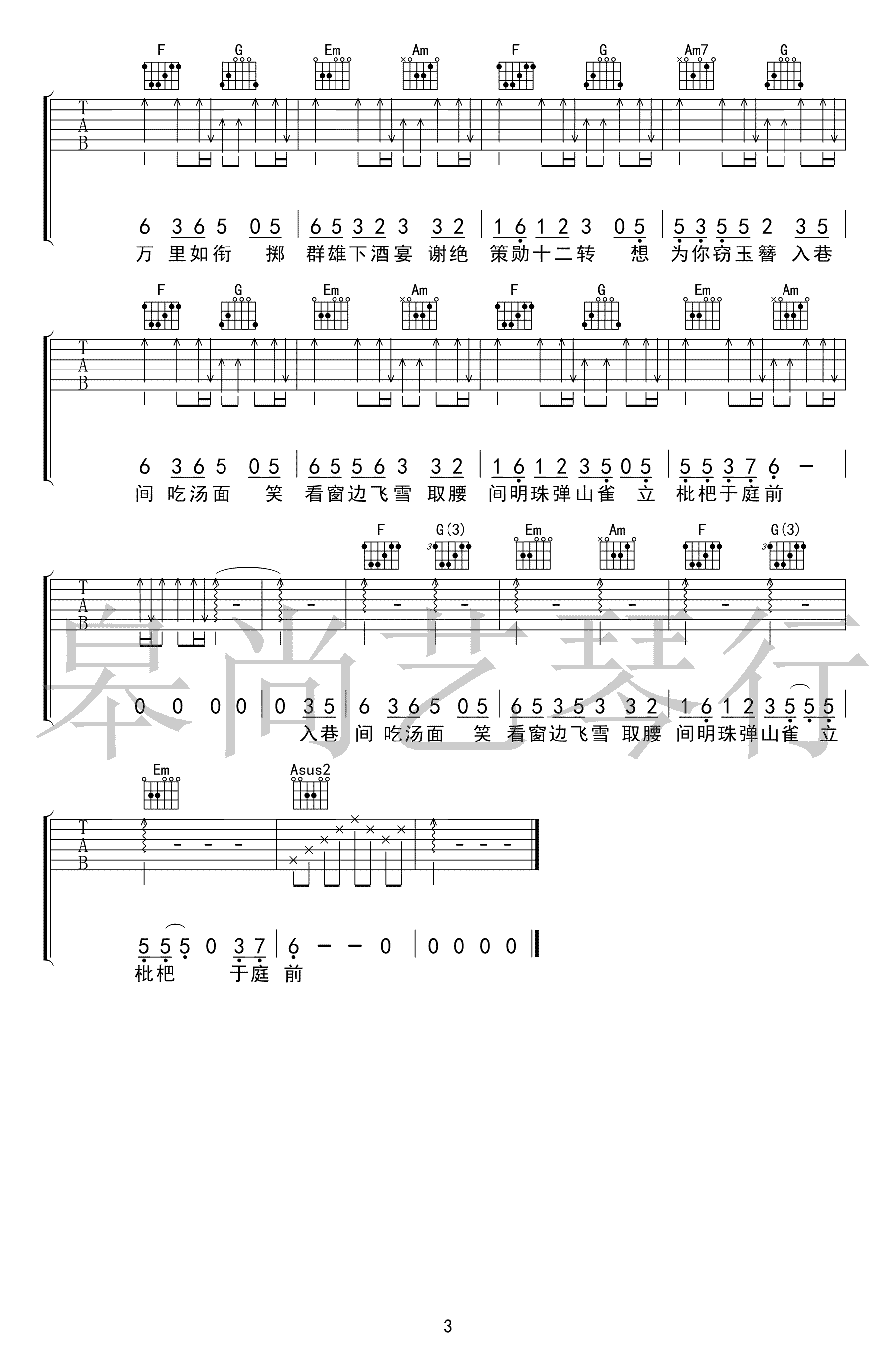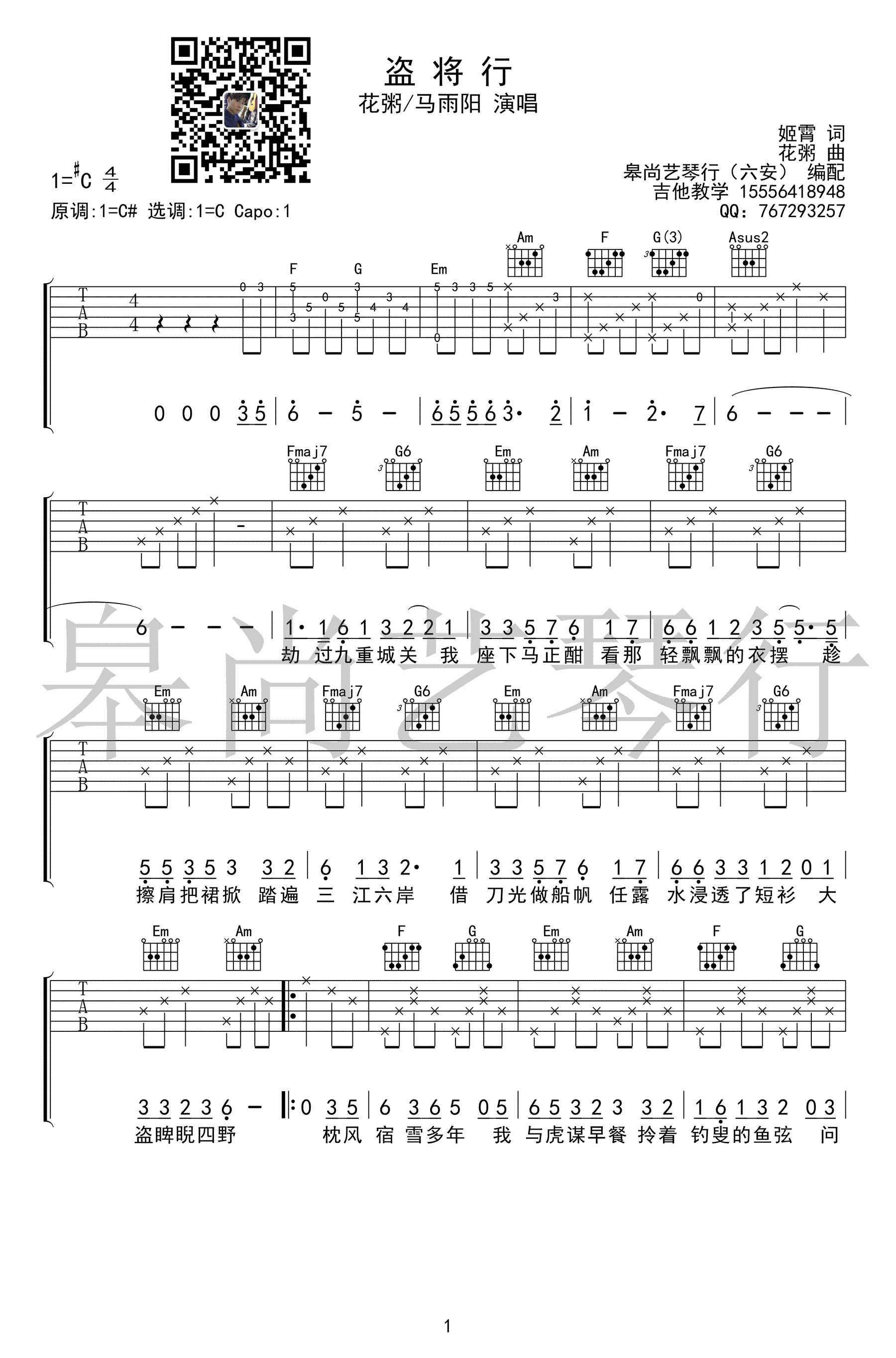 花粥马雨阳《盗将行》吉他谱,原调#C,变调夹夹一品,选用C的指法,盗将行六线谱,高清弹唱图片谱,皋尚艺琴行编配出品,吉他吧网站上传。 你的笑像一条恶犬,撞乱我心弦,无论是流氓歌、小清新,还是这种新出的古风, 这些调侃的风格,歌词的态度,懒洋洋的调调, 从来都让真正喜欢花粥的听众欲罢不能。