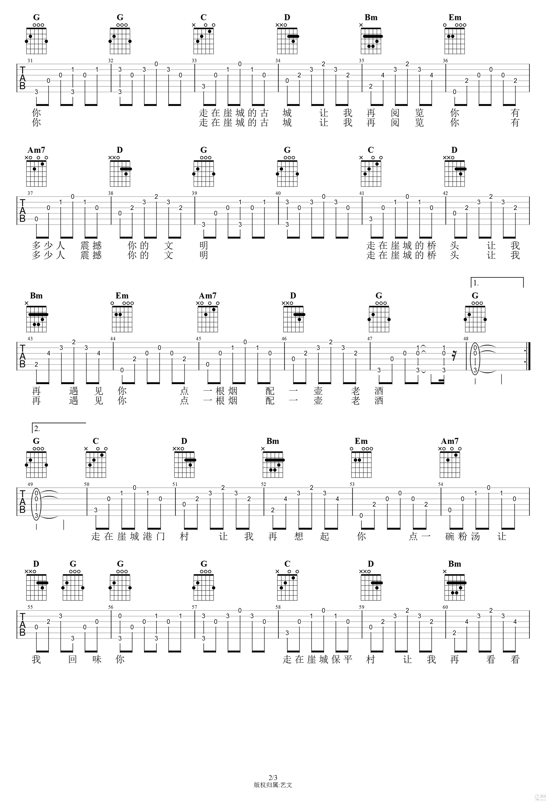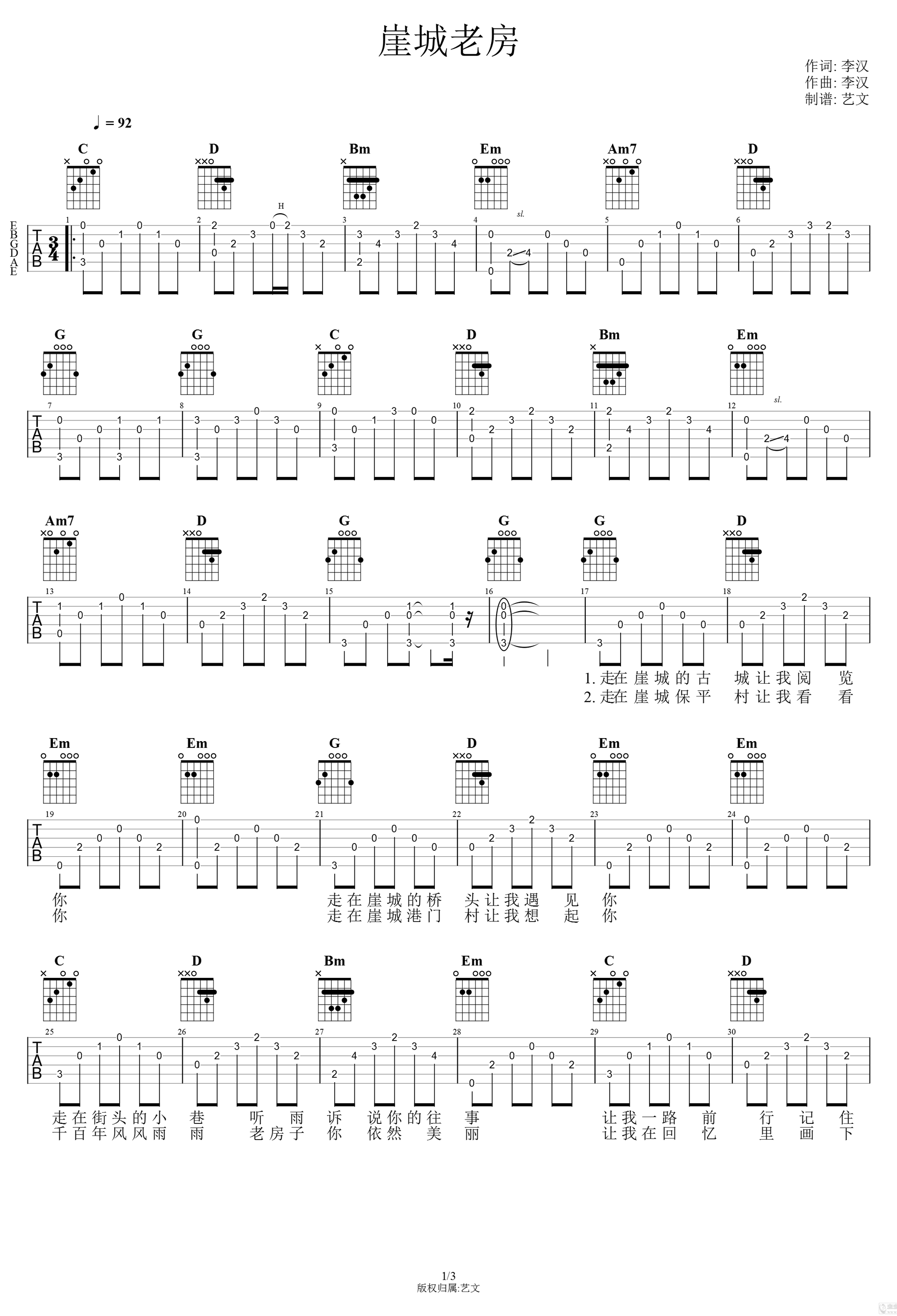 崖城老房吉他谱,崖州小伙子李汉创作记录家乡的一首歌曲,一把吉他和充满磁性的嗓音,既纯粹又充满感情,《崖城老房》吉他弹唱谱,高清图片谱,感谢艺文编配,吉他吧上传。 一曲民谣饱含着对家乡热忱的爱,悦耳动听的歌声把家乡厚重的历史诠释得淋漓尽致。静静地聆听,眼前仿佛出现了老房美景,耳畔仿佛响起不远处渔船的马达声。的确,在历史与现代的交融下,一首原汁原味的民俗歌曲才更能品出家乡的韵味,让我们一起陶醉在“崖州老房”的歌声里,漫步在美丽的崖州街道上!