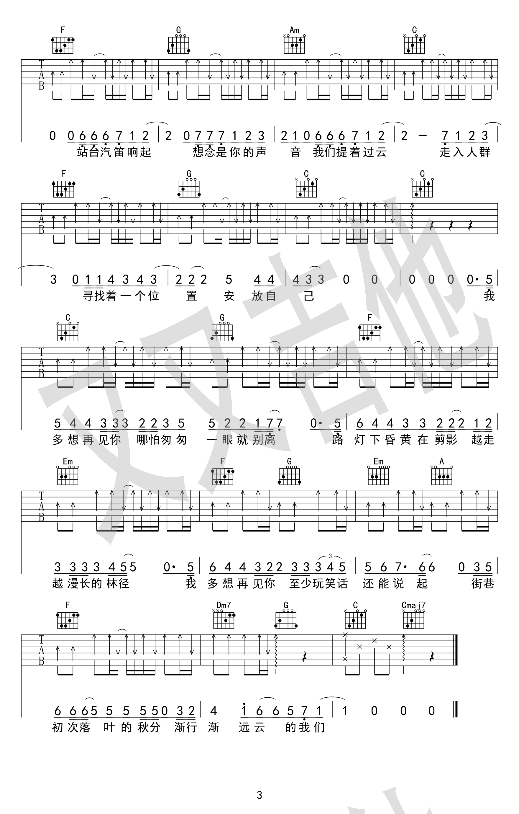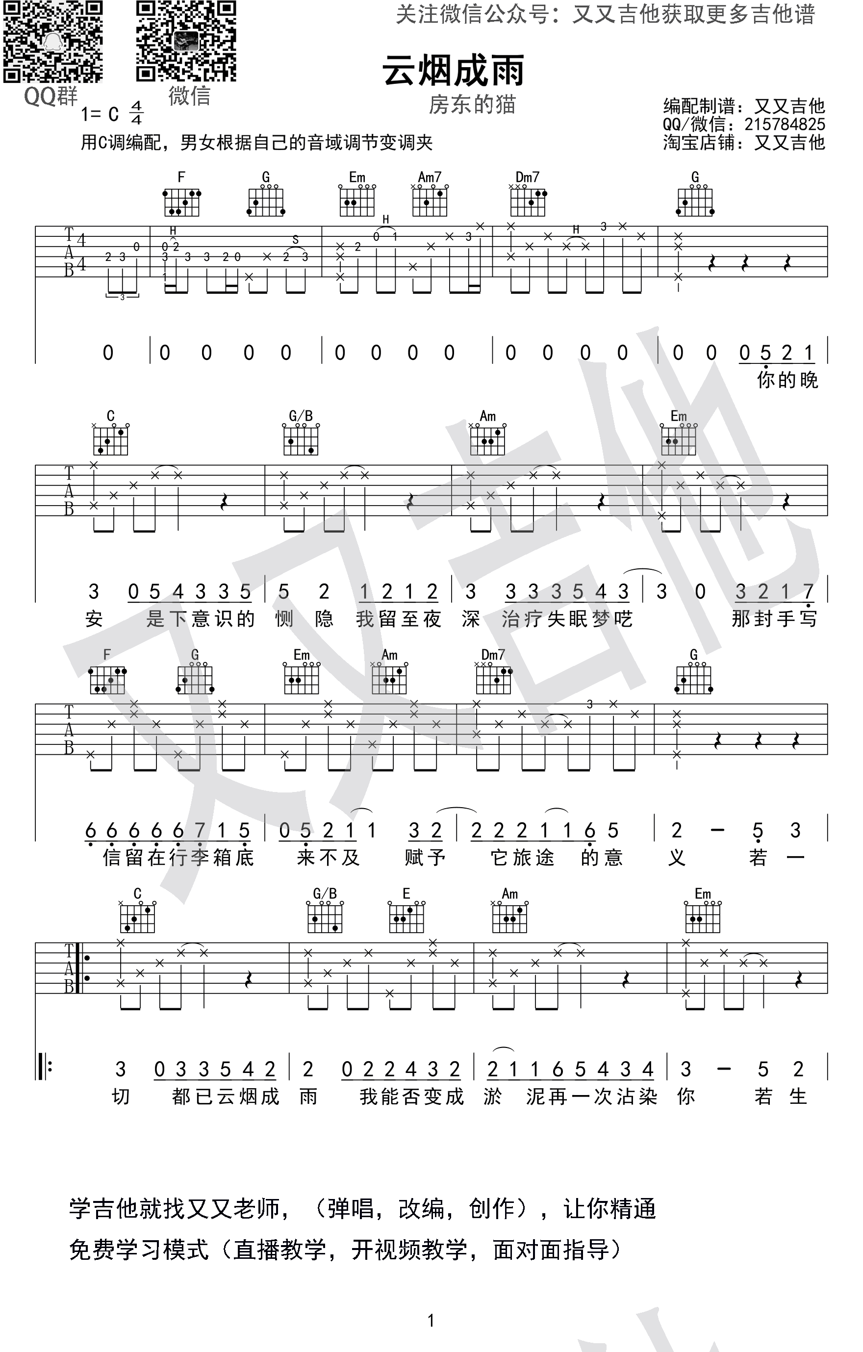 《云烟成雨》吉他谱,选C调编配制作,男女根据自己音域适当夹变调夹,房东的猫演唱,一首让人原本思绪凌乱的心平复下来的民谣歌曲,云烟成雨六线谱,三张图片谱,又又吉他编配出品,吉他吧上传。 主唱小黑干净的嗓音,赋予了这首歌一种特别的感觉,犹如一池飞雁游过天空般安静美好,亦有种失落惆怅不断延续。