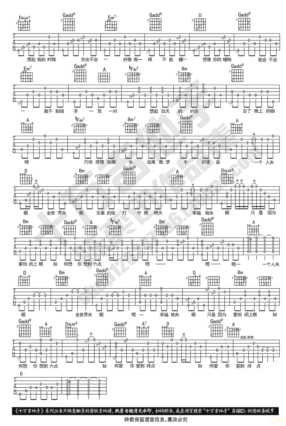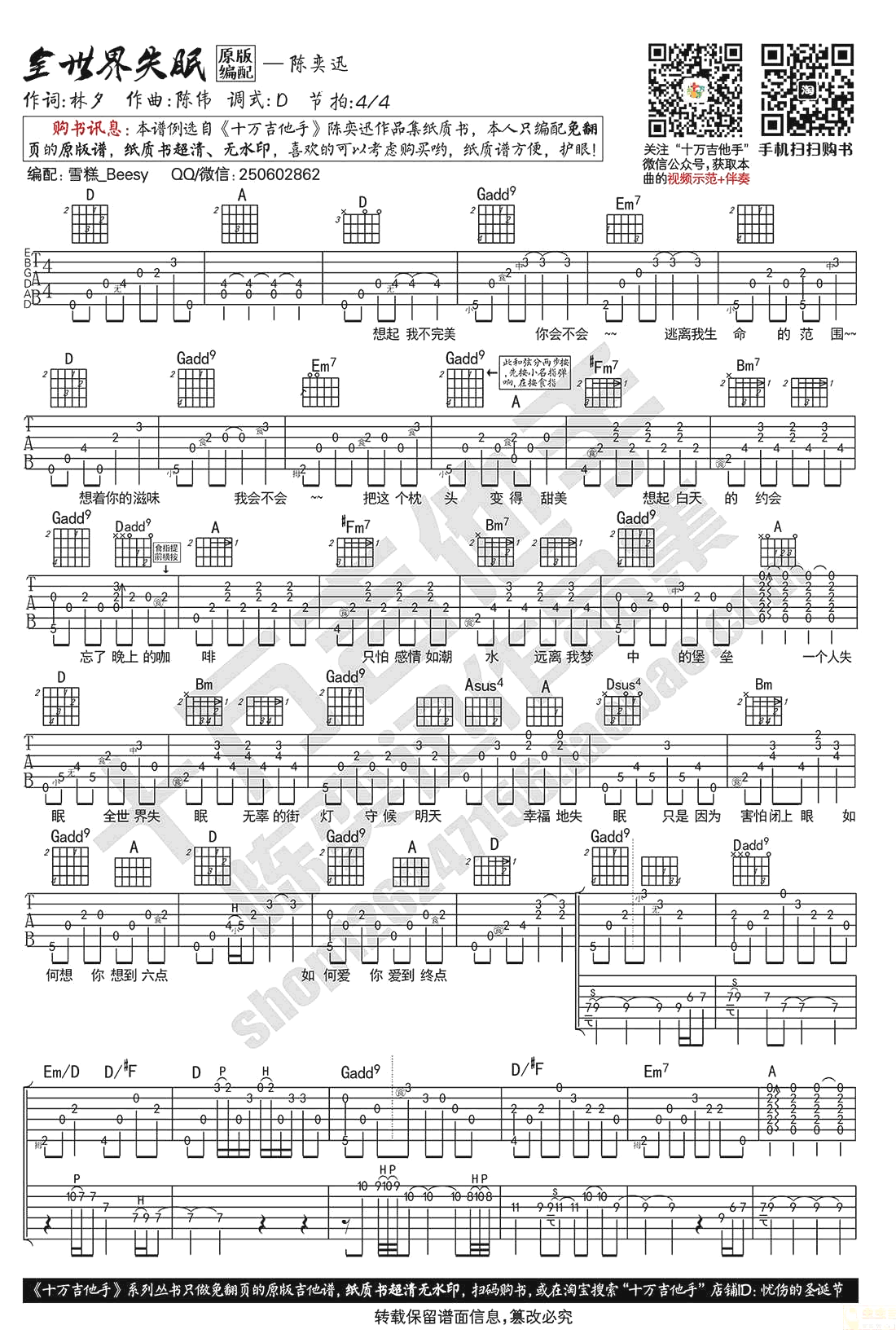 陈奕迅《全世界失眠》吉他谱,D调原版编配,弹奏说明:本曲需要第⑥弦降全音调弦。全世界失眠六线谱,十万吉他手出品,吉他吧网站上传分享。“一个人失眠,全世界失眠”,一字一句轻轻地吟唱出对心中某个人的爱,林夕填词陈伟谱曲的歌配上Eason的嗓音,让整个夜晚都点亮。“幸福地失眠,只是因为害怕闭上眼。如何想你想到六点,如何爱你爱到终点。”那么多的日日夜夜,是否有那么一个人让你的全世界失眠。