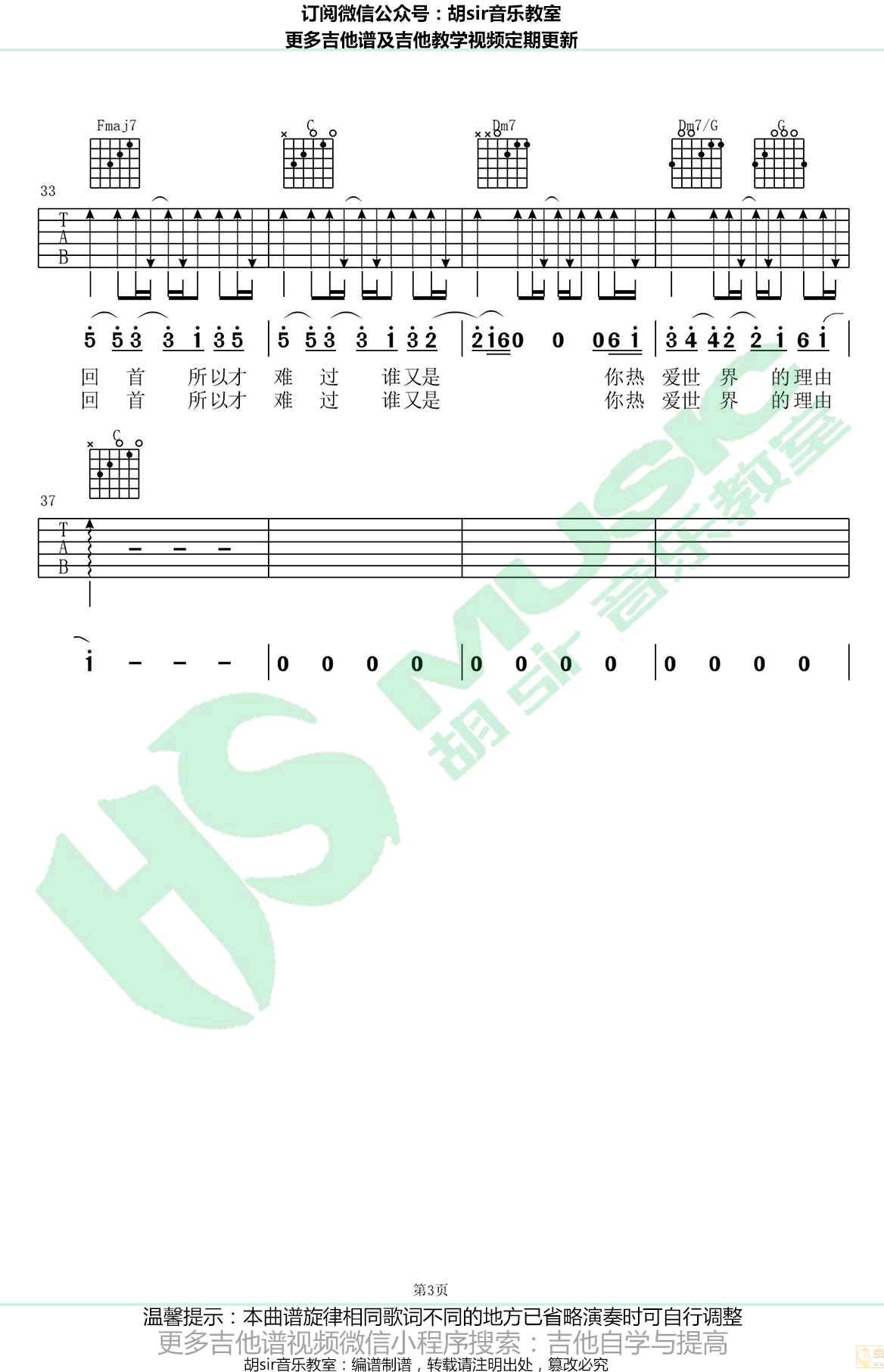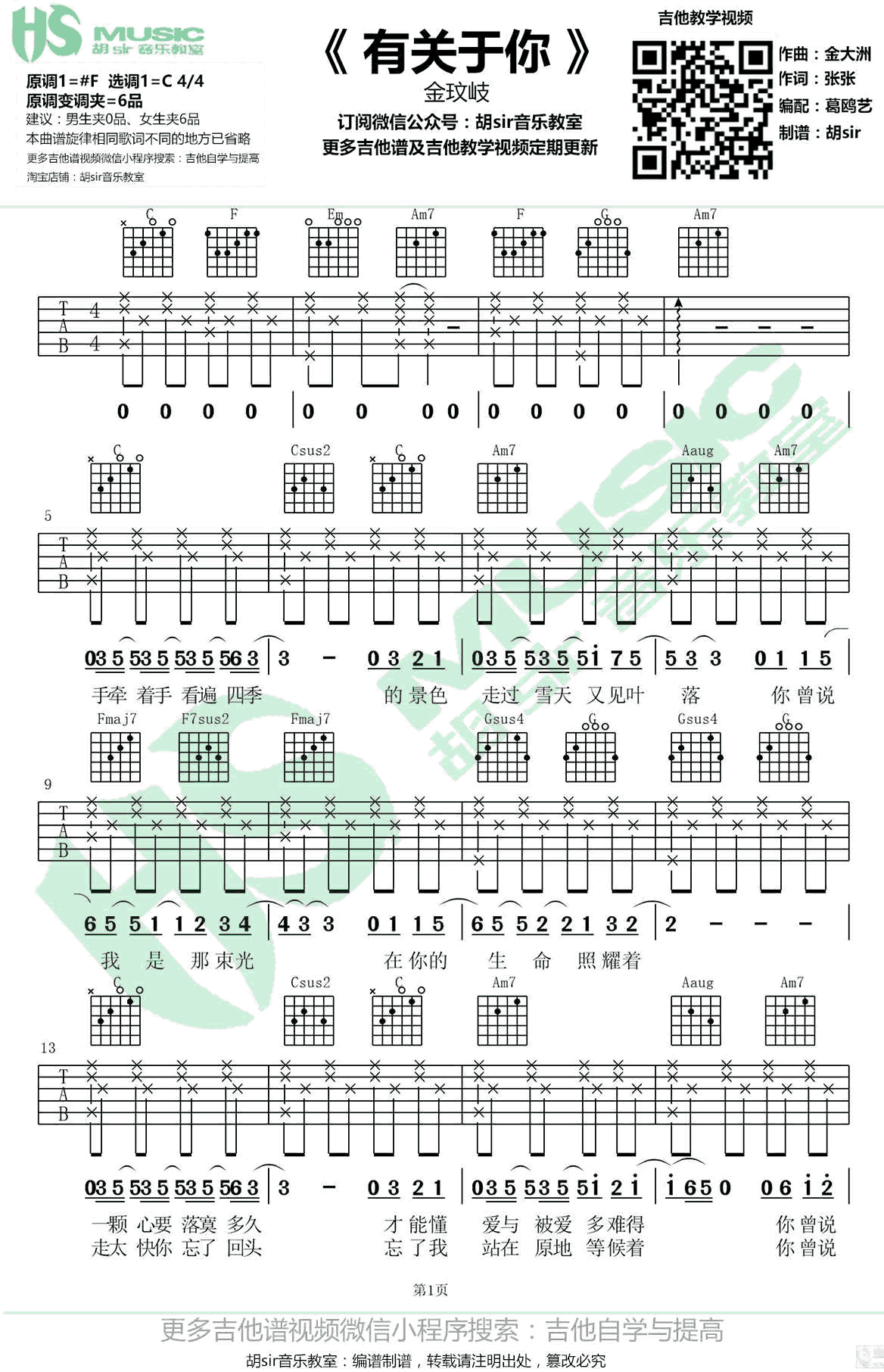金玟岐《有关于你》吉他谱,原调#F,选调C,原调变调夹夹六品,音乐创作才女金玟岐献唱电视剧《为了你我愿意热爱整个世界》插曲,有关于你六线谱,三张图片谱,胡sir音乐教室编配出品,吉他吧网站上传推荐。 一首词曲温暖又充满力量的歌曲,简单自然娓娓道来,唱出对过往和未来的坦然与期待、触动每一个倔强又柔情的灵魂。