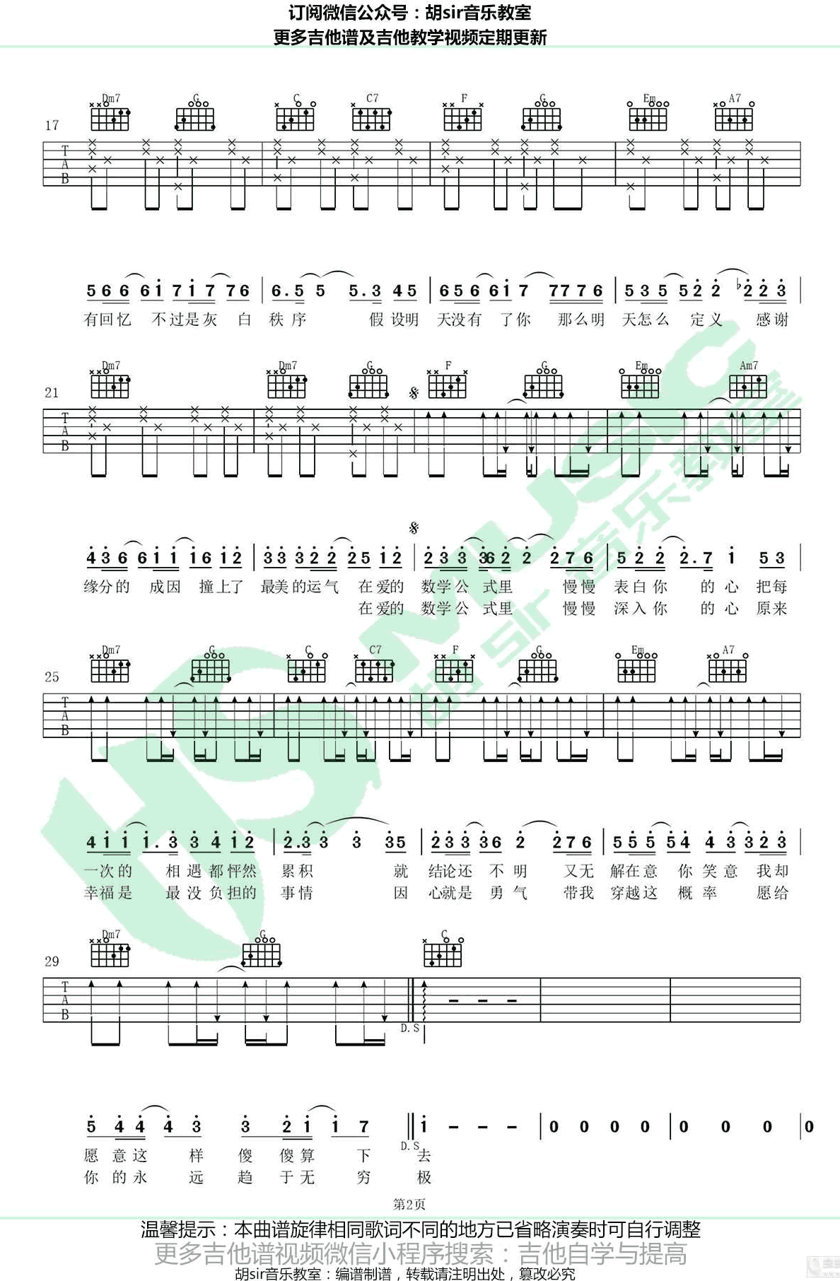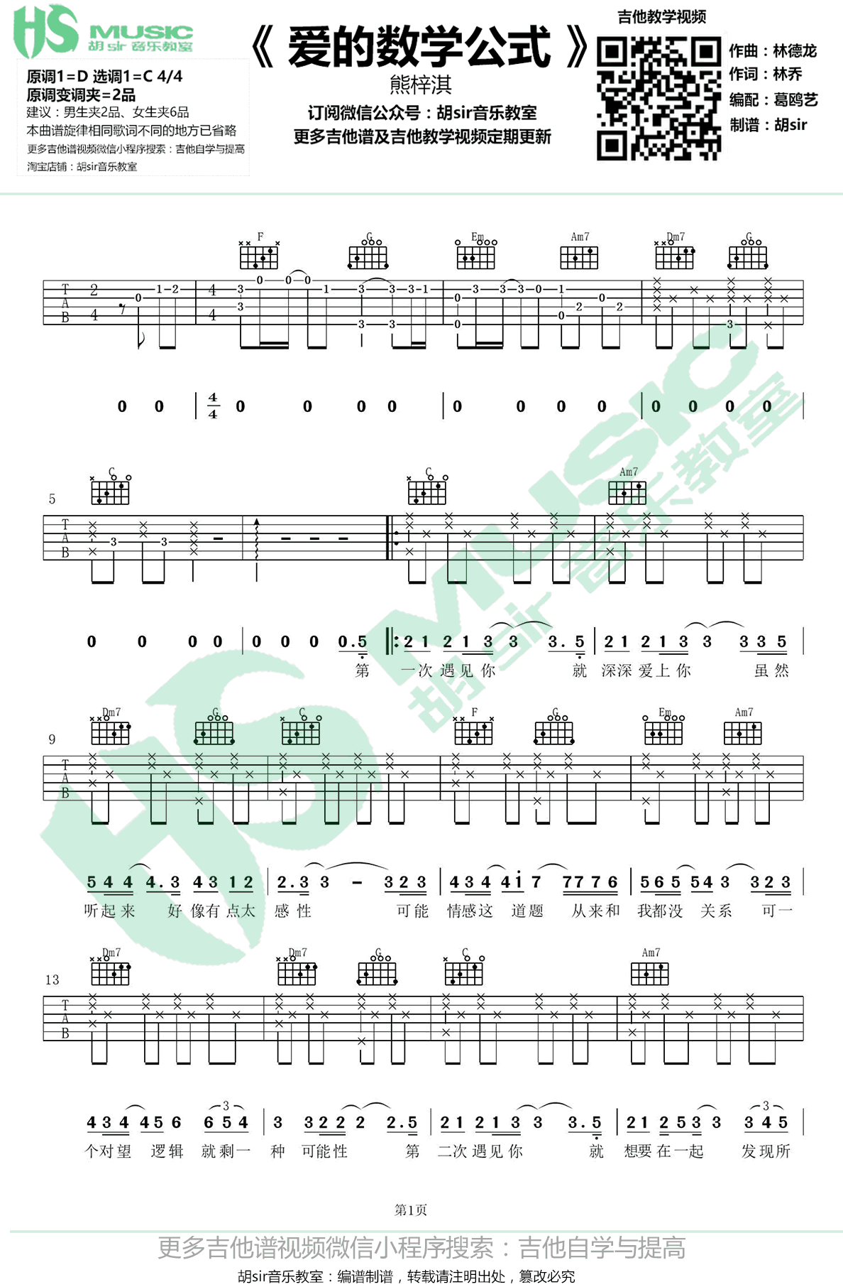 熊梓淇《爱的数学公式》吉他谱,原调D,选调C,原调变调夹夹第二品,女生建议夹六品,爱的数学公式六线谱,网络青春校园剧《我和两个他》主题曲,胡sir音乐工作室出品,欢迎琴友们扫描关注,一起学习吉他吧。 每一个数学公式,都是爱的符号,悦耳的琴声缓缓流动,温柔中带着些许的青涩,一首暖心的歌曲,饱含真挚的情感,让歌声变得更加坚定有力。
