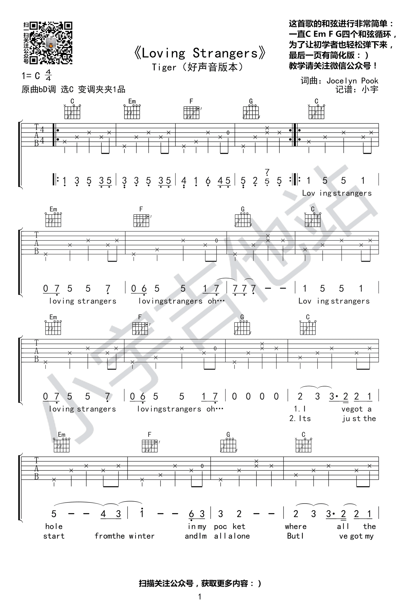 《Loving Strangers》吉他谱,Tiger谭秋娟演唱,最新开播的《中国好声音》版本。《Loving Strangers》爱上了陌生人六线谱,原曲bD调,选用C调指法编配,变调夹夹一品,感谢小宇吉他站出品。 一首好听的英文歌曲,悠悠的歌声,像一条缓缓流淌的小河,清澈,久远,最后流进听众的心海。这首歌的和弦进行非常简单,一直C、EM、F、G四个和弦循环,为了让初学者也能轻松弹下来,最后一页有简化版。