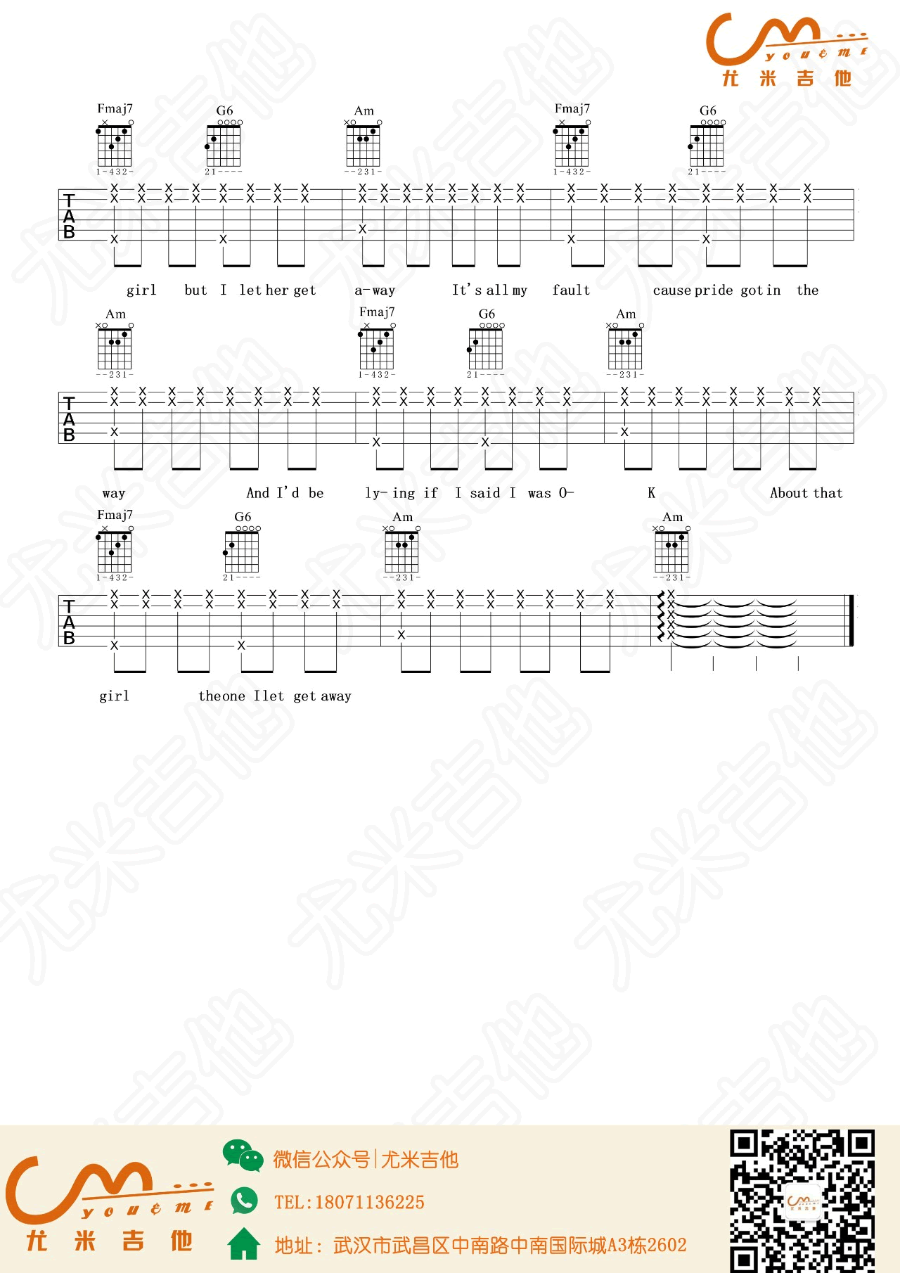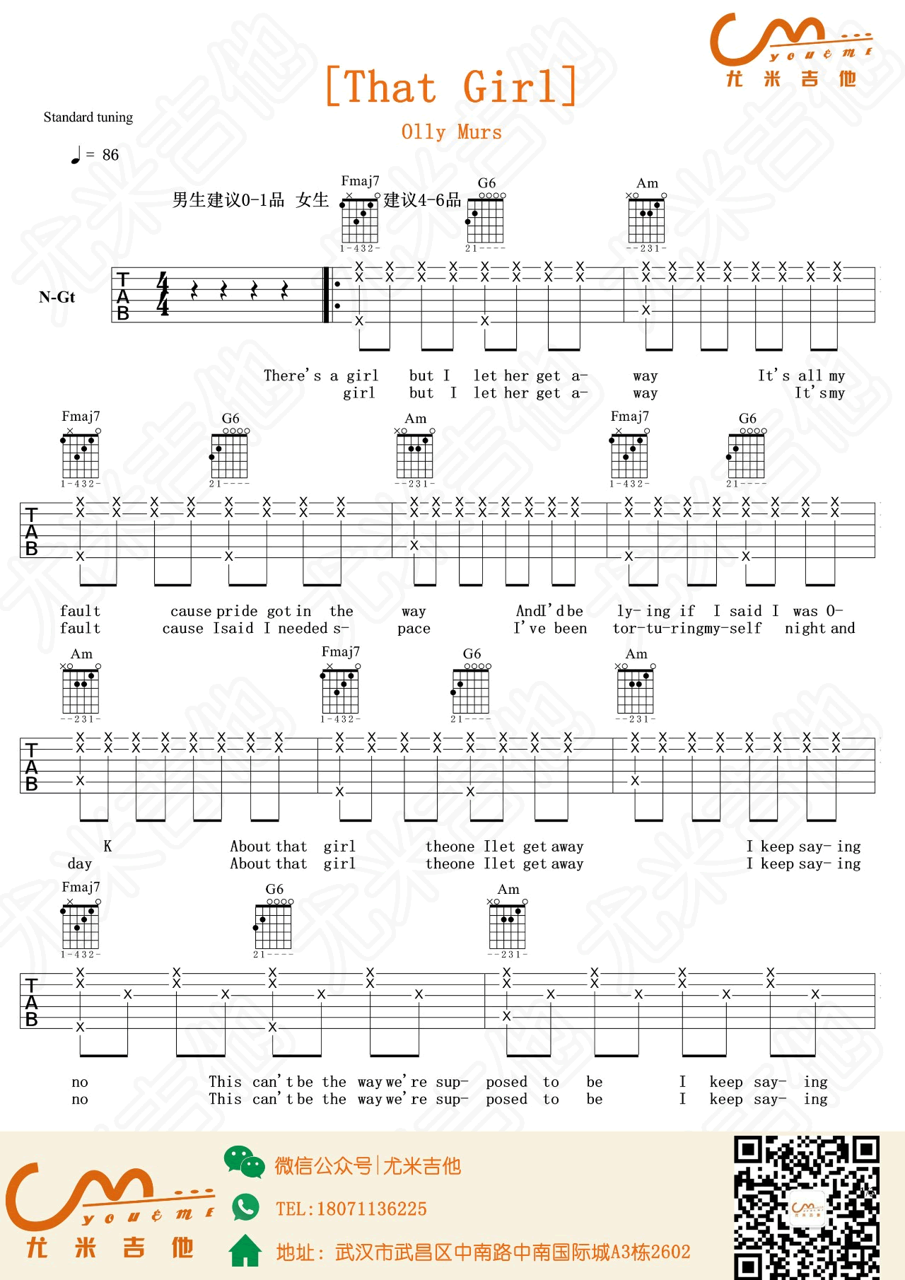 That Girl吉他谱,这首英文歌曲是由Olly Murs(奥利·莫尔斯)原唱,国内一位初三学生在讲台上演唱的视频让该歌走红网络。That Girl吉他弹唱谱,变调夹建议男生0-1品,女生4-6品,高清图片六线谱由尤米吉他编配出品,欢迎琴友们关注。随谱附上许老师给大家带来的《That Girl》吉他弹唱视频,喜欢这首歌曲的琴友们参照曲谱和演示练习起来吧。