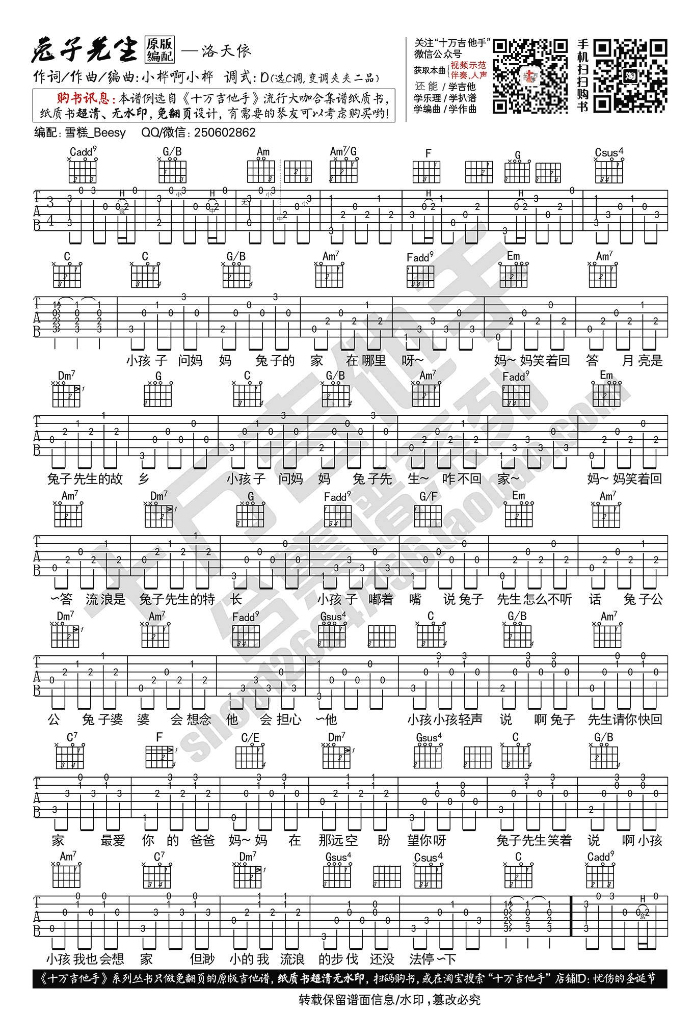 洛天依《兔子先生》吉他谱,原调D,选用C调指法编配,变调夹夹二品。一首民谣风格的童谣,适合睡前安静聆听的摇篮曲。兔子先生六线谱,吉他弹唱图片谱,十万吉他手出品。歌曲以兔子先生和小孩的对话展开,将很多难言的情愫融入在歌里,用最简单的歌词和动听调旋律,表达了兔子先生的思家情绪。为方便琴友们练习,随谱附上雪糕老师和芽儿妹子带给大家的配套吉他弹唱演示。