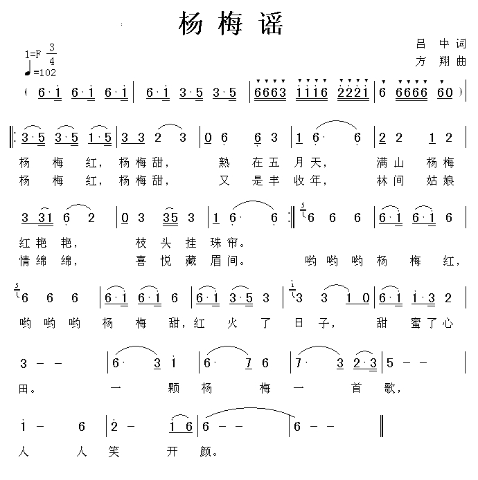 杨梅谣简谱-吕中词 方翔曲
