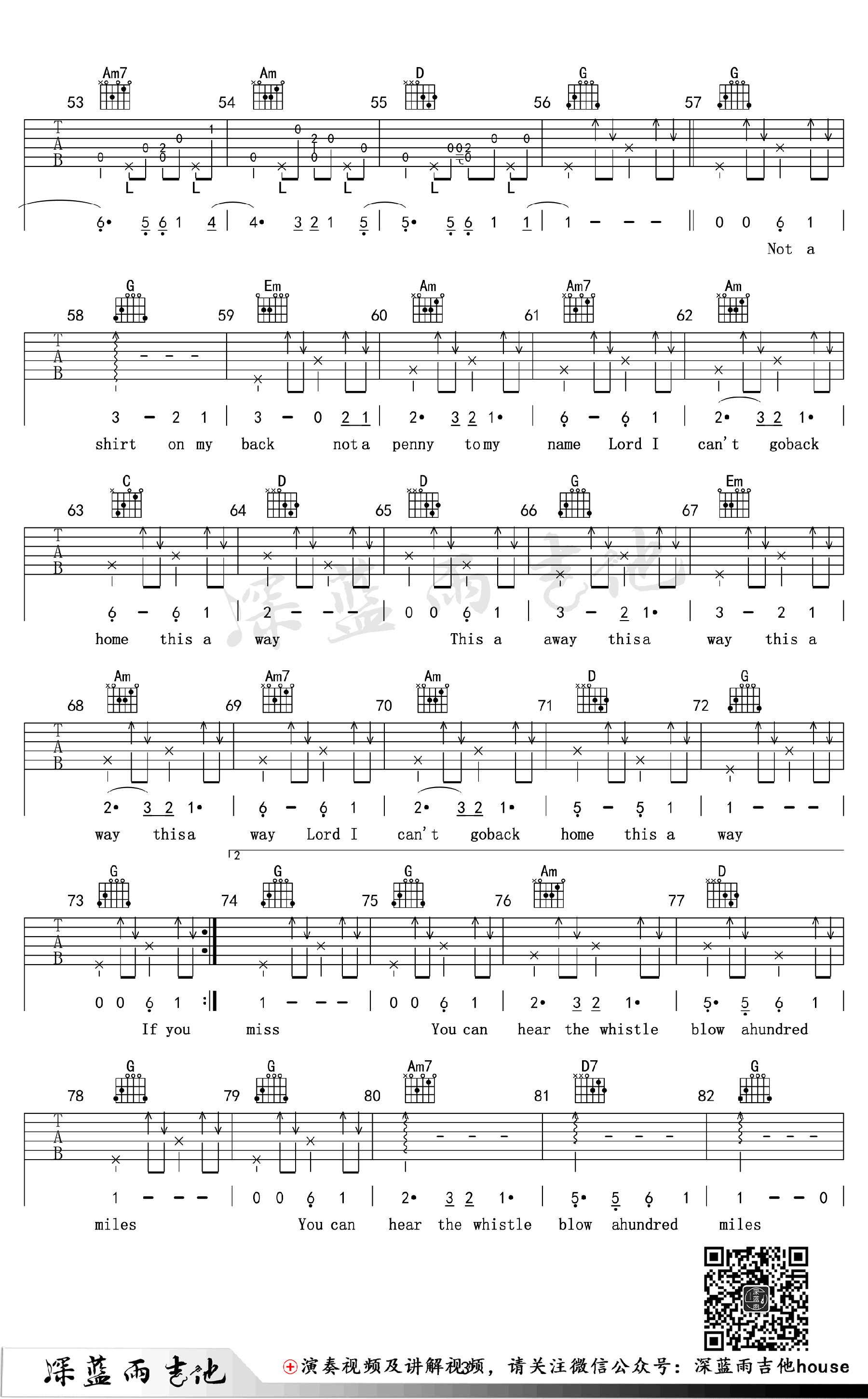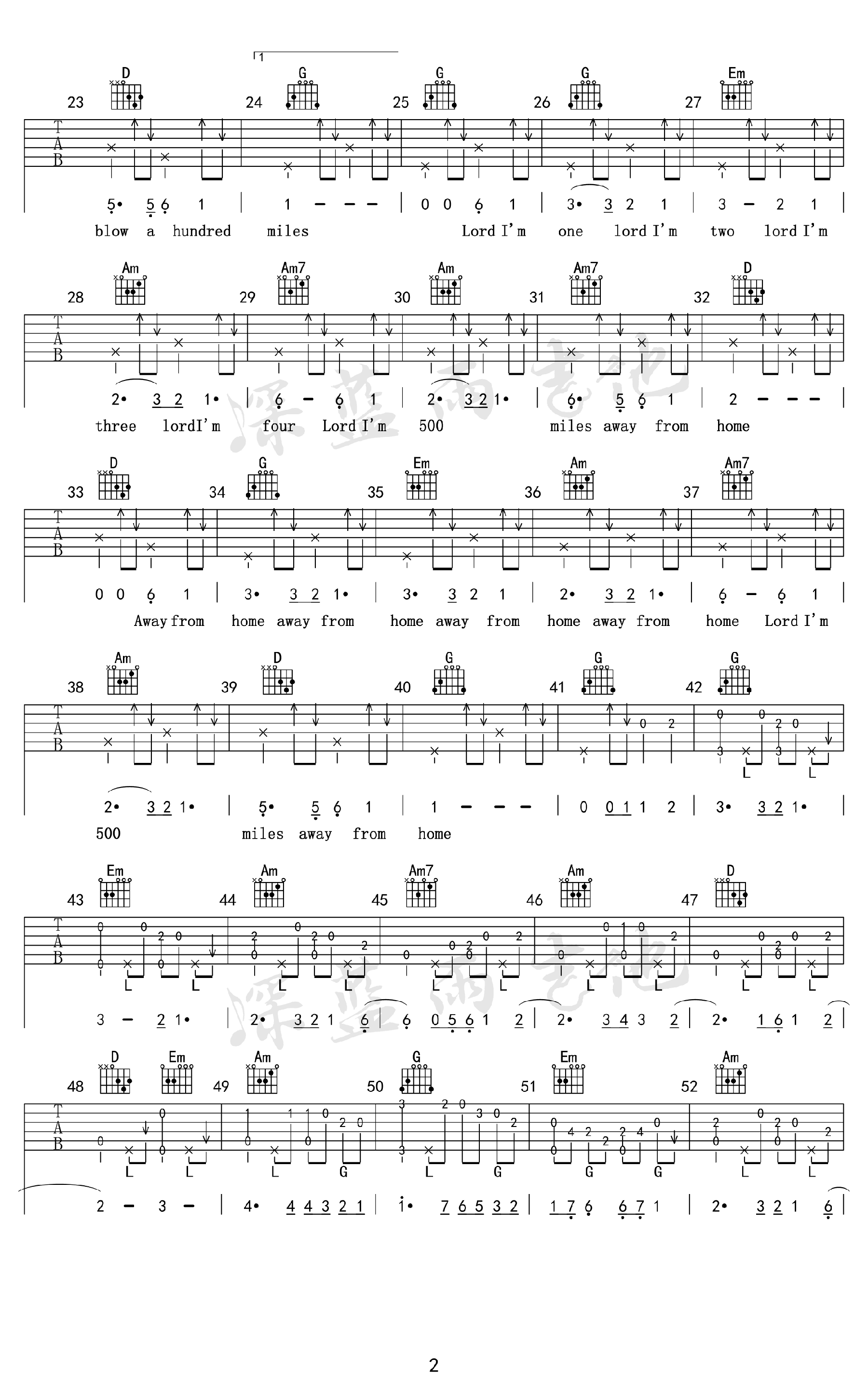 500miles吉他谱,一首经典英文民谣歌曲,改编为G调指法,500miles六线谱,高清弹唱图片谱,深蓝雨吉他编配出品,吉他吧网站上传分享。随谱附上吉他弹唱教学视频,琴友们跟随老师的示范讲解练习。循环过无数次的一首民谣《Five Hundred Miles》,有些离别一旦开始,便是永远,旋律写着流浪,歌词写着忧伤,听着就像走在旅行的路上,相信每个漂泊在外的人听完后都会有所触动!