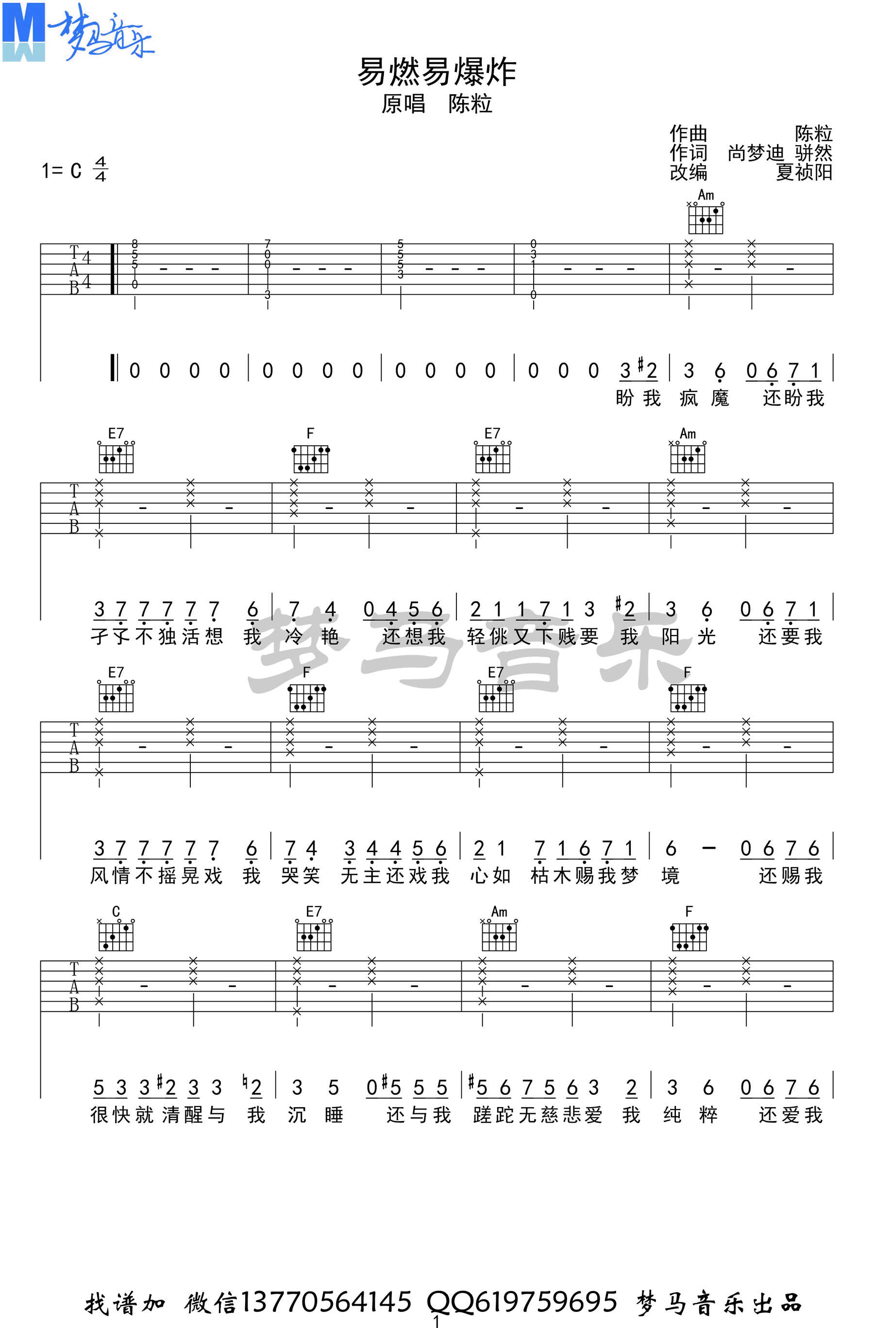 《易燃易爆炸》吉他譜,陈粒的一首原创民谣代表歌曲,选用C调指法编配,附配套吉他弹唱演示视频,易燃易爆炸六线谱,完整版共四张高清图片谱。感谢梦马音乐出品,吉他吧网站上传分享。夏祯阳老师编配说要点讲解:这首歌也是在弹方面很简单,在唱上面很难的一首歌。主要就是换气,根本来不及换。没有了足够的气息的支持,歌曲自然就唱不好了。所以大家在唱的时候要结合自身的特点找到自己的换气点。