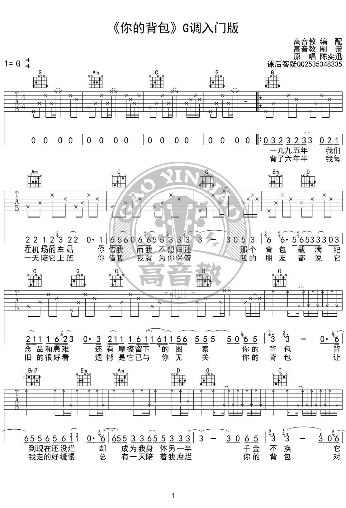 《你的背包》吉他谱,G调指法入门版编配,陈奕迅演唱的经典歌曲,你的背包六线谱,两张图片谱,感谢高音教出品,吉他吧上传分享。 这世间,哪有什么心甘情愿地陪伴,只不过是还爱着你罢了。但愿在美好的年华里,我们都曾有个不愿归还的背包。