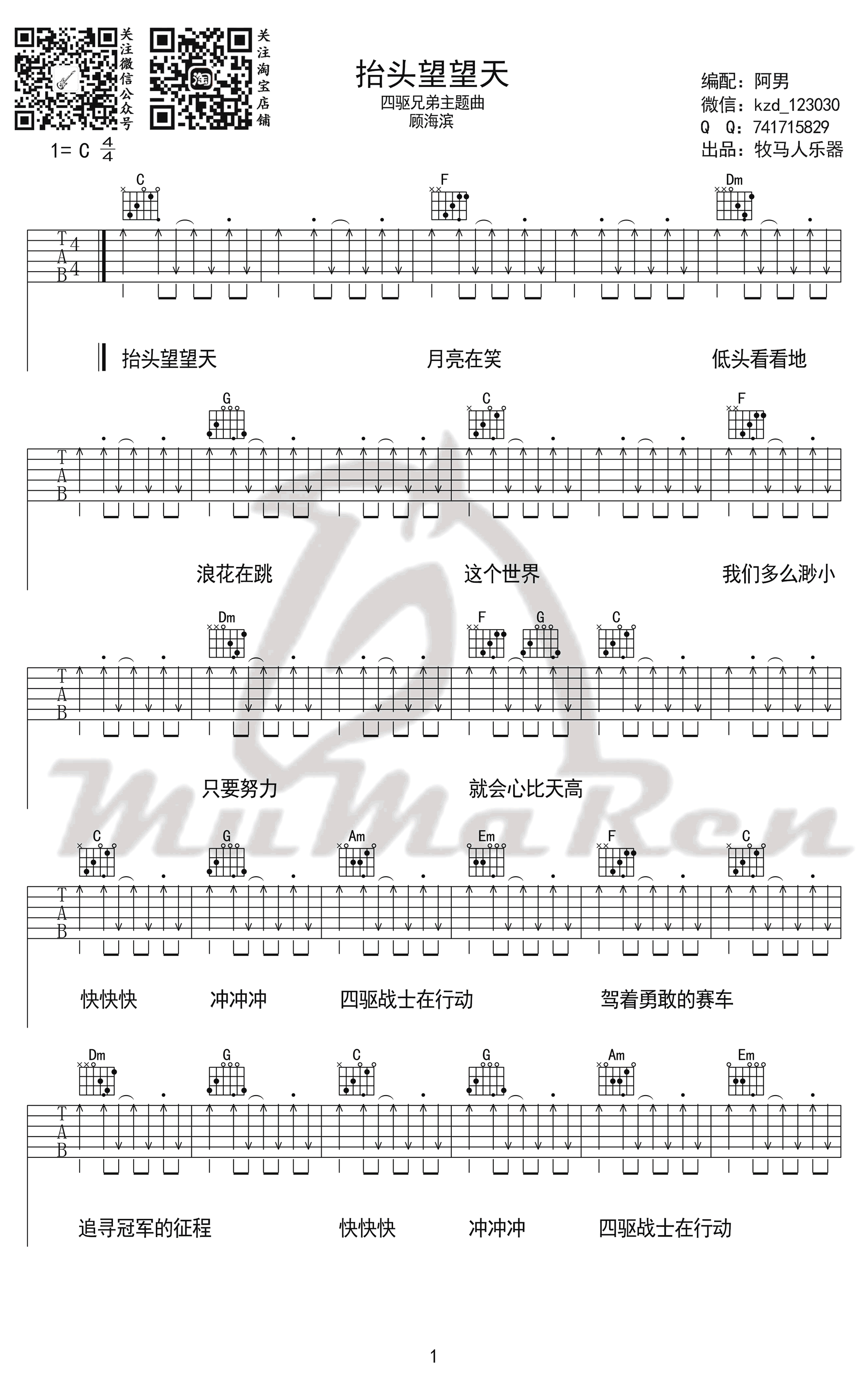 《抬头望望天》吉他谱,顾海滨演唱,动画《四驱兄弟》的中文主题曲。抬头望望天六线谱,C调指法弹唱谱,感谢牧马人乐器出品,阿男老师编配柔情的版本,吉他吧网站上传。 相信在每个人心里都有独属于自己的那份童年回忆,一首耳熟能详的动画片主题曲,点燃观众的烈烈豪情。