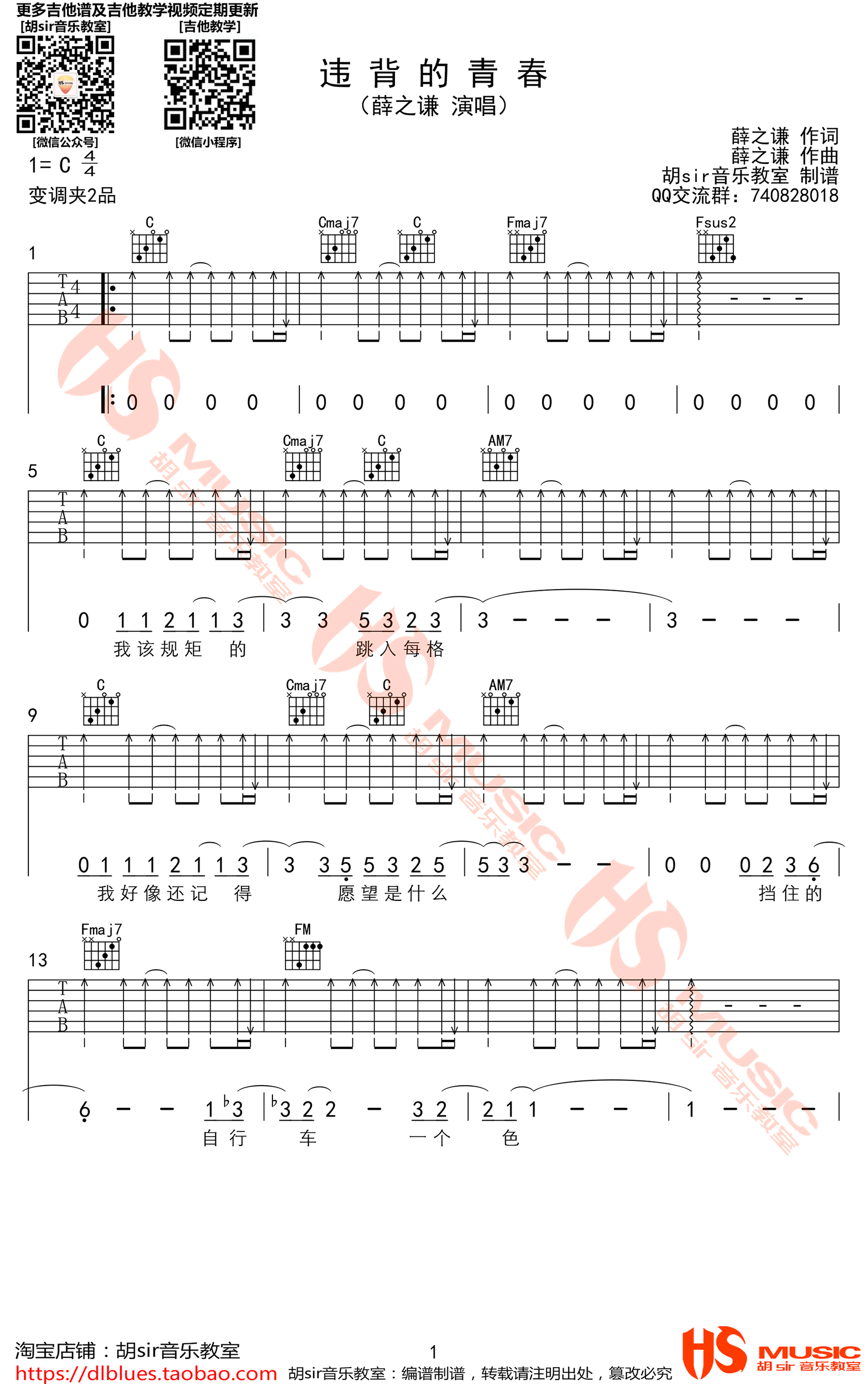 《违背的青春》吉他谱,薛之谦演唱的新歌,C调指法编配,变调夹夹二品。违背的青春吉他弹唱谱,六线谱图片格式三张谱例,感谢胡Sir音乐教室出品,吉他吧网站上传分享。 青春是美好的,每个人经历的都不一样。想要无悔很少是如自己所愿,大部分都是事与愿违,然而却正是如此,给自己的人生留下了精彩而又美妙的回忆。一首献给追梦路上还在坚持奋斗人的歌。
