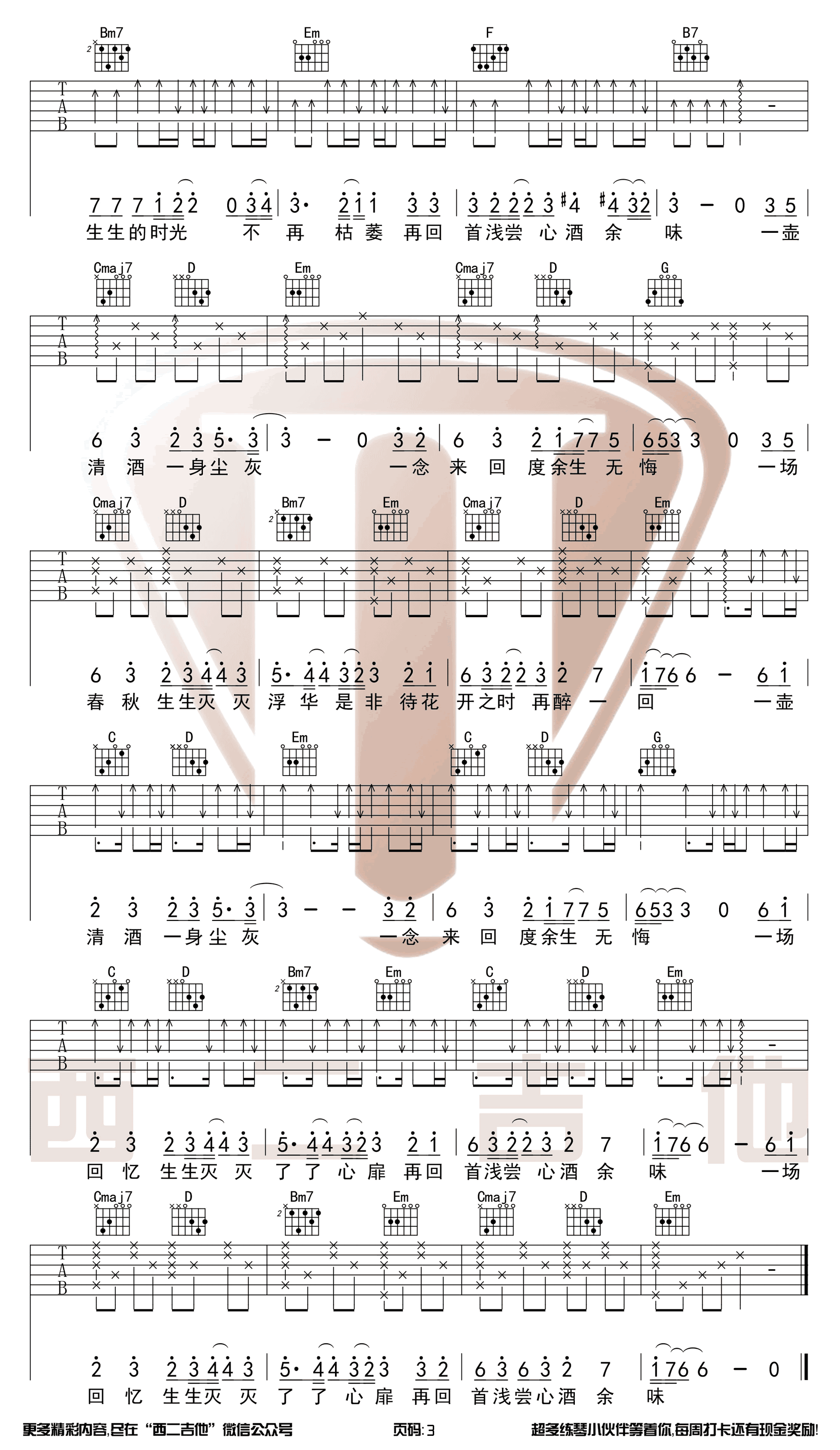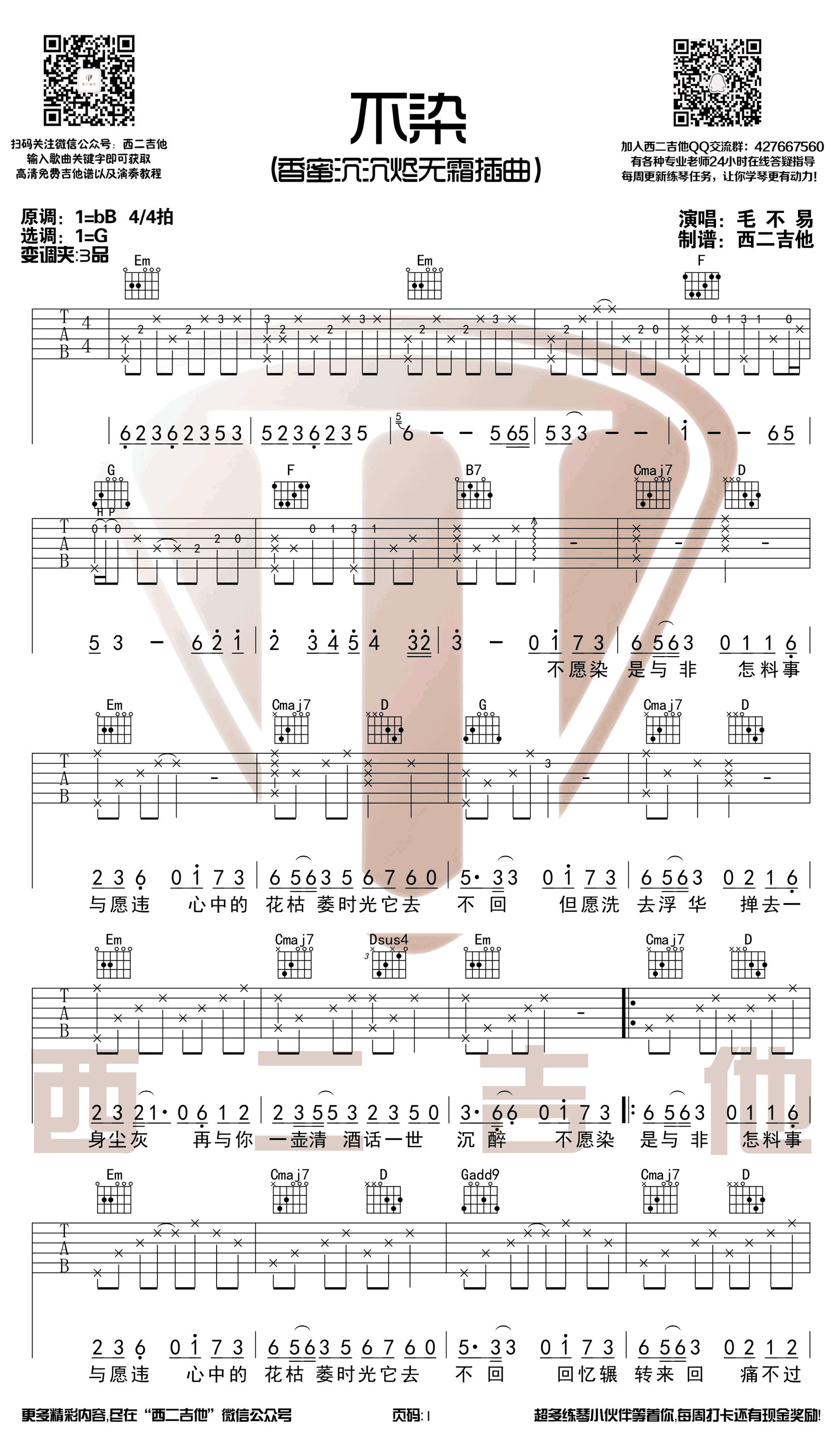 毛不易《不染》吉他谱,电视剧《香蜜沉沉烬无霜》主题曲,原调降B,选调G,变调夹夹三品,不染六线谱,高清弹唱图片谱,西二吉他编配出品,吉他吧网站上传。 古风韵味的歌词搭配丝丝入扣的旋律,毛不易醇厚沧桑的歌声,诠释着人生的爱别离和放不下。过往云烟散,一切皆空,但愿历经万千磨难,洗去浮华,掸去一身尘灰,不理这是是非非,再与你一壶清酒,话一世沉醉。