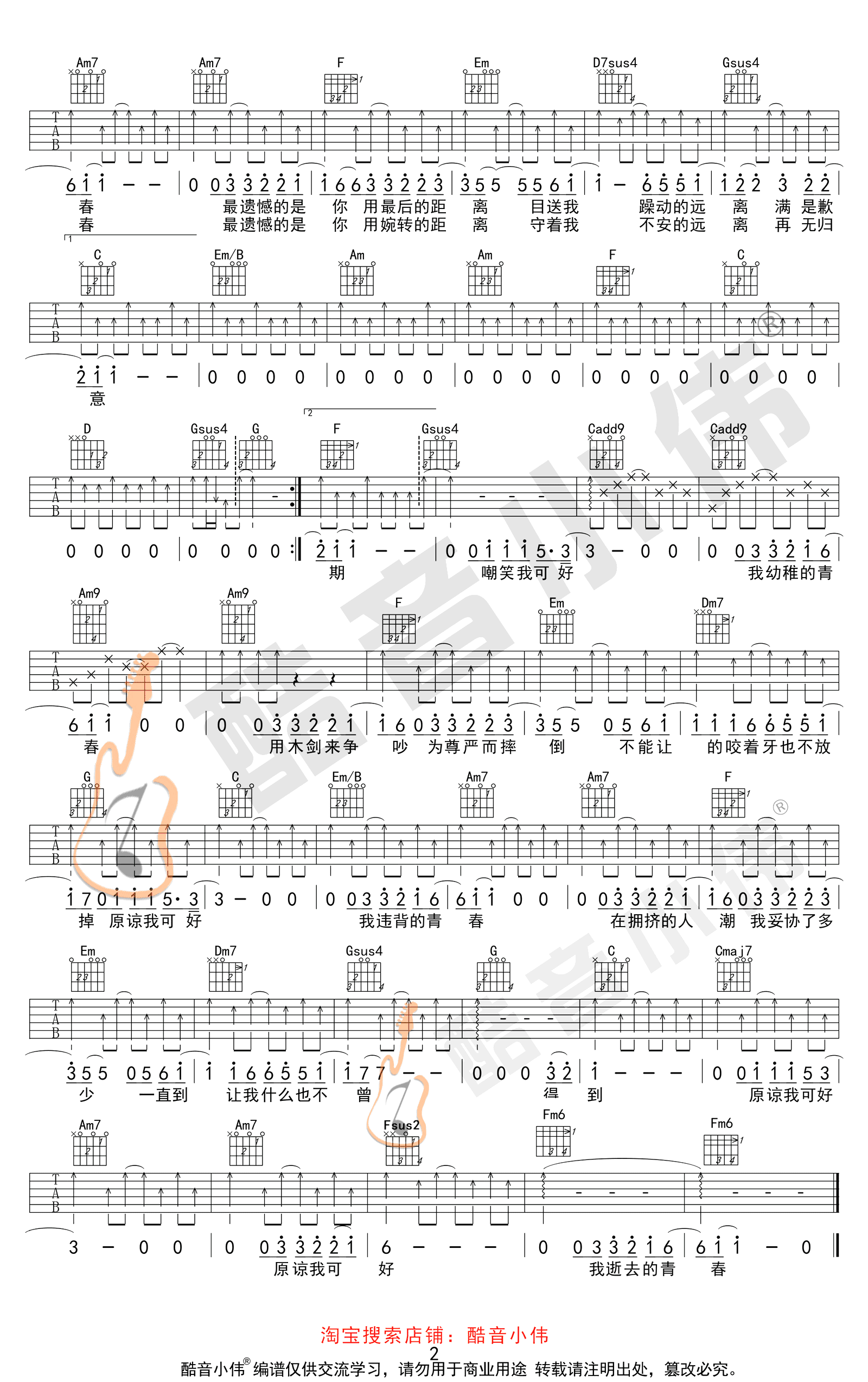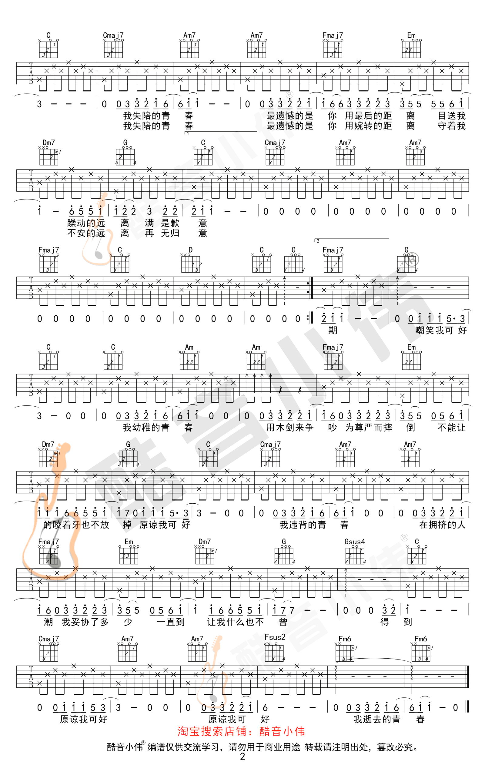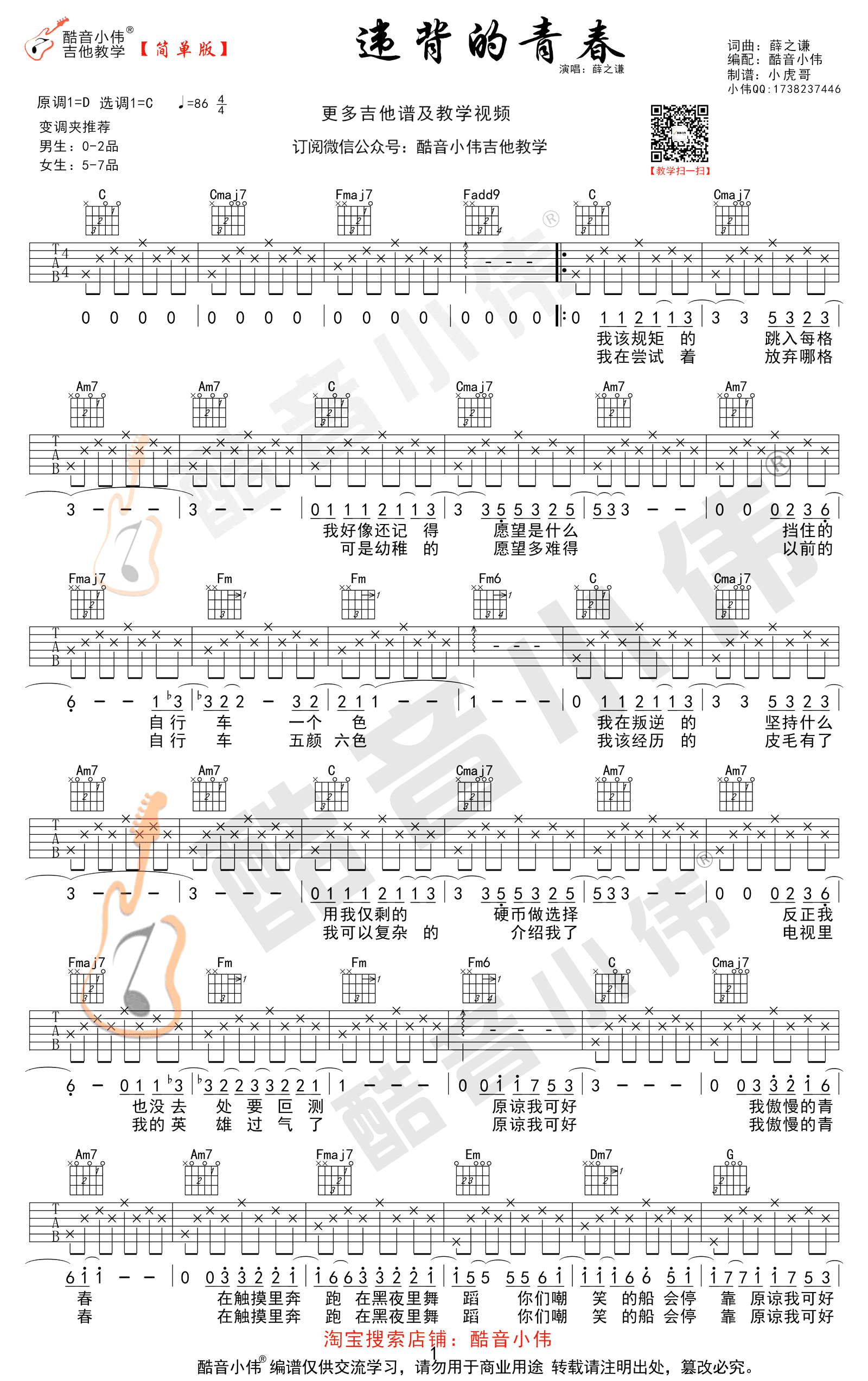 薛之谦《违背的青春》吉他谱,C调简单版+C调中级版编配,变调夹推荐参看图片谱标注。感谢酷音小伟出品,吉他吧网站推荐分享。随谱附上《违背的青春》吉他弹唱教学随谱,琴友们跟随小伟老师的讲解示范练习。怀揣梦想在人生的路途一路追寻,跌落低谷也曾四顾茫然,在困境中努力坚持,不忘初心绽放青春的姿态。