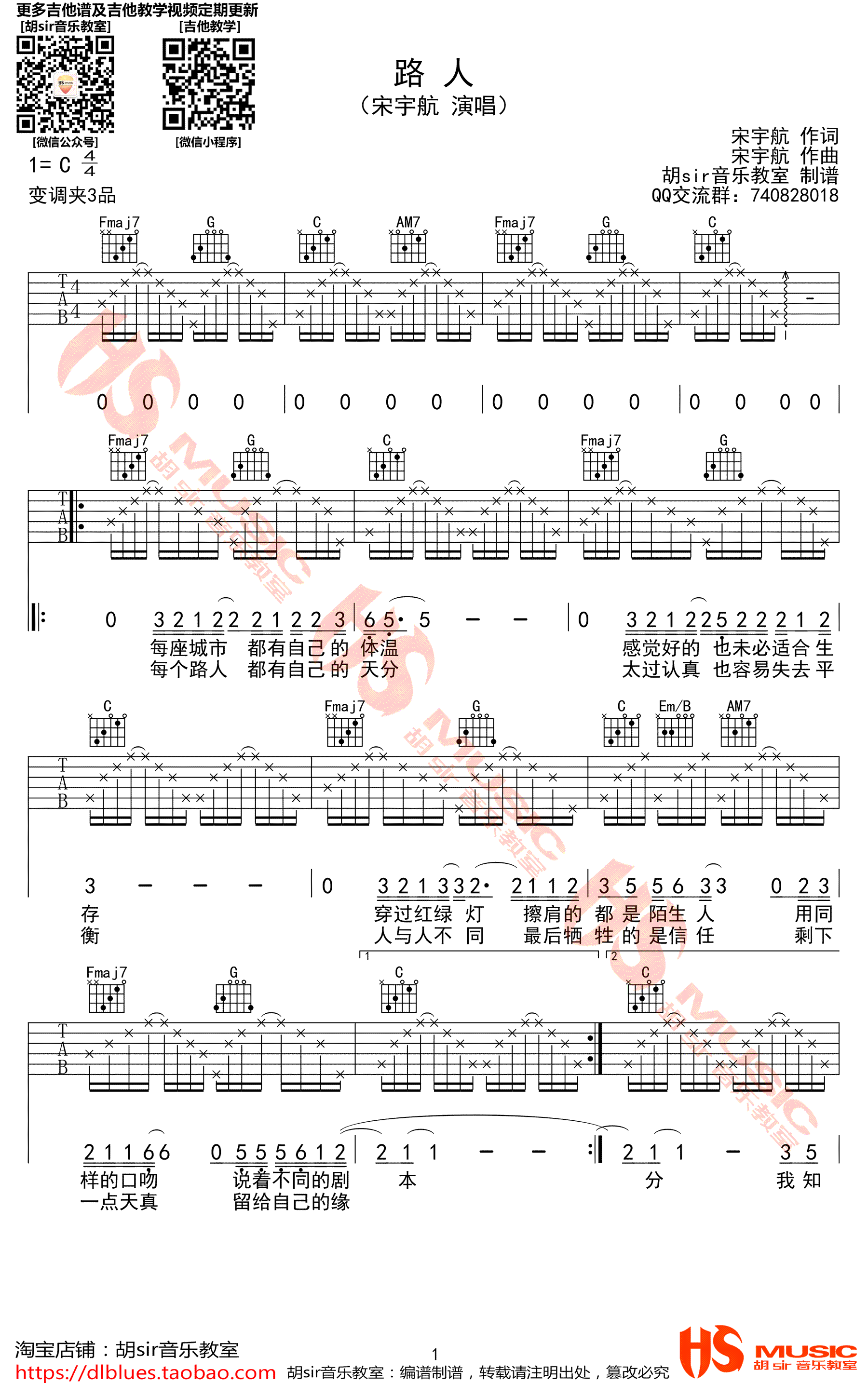 《路人》吉他谱,90后音乐唱作人宋宇航的一首代表歌曲,路人六线谱,C调弹唱谱,变调夹夹三品,高清图片谱,感谢胡sir音乐工作室出品,吉他吧网站推荐上传。 这首歌曲收录在宋宇航首张专辑《空想》中的。像是一本记录了自己生活的日记,诉说陌生城市中日复一日的生存状态,歌曲温婉的诠释了穿过红绿灯,擦肩的都是陌生人的孤独感。