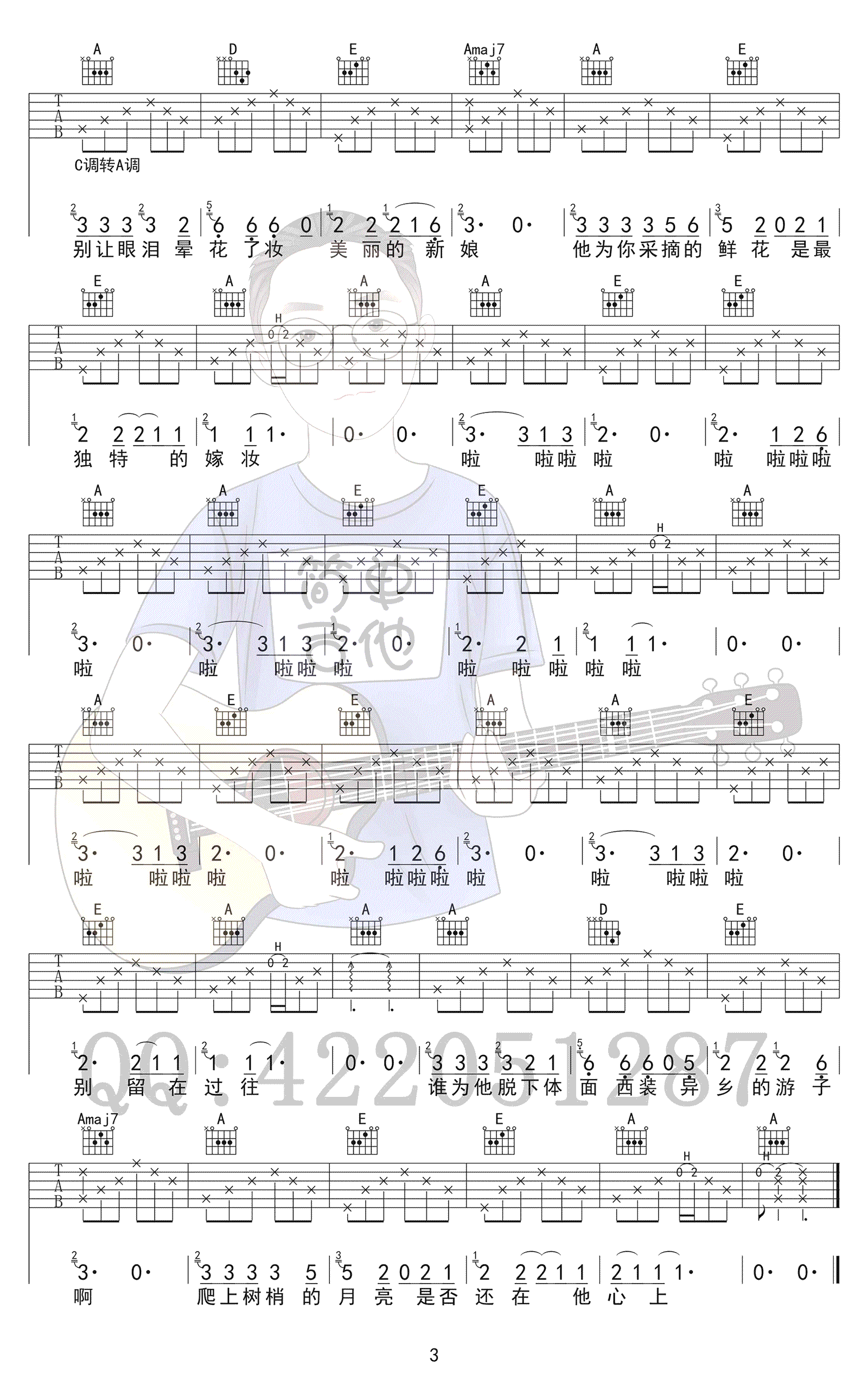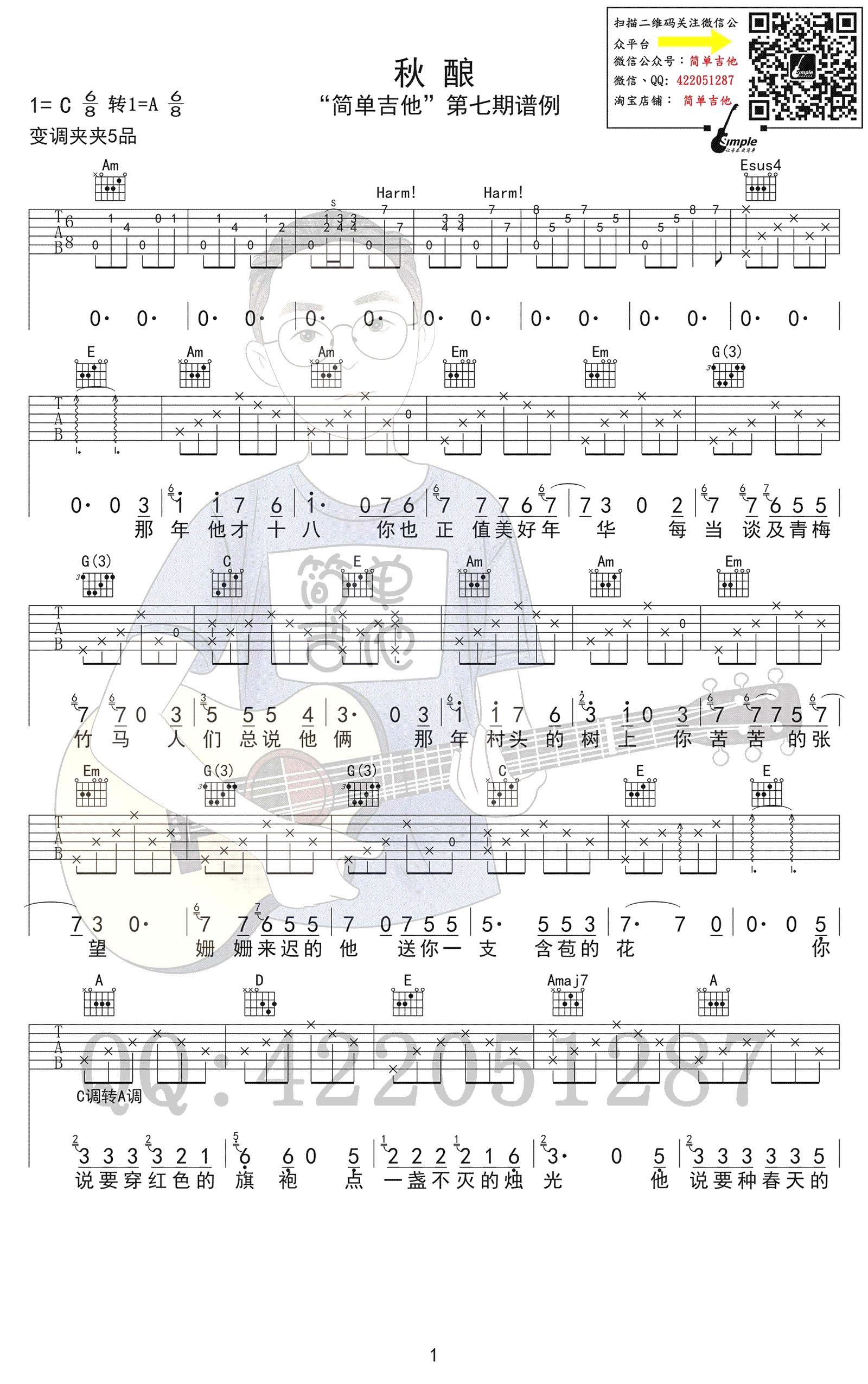 房东的猫《秋酿》吉他谱,C转A调弹唱谱,变调夹夹五品,一首旋律优美动听的民谣歌曲,秋酿六线谱,三张图片谱高清版,简单吉他编配出品。 《秋酿》是房东的猫一首比较热门,传唱度较广的歌曲。会让你想起记忆里最美好的片段,很小的时候陪外婆在老房子院子里的老树下乘凉,与青梅竹马在一起时的两小无猜……