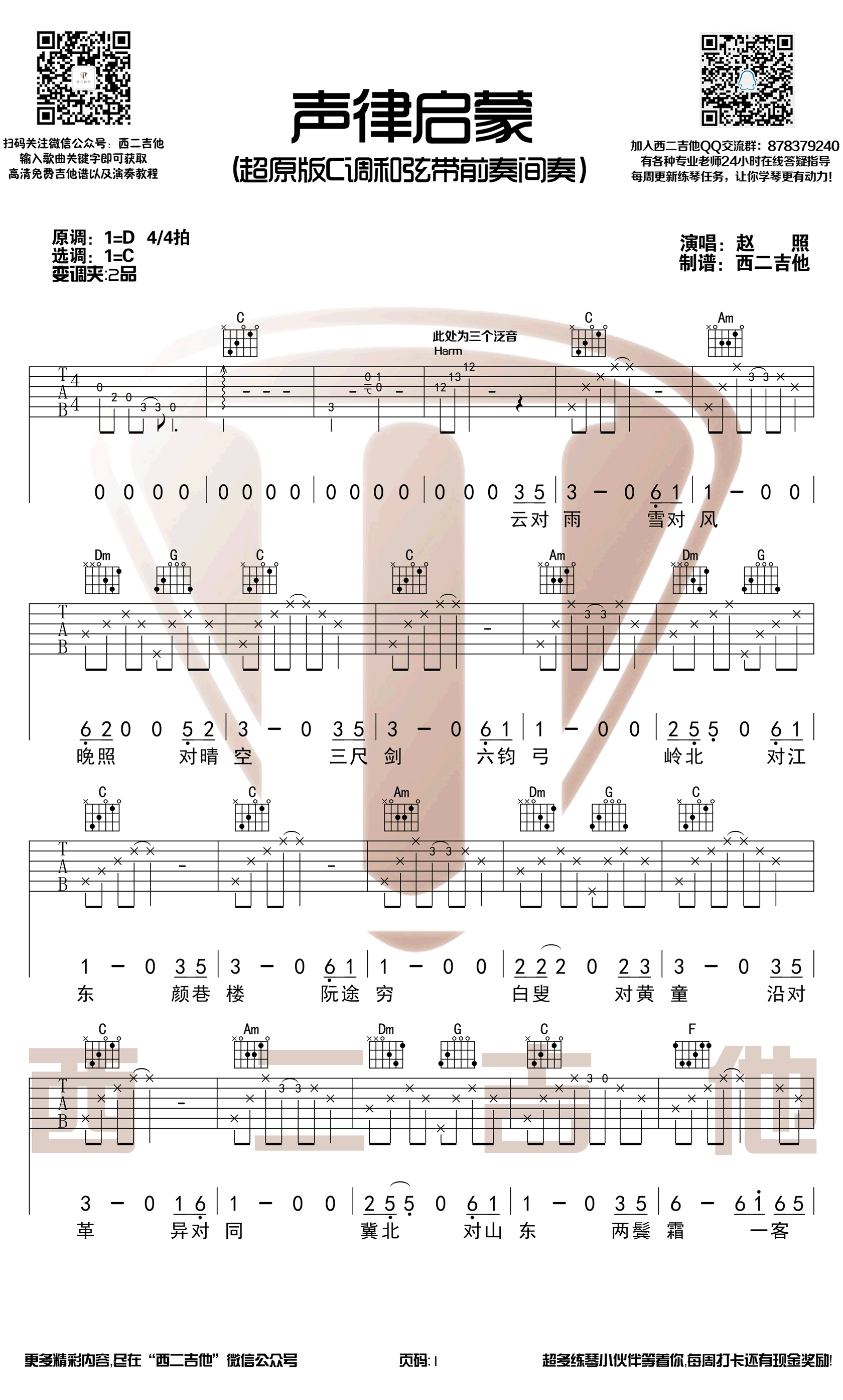 声律启蒙吉他谱,赵照作曲演唱的一首古香古韵的民谣歌曲,声律启蒙吉他弹唱谱,超原版C调和弦带前奏间奏,感谢西二吉他编配出品。 云对雨,雪对风,晚照对晴空。歌词改编自清代作家车万育的《声律启蒙》,古朴的曲调,叙事的唱腔,像是讲述一个安静又遥远的故事,让人静下心来品味时光的流转和岁月的悠悠。