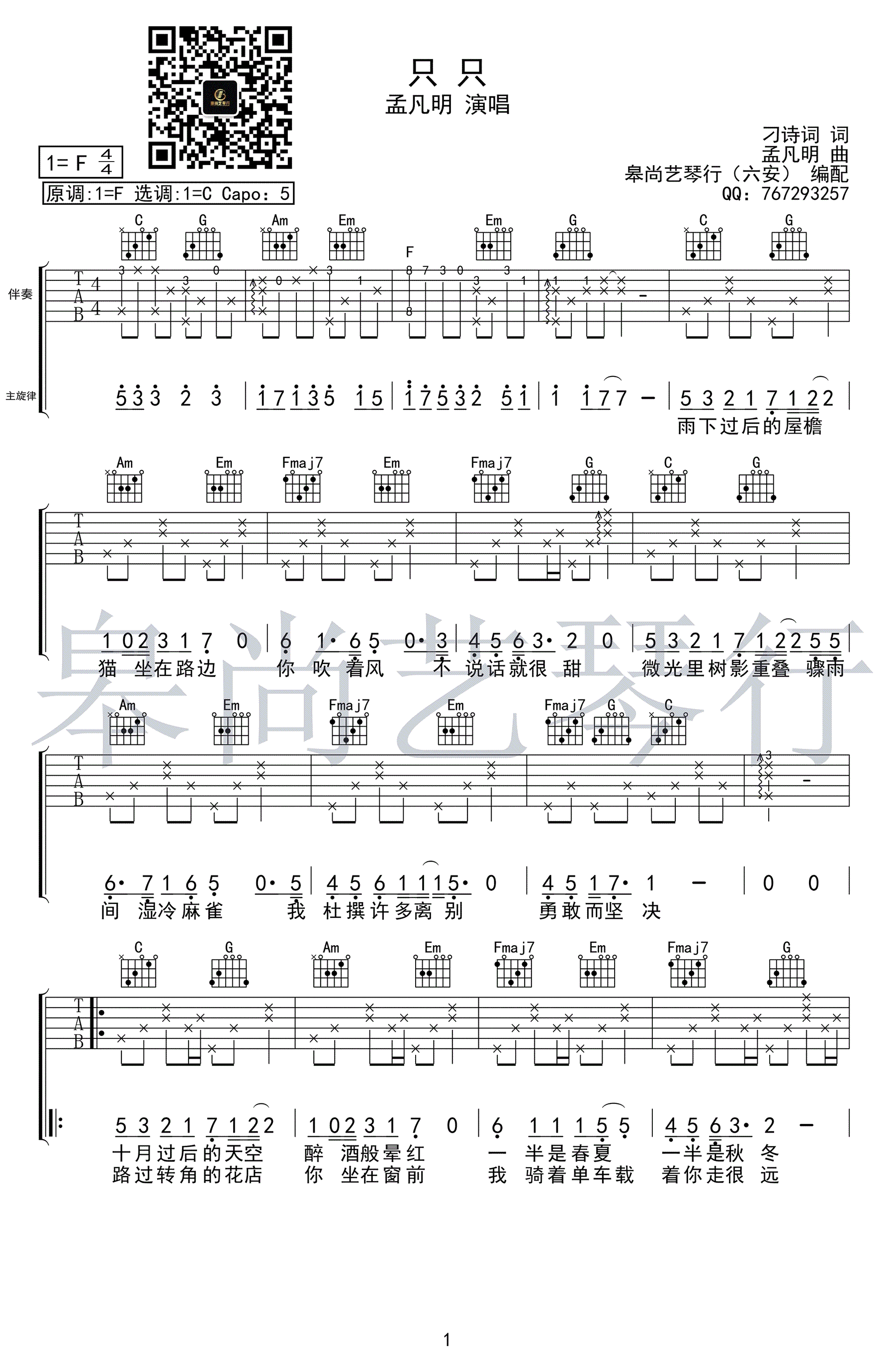 孟凡明 只只吉他谱,C调弹唱谱,变调夹夹五品为F原调音高,一首思念的告白,非常好听的民谣歌曲,只只六线谱,三张高清图片谱,皋尚艺琴行出品,吉他吧网站上传推荐。 想和你看着星空,只谈夜色与微风。希望在这个季节可以有美好事物发生,希望我们到褶皱深处再被人唤醒,希望你还会心怀旧梦,也希望你和TA别再无疾而终。