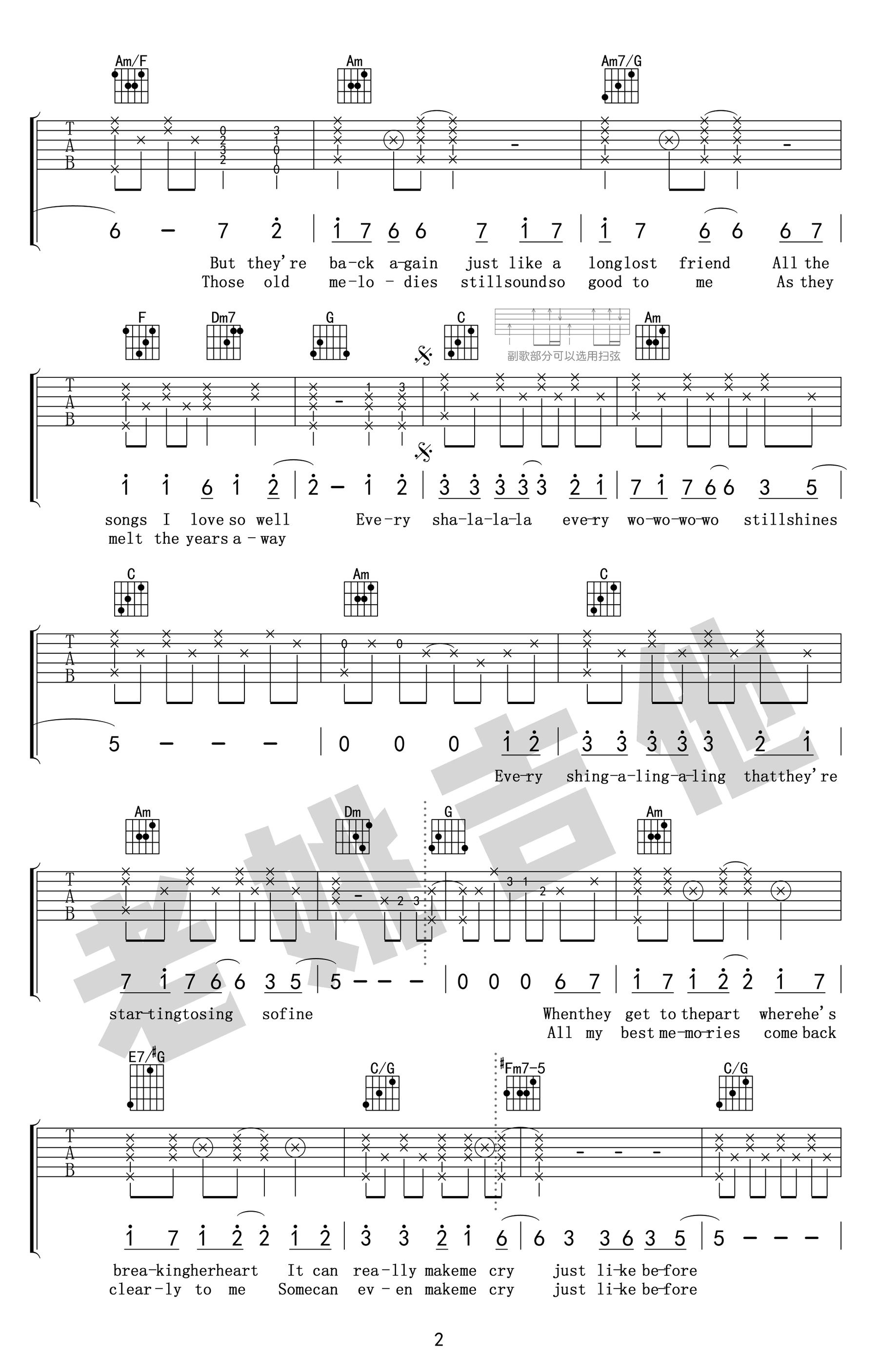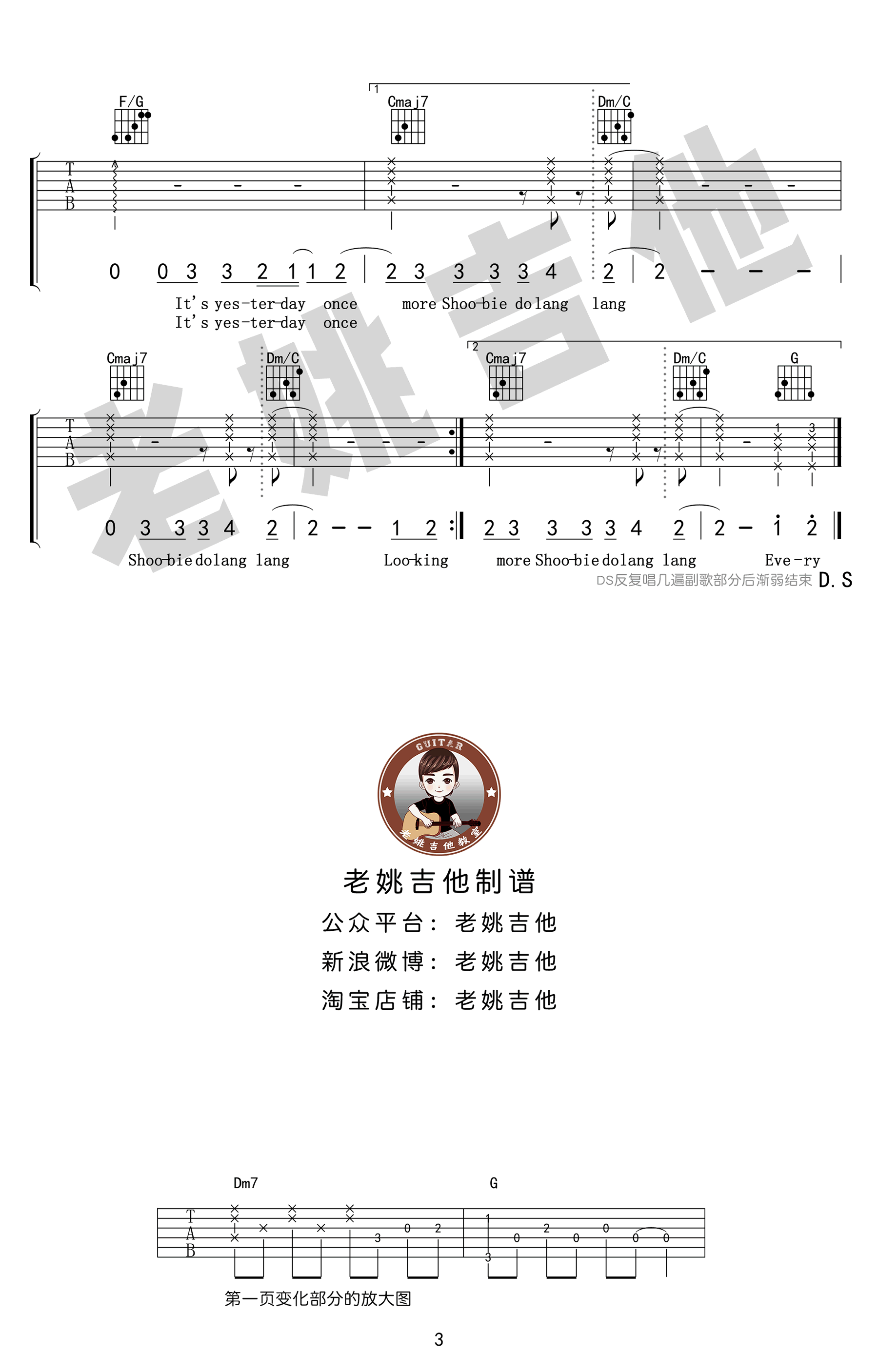 昨日重现吉他谱,Carpenters兄妹组合演唱的一首经典英文歌曲,Yesterday Once More吉他谱,原调E,选调C,变调夹夹四品,高清弹唱图片谱,感谢老姚吉他出品。老歌的旋律,总能轻易深入人心。一首Yesterday Once More也是无数人对英文歌的最初记忆。每一次前奏响起,每一个旋律跳动,都直敲心脏。听这首歌,总是很容易怀念起过去。曾经的美好时光,曾经的亲密挚友,曾经的爱恋,仿佛就在昨天,那时阳光尚好。今日歌声再起,便如挚友相见。随谱附上《昨日重现》吉他教学视频,喜欢这首歌曲的琴友们,跟随老师的示范讲解练习起来。