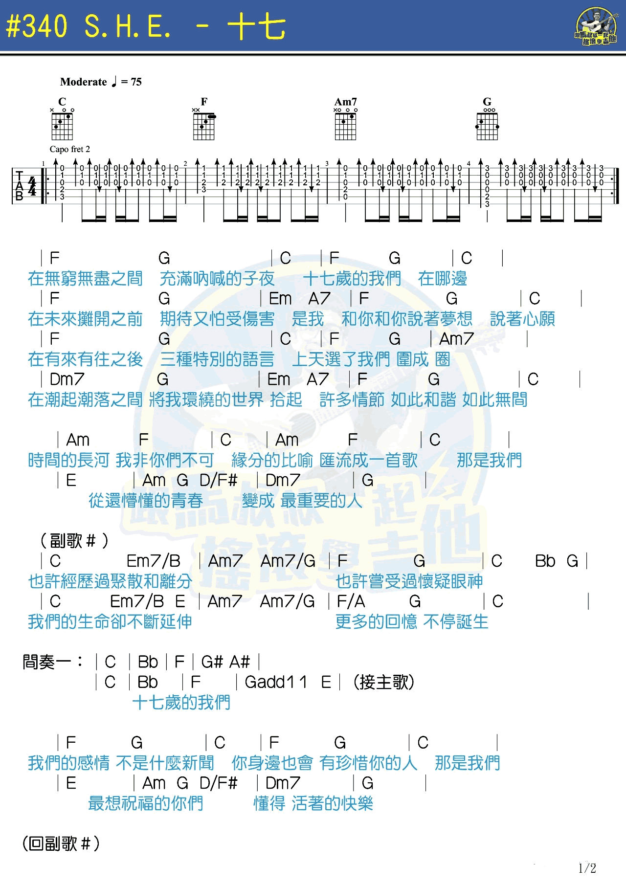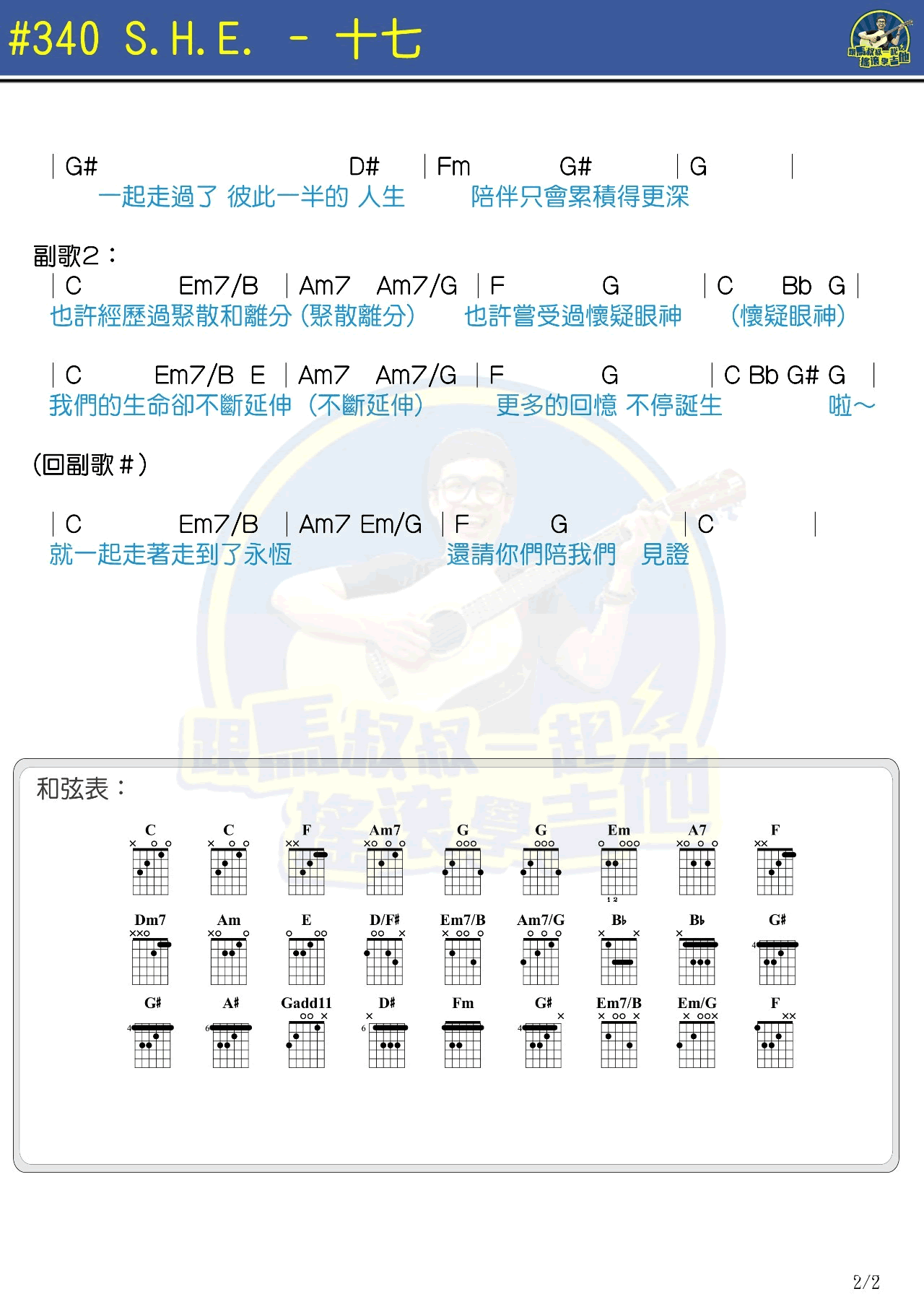 SHE《十七》吉他谱,和弦图片谱,感谢马叔叔吉他教室出品,随谱附上吉他弹唱教学演示视频。这是SHE出道十七年的纪念单曲。是一路成长光阴的纪念和心声。由吴青峰词曲创作,朴实中带着深厚的情感,娓娓述说第一女团SHE和歌迷这17年相伴的青春记忆。