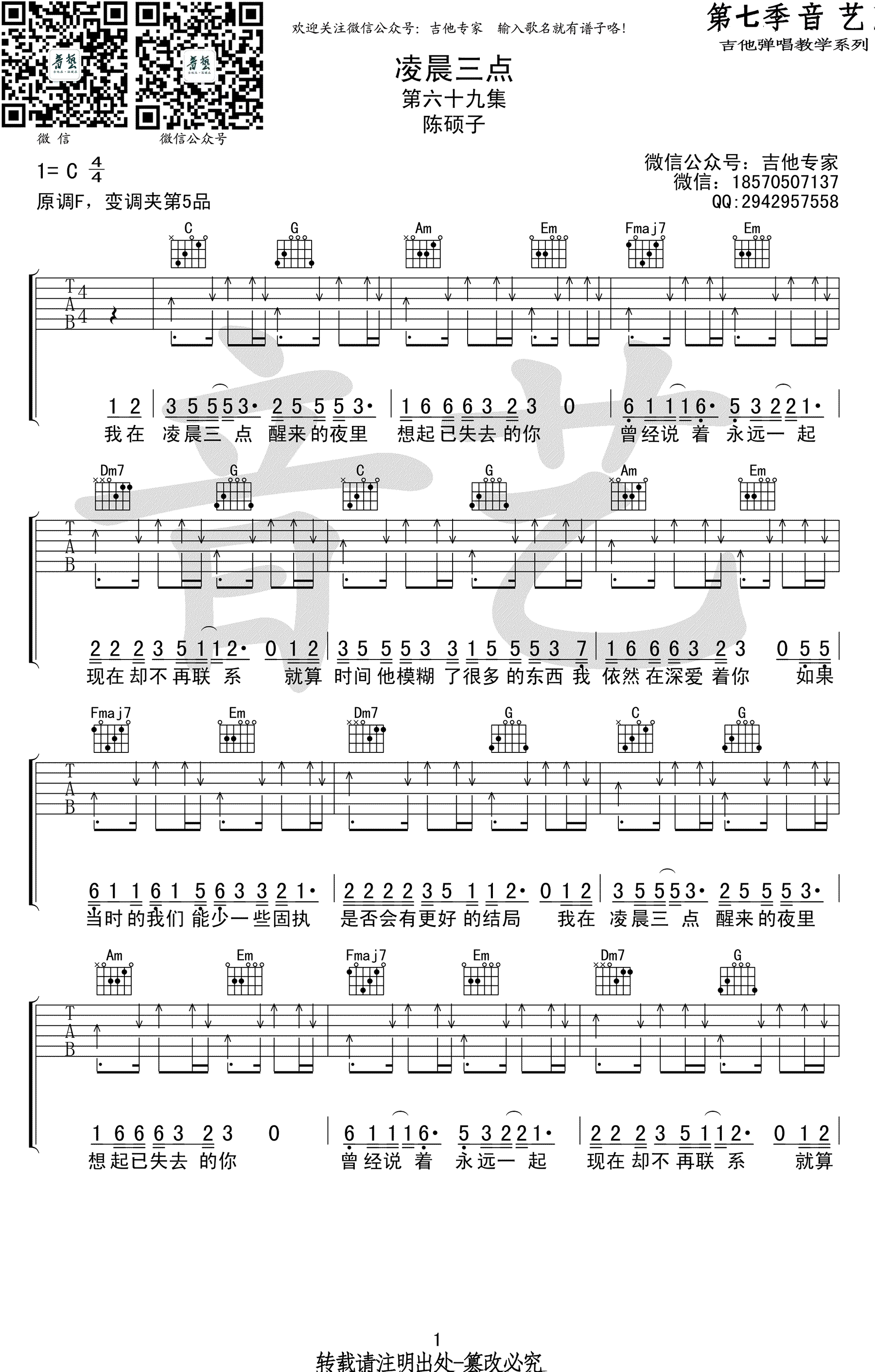 陈硕子《凌晨三点》吉他谱,原调F,变调夹夹五品,选用C调指法,凌晨三点六线谱,高清图片谱,感谢艺音编配出品,吉他吧网站整理上传。摇滚猫老师编配说明:原本想做一个完整版,可惜已经发布出来的只有副歌一部分。完整版视频因为实在听不太清歌词和旋律,所以以后出吧! 凌晨三点, 有多少人在那个时间里默默的奋斗, 默默的徘徊,默默的感伤, 在这个凌晨三点的夜里,你又在做着什么?