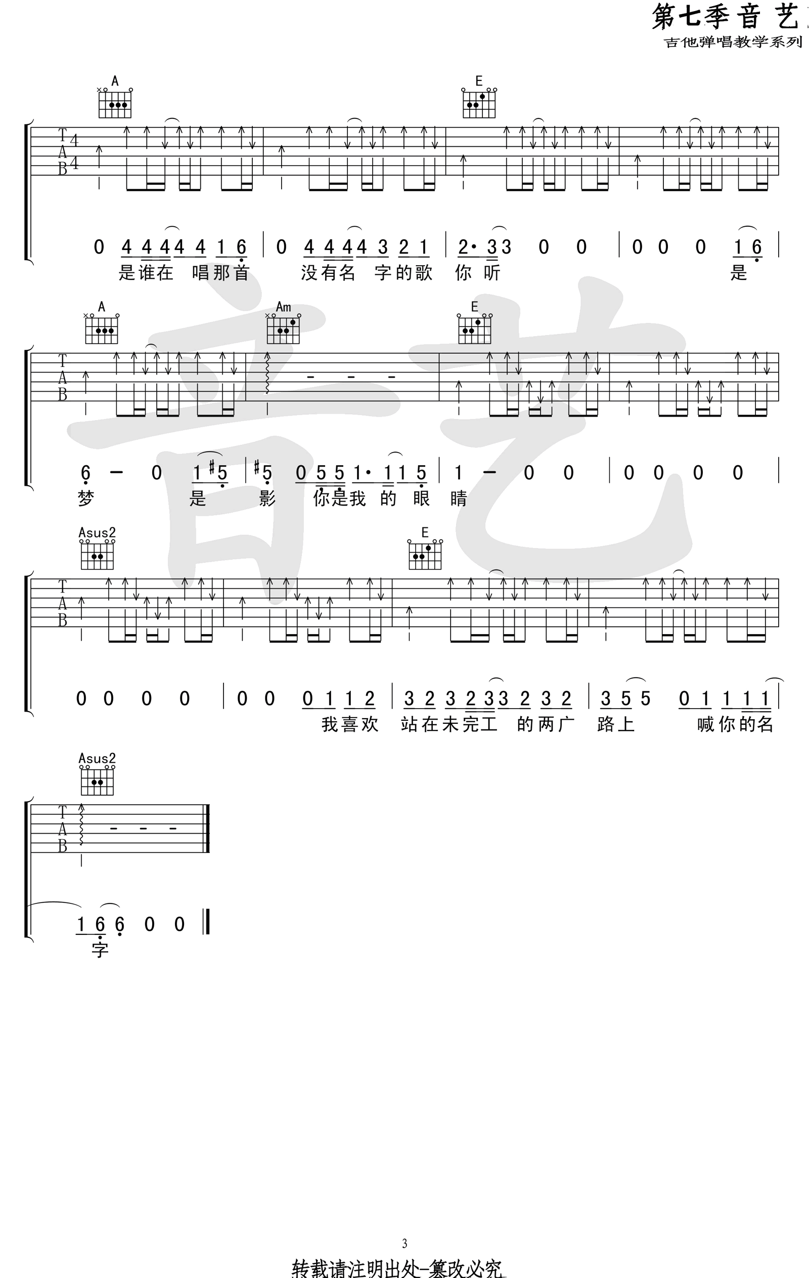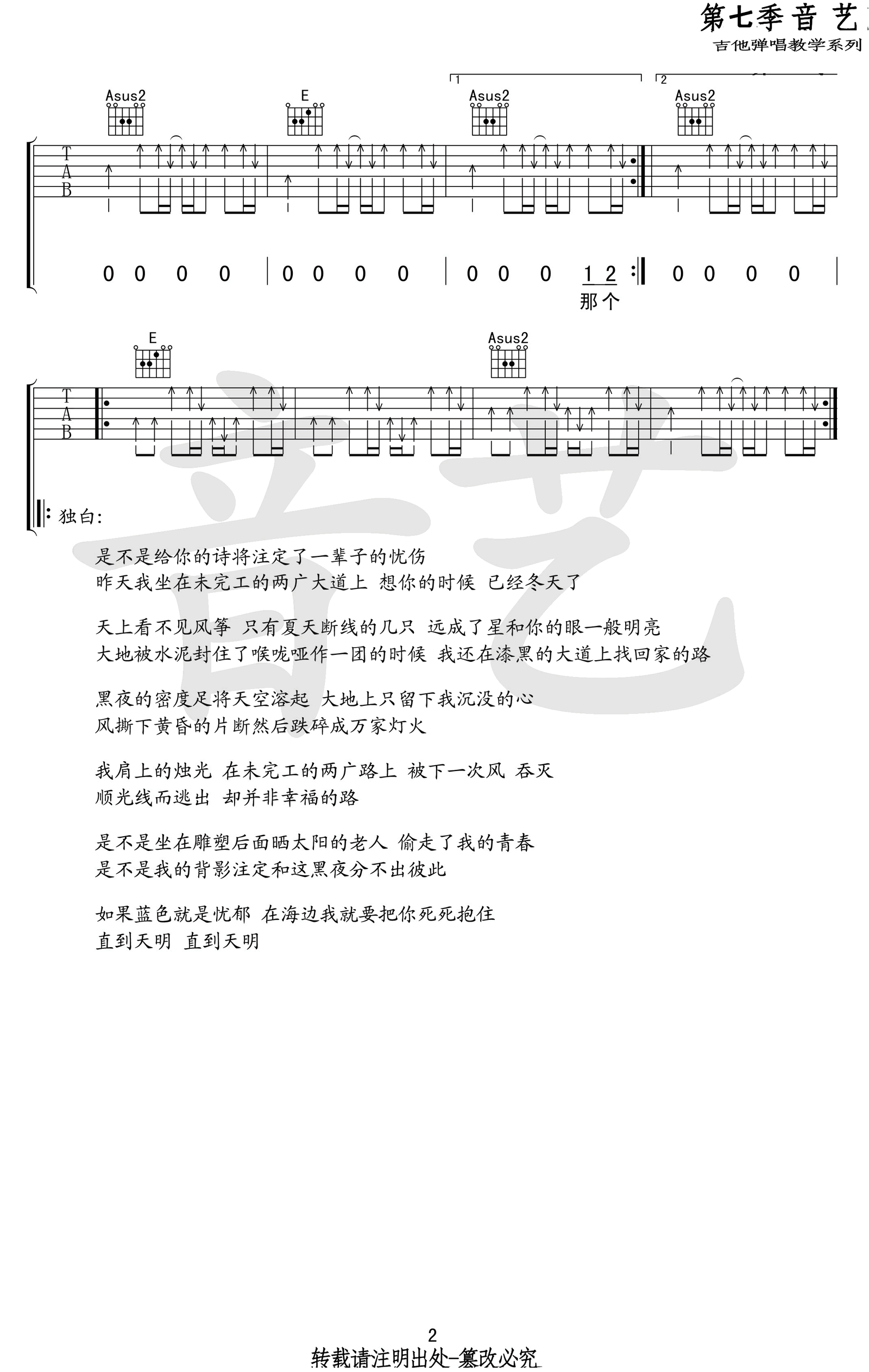小安《给郁结的诗》吉他谱,原调#F,变调夹夹第二品,选用E调指法编配,给郁结的诗六线谱,三张高清图片谱,艺音出品,吉他吧网站上传。 是谁在唱那首没有名字的歌你听,是梦,是影,你是我的眼睛。温暖感人的歌声留在了我们青春漫长而又短暂的岁月里。小安的首张专辑《我不知道》中的一首歌,歌词改编自mlln写给爱人的组诗《给郁结的诗》,是一首很好听小众民谣歌曲。