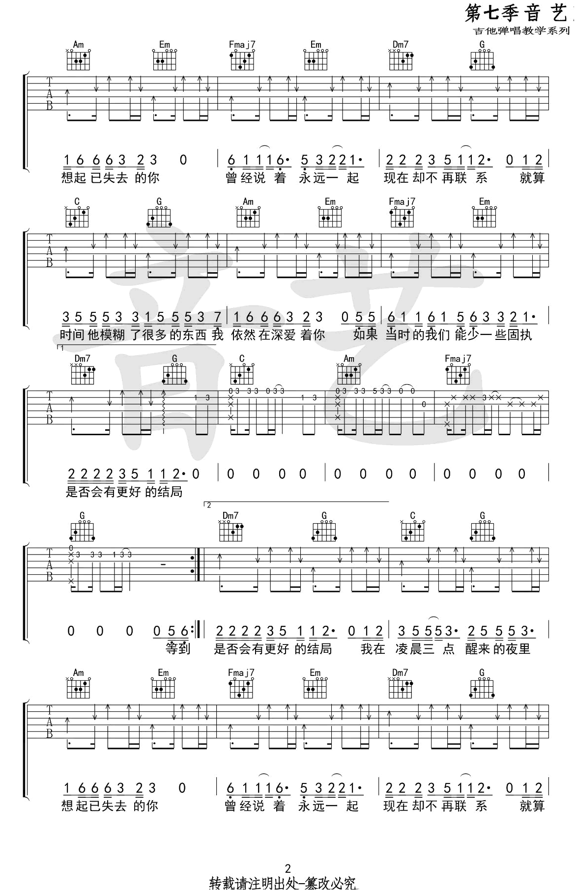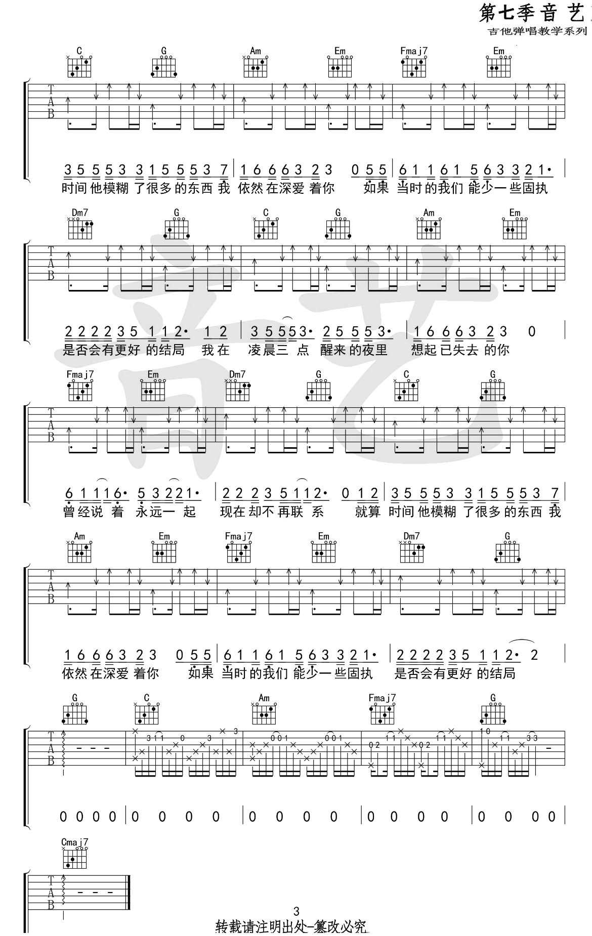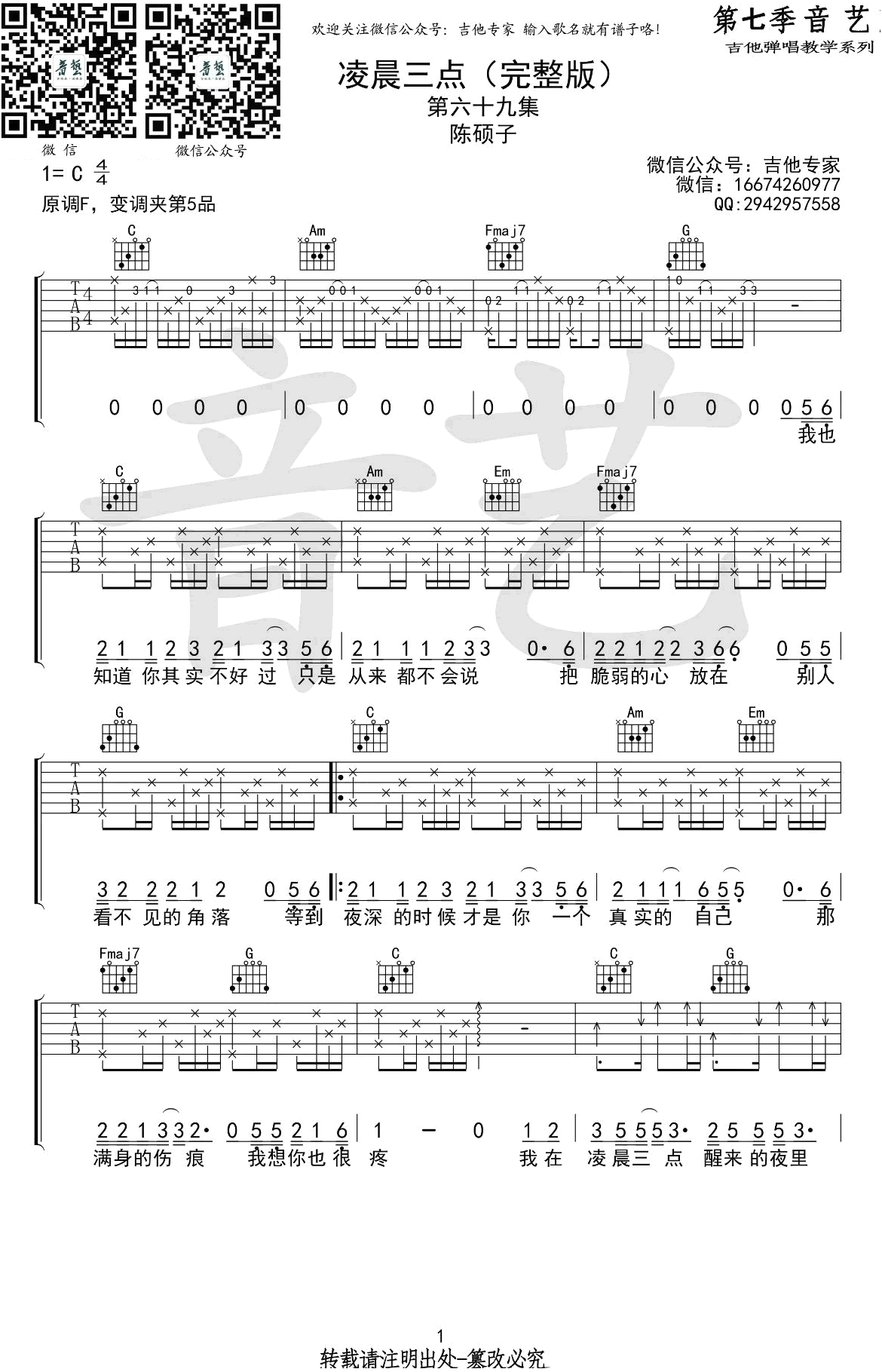 凌晨三点吉他谱完整版,陈硕子演唱的一首热门歌曲,原调F,采用C调指法编配,变调夹夹五品,凌晨三点吉他弹唱谱,高清图片六线谱,音艺出品,吉他吧网站推荐分享。 摇滚猫老师之前出了副歌部分,这次补上了完整版。让人感动的歌曲带给琴友们,希望这个版本可以让你在每一个醒来想起她的夜里得到一些安慰。
