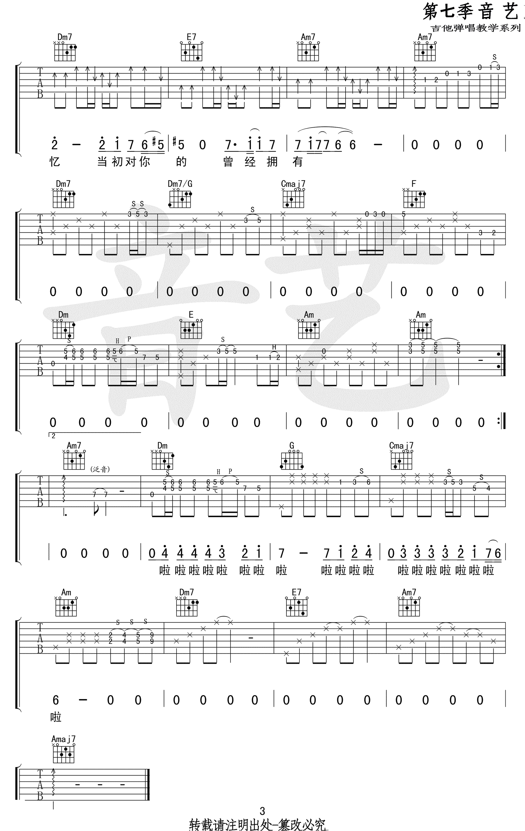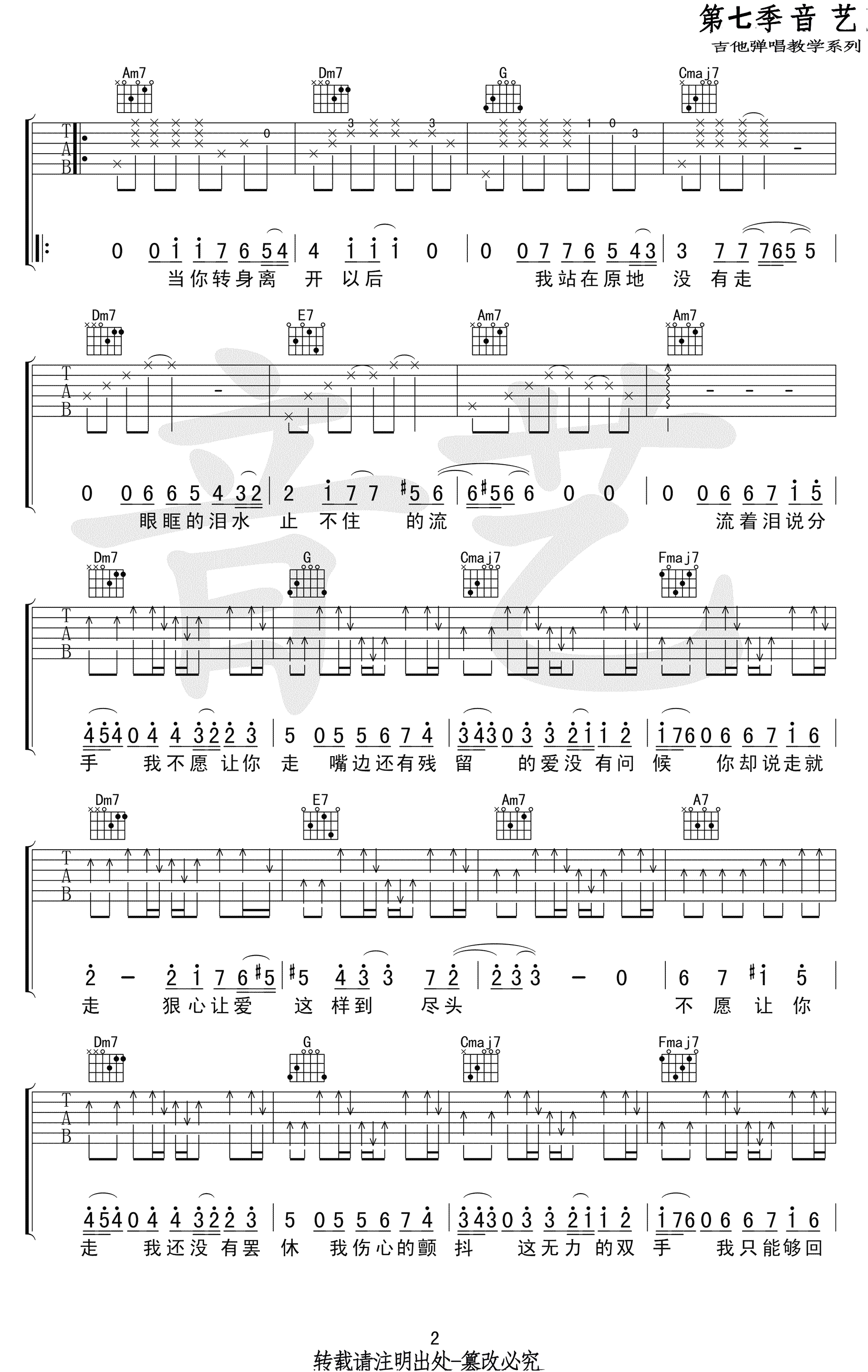 《流着泪说分手》吉他谱,金志文演唱,C调指法,变调夹夹一品,流着泪分手六线谱,高清弹唱图片谱,感谢艺音出品,吉他吧网站上传分享。 摇滚猫老师编配说明:金志文音乐鬼才,编曲水平一流,做谱子的时候都不好意思乱改!最近很喜欢这首歌曲,就做了一个自己习惯弹奏的版本,其实网上之前就有很完美的吉他谱了,抄袭比较多啊,怪不好意思的,大家弹琴的时候右手的节奏 型可以随便改!单身狗们千万不要错过啊!
