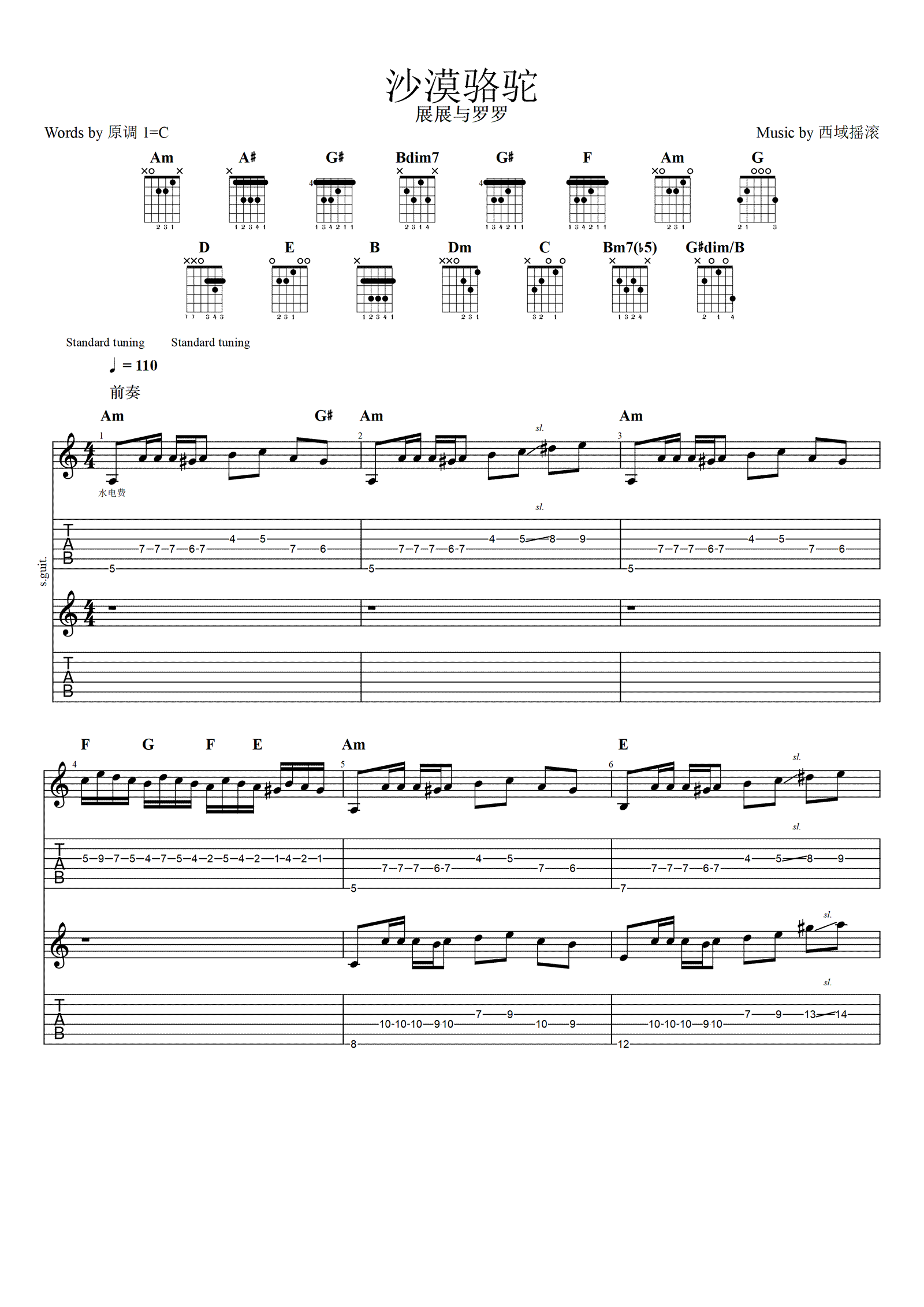 展展与罗罗《沙漠骆驼》吉他谱,原版C调编配,一首火遍网络的热门抖音神曲,沙漠骆驼六线谱,高清图片谱,完整版共分十三张谱例。吉他吧网站推荐分享。 这首歌曲是在抖音上火起来的,视频三人中,穿着蓝色衣服的便是斗鱼主播寅子,歌词部分恰巧便是:什么鬼魅传说,什么魑魅魍魉妖魔,只有那鹭鹰在幽幽的高歌。也因为这几句歌词,这首原唱展展与罗罗的《沙漠骆驼》才会火起来的,成为网络上的爆红歌曲。
