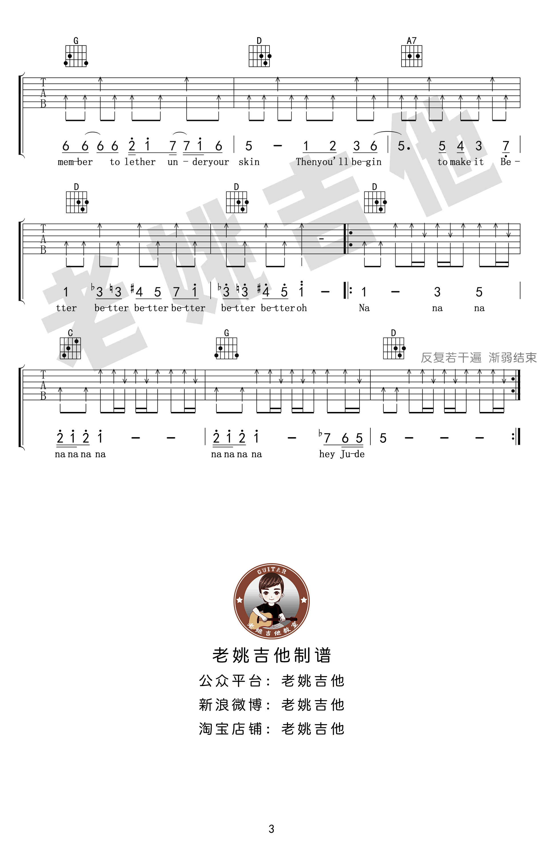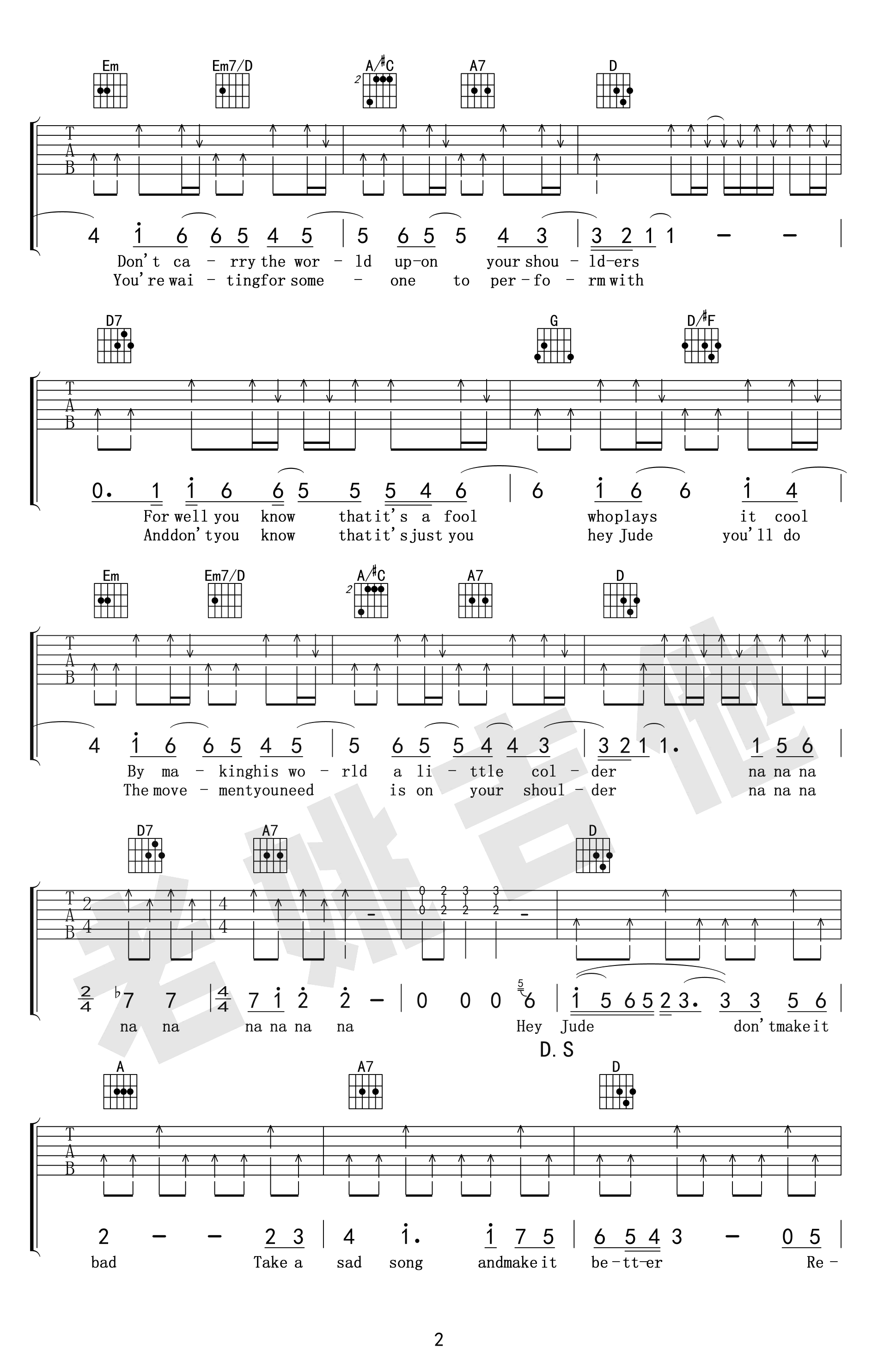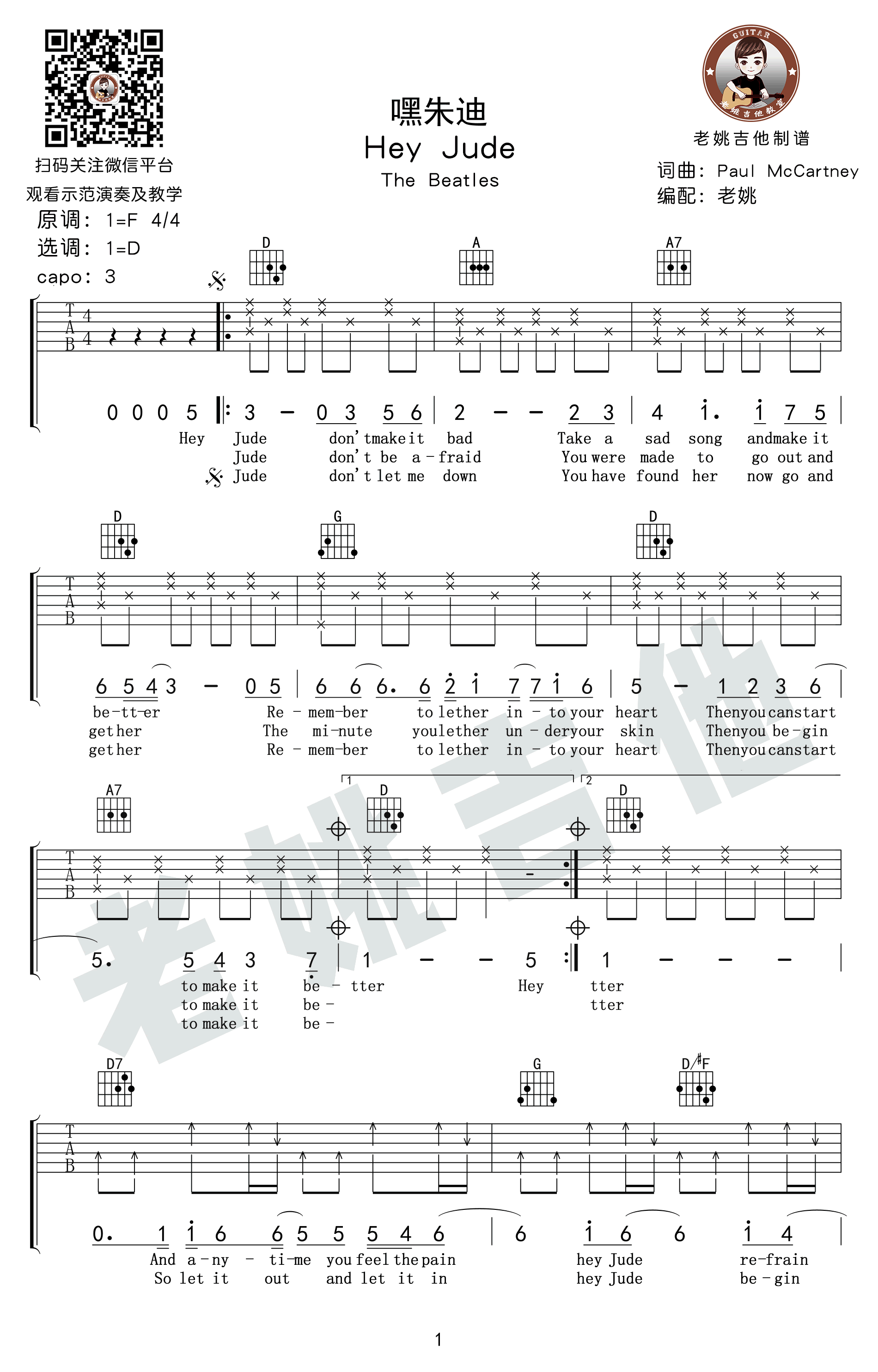 Hey Jude吉他谱,披头士乐队成员保罗·麦卡特尼创作的一首传奇式的经典英文歌曲,Hey Jude六线谱,原调F,选用D调指法,Capo夹三品,高清弹唱图片谱,感谢老姚吉他编配出品,随谱附上歌曲配套吉他弹唱教学视频。这首传世之作是The Beatles(甲壳虫乐队)所有作品里被众人合唱次数最多的一首,从低吟到呼喊,每次总能让人听得起鸡皮疙瘩。人生不如意十之八九,但你仍需相信,这个世界会变得更美好。充满阳光与希望的歌曲送给吉他吧所有琴友们。