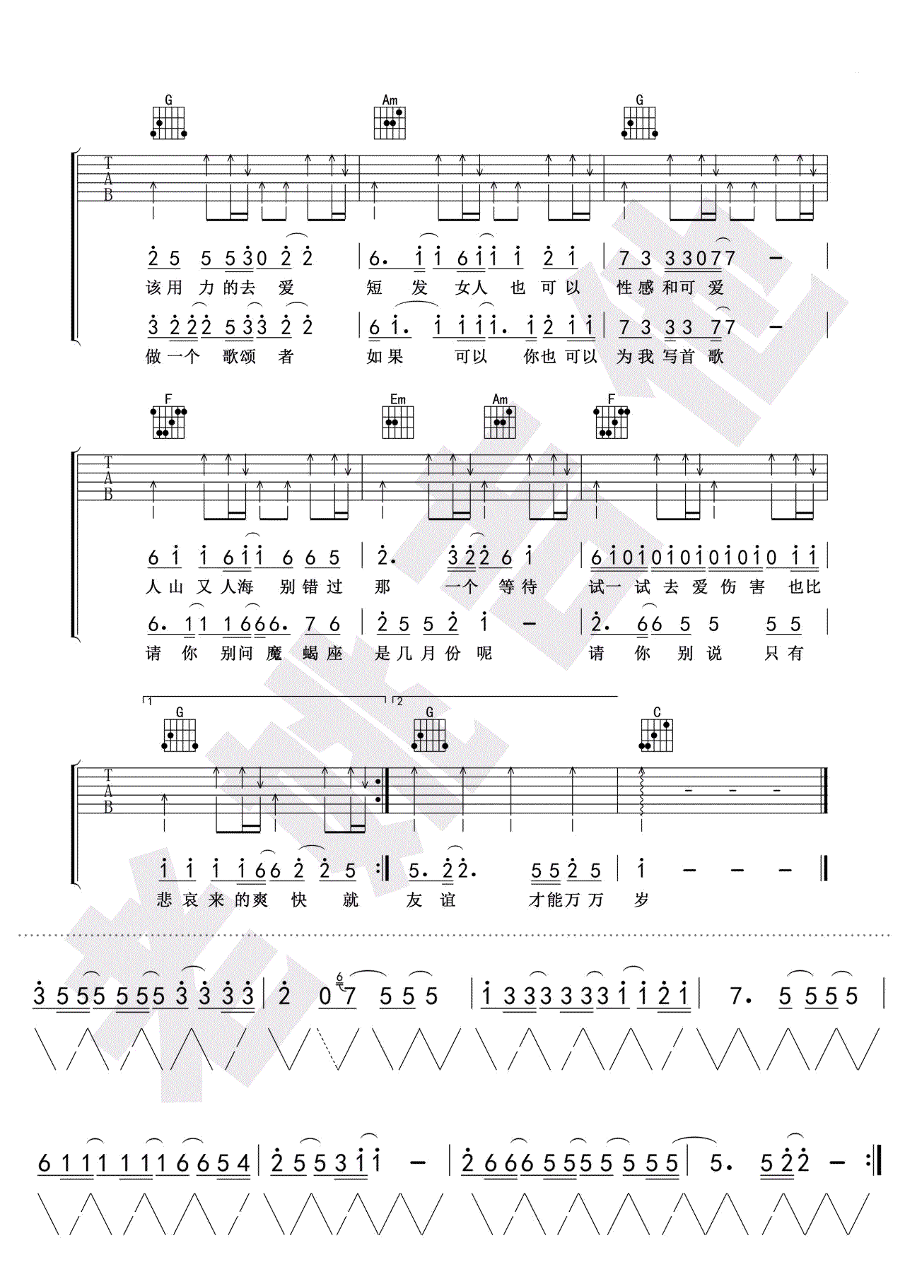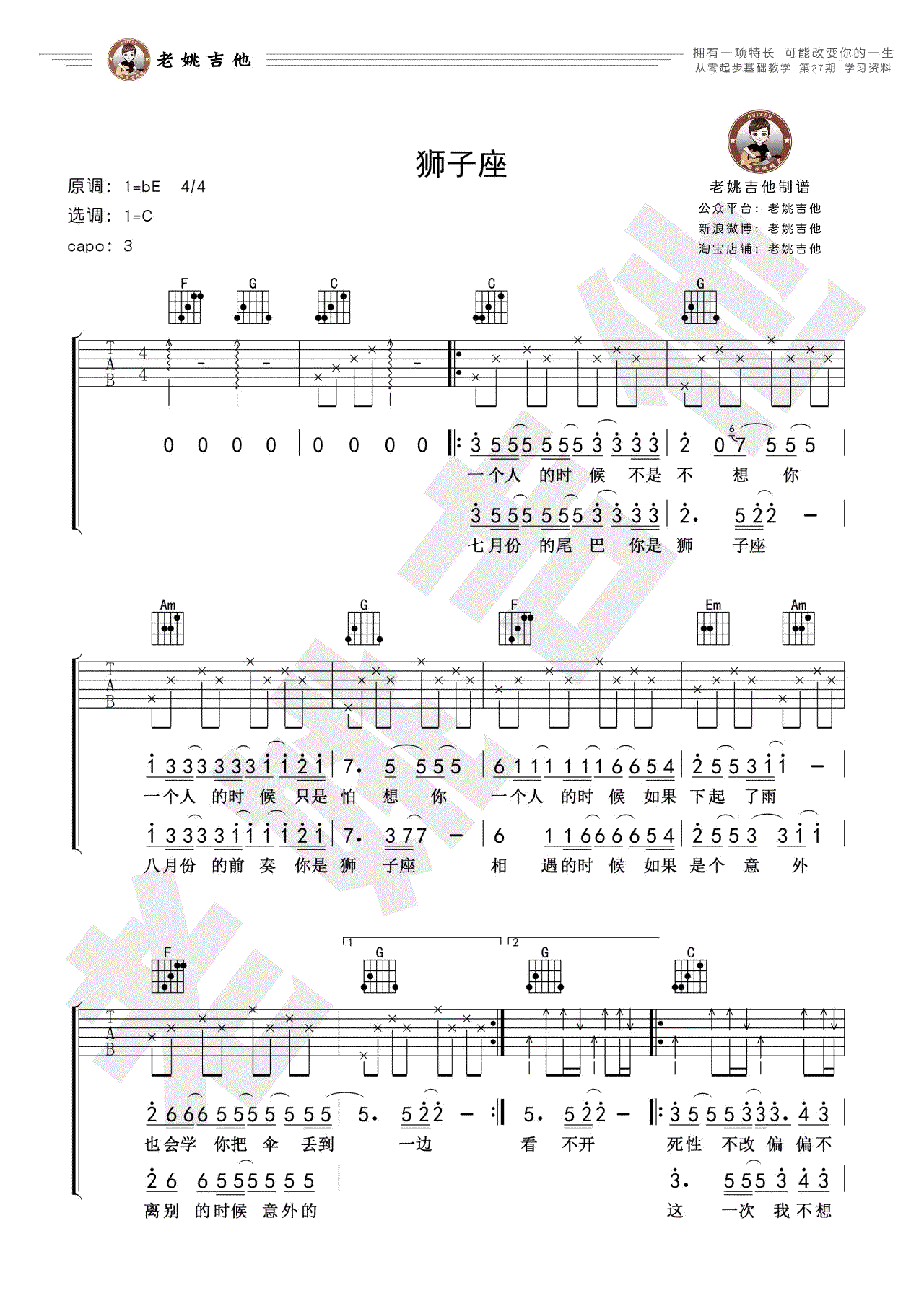 狮子座吉他谱,曾轶可的一首代表歌曲,超级女声时期的成名曲,狮子座六线谱,原调降E,C调指法编配,CAPO夹三品,高清图片谱,感谢老姚吉他出品,随谱送上配套吉他弹唱教学视频,本期从零起步基础教学课程,配合歌曲《狮子座》讲解手指扫弦,把节奏画出来内容,琴友们参照老师的示范教学认真练习。