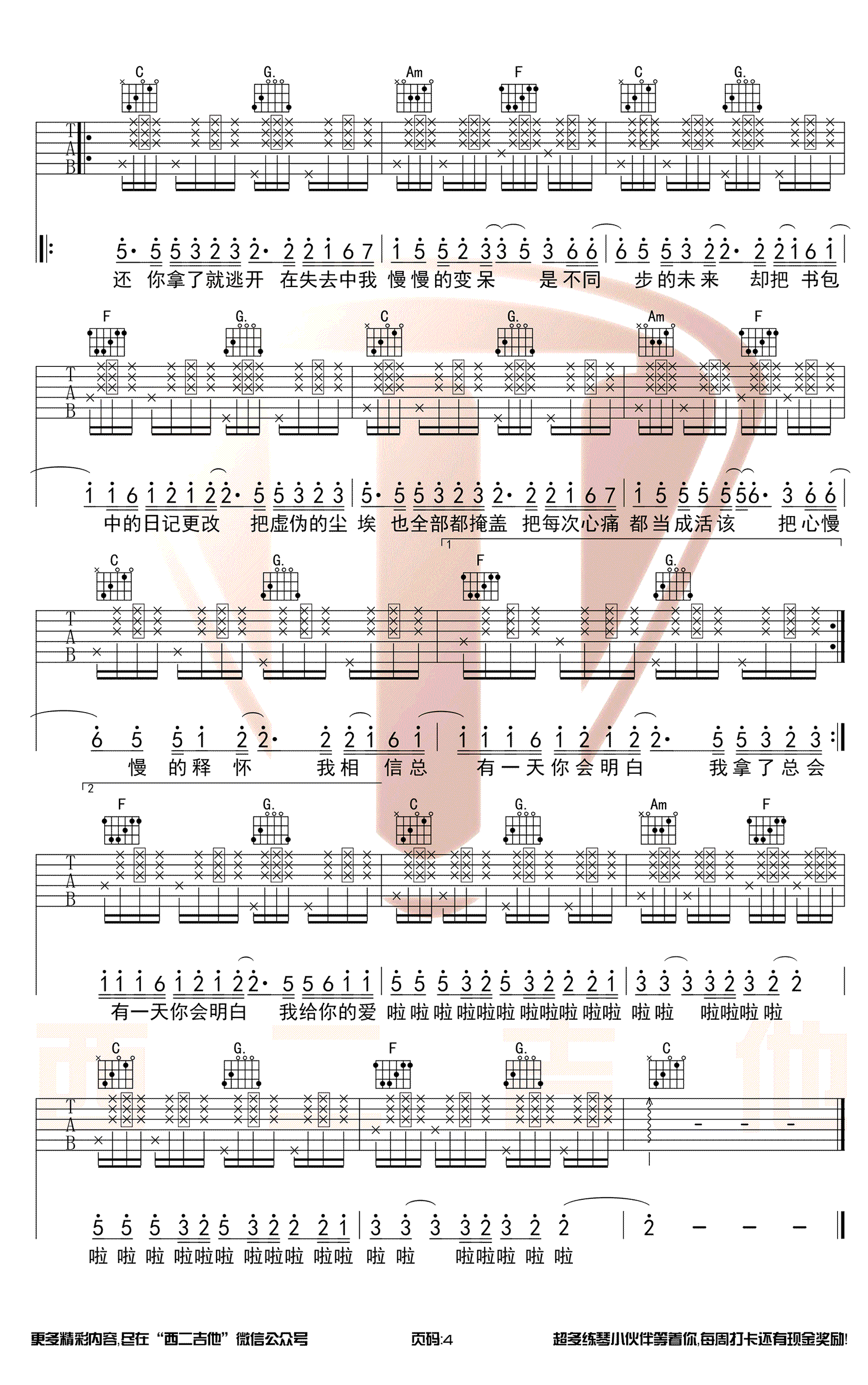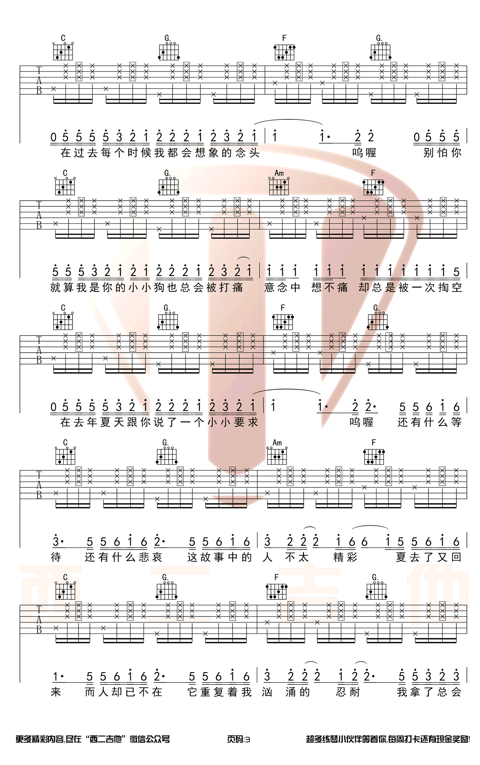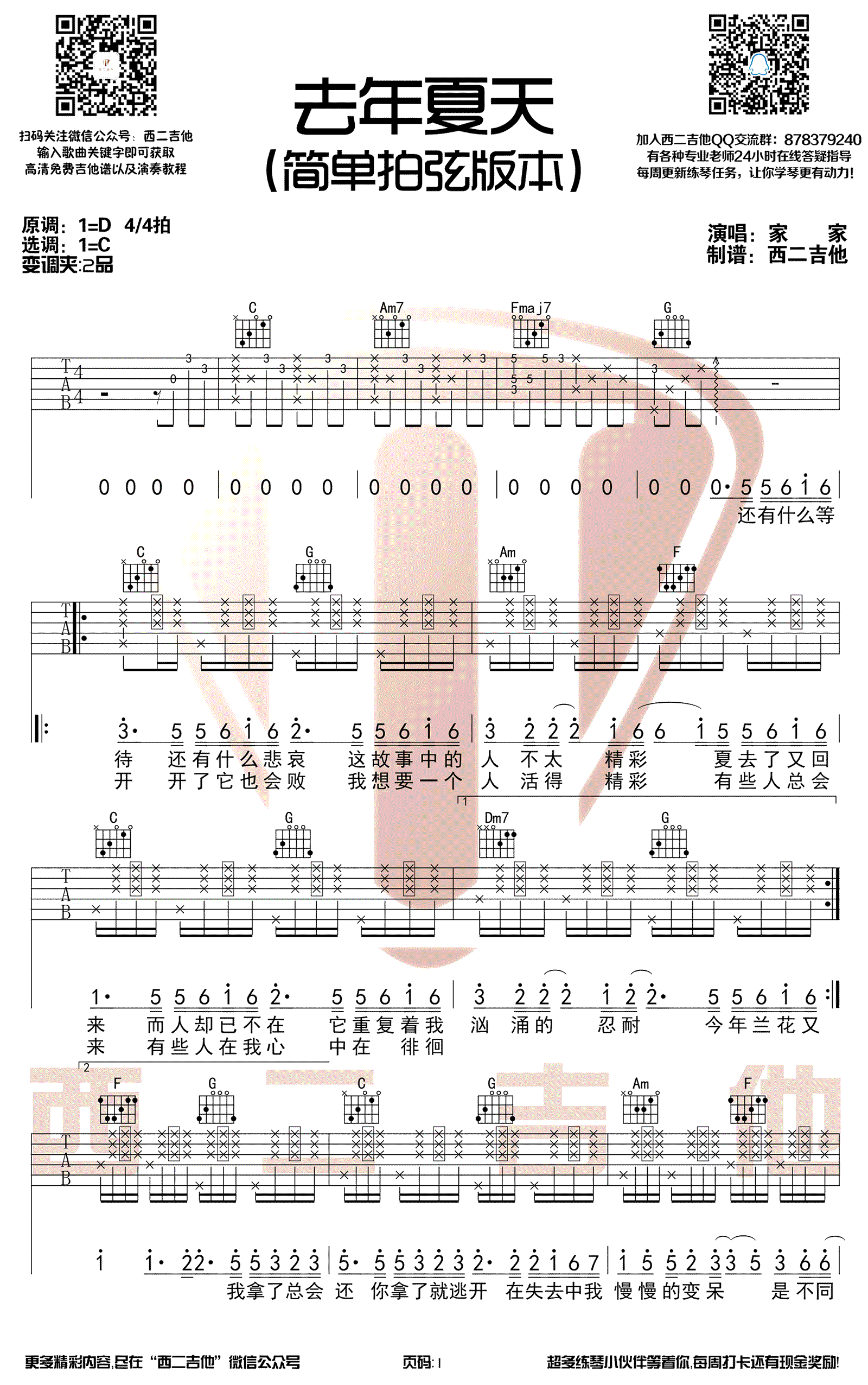 去年夏天吉他谱,家家演唱,人气主播王大毛的演绎翻唱,让这首《去年夏天》成为网络平台的热门歌曲。去年夏天六线谱,原调D,变调夹夹第二品,选用C调指法,简单拍弦版本,高清弹唱图片谱,由西二吉他编配出品。 很有节奏感的歌曲,唱出洒脱阳光的心态。我们年少时的爱情,总会有一个人的愿意,一个人的喜欢,爱情故事中的你我,爱你是我,就够了,哪怕去年夏天不再回来。