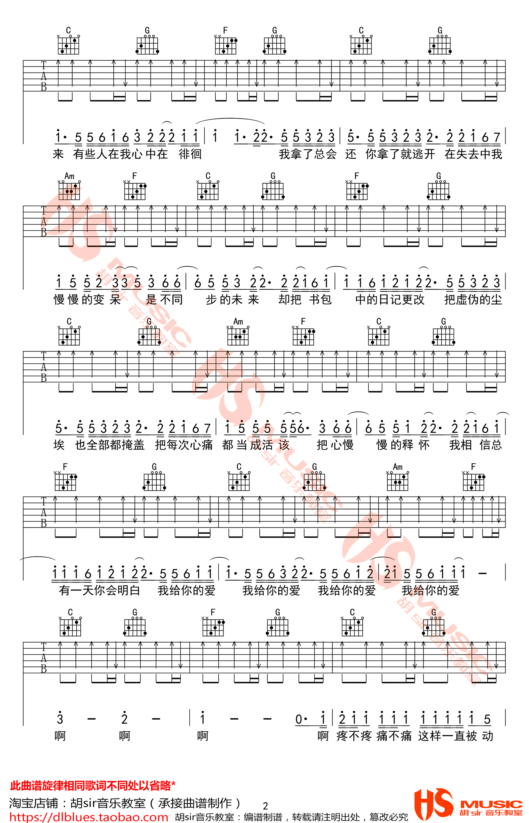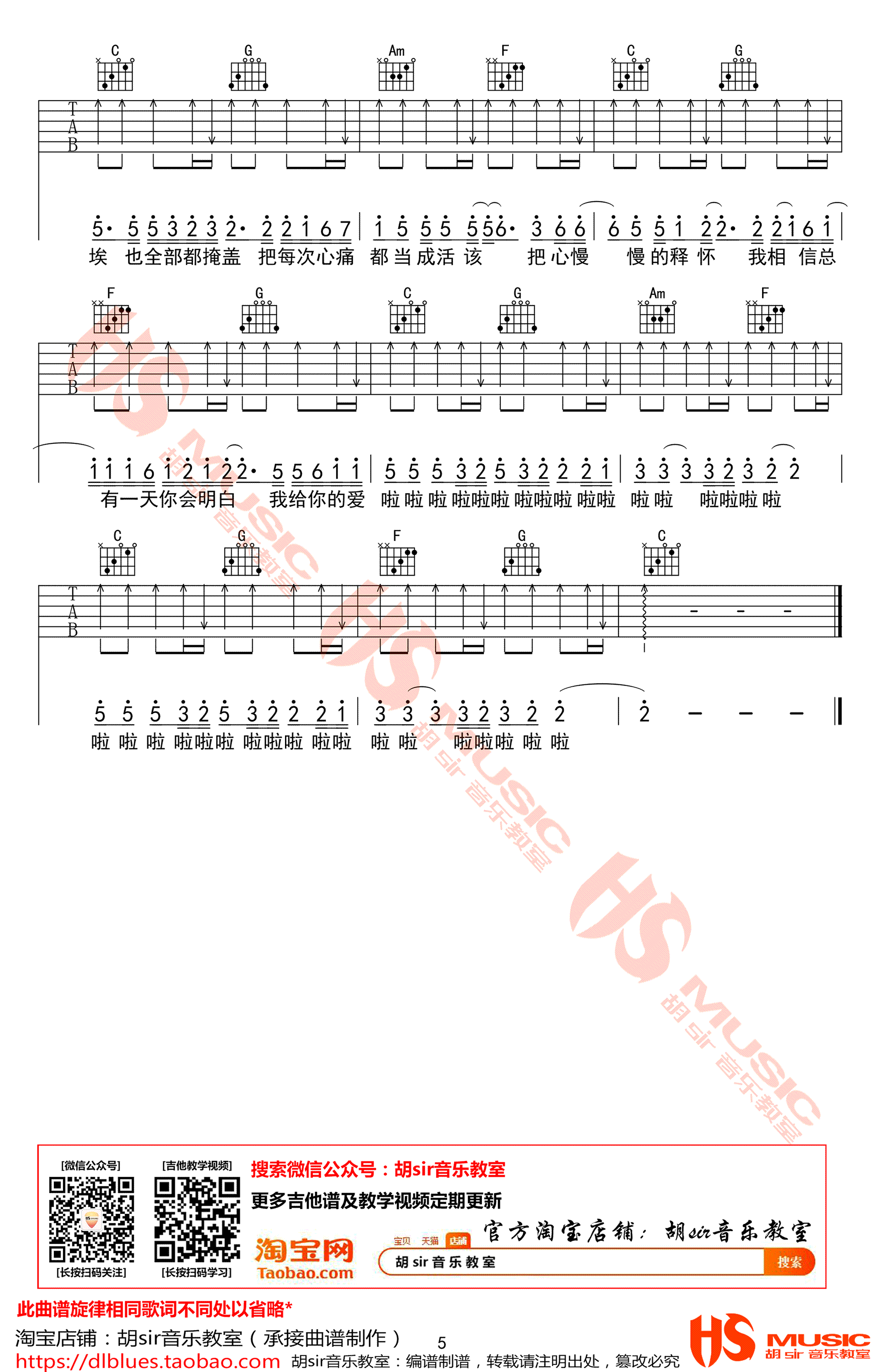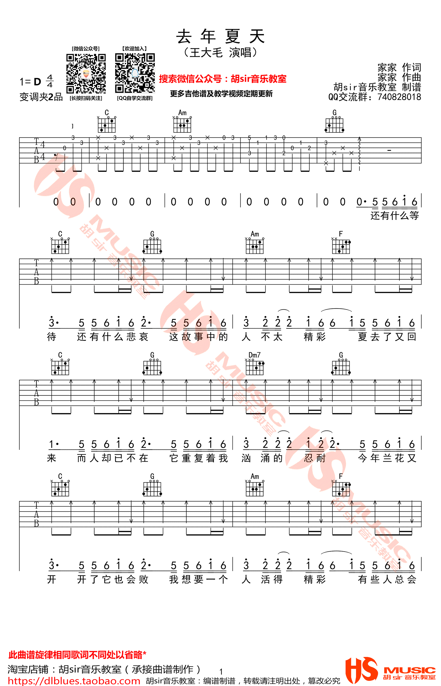 王大毛《去年夏天》吉他谱,D调弹唱谱,变调夹夹二品,去年夏天六线谱,完整版共五张图片谱例,胡sir音乐教室出品,吉他吧网站上传分享。 失去了的夏天,明年还会再来。身边的爱人离开了自己,不必太过难过,爱情上的失去只是暂时的,谁能说这一次的失去,不是为了下一次更好的相遇呢?