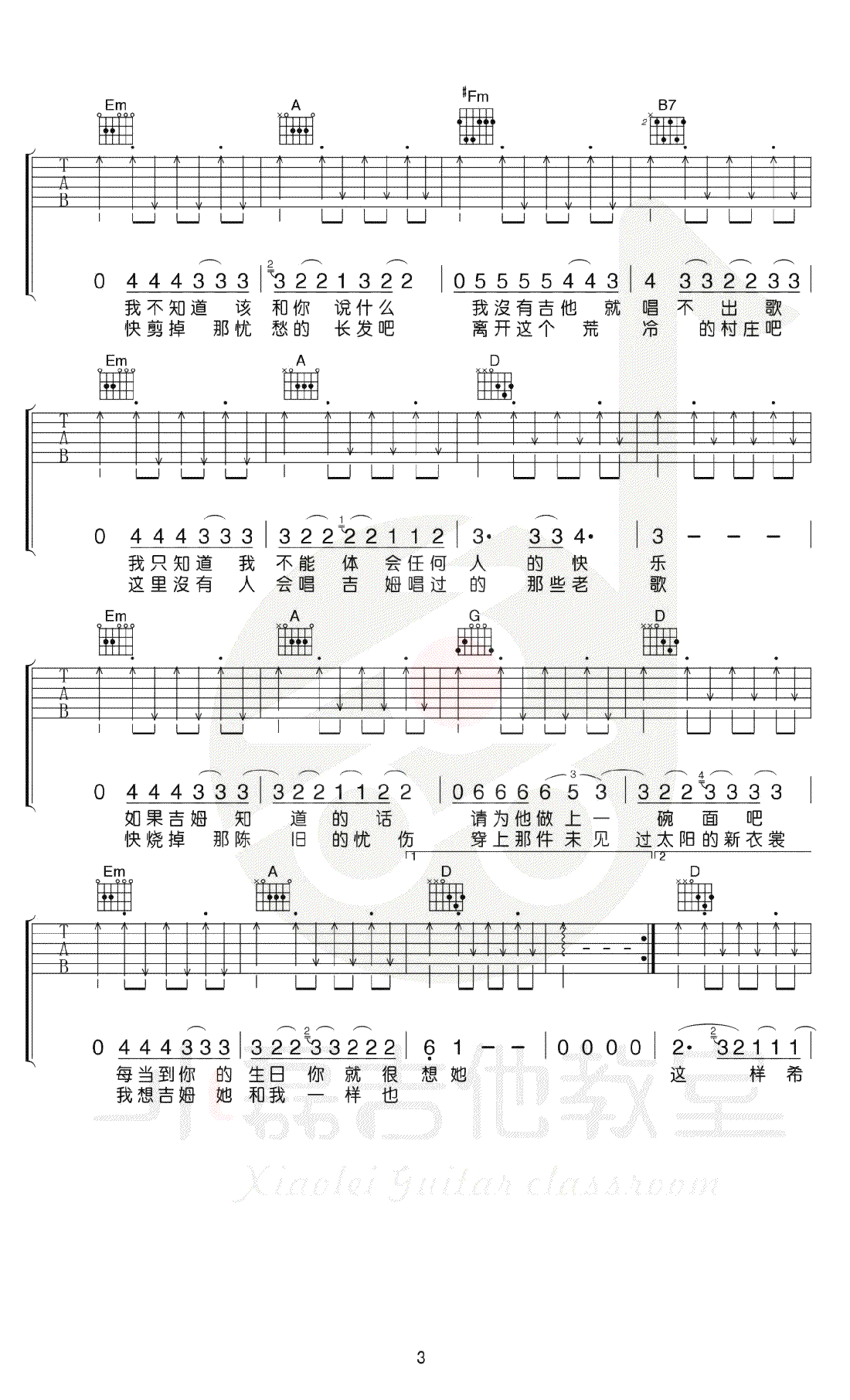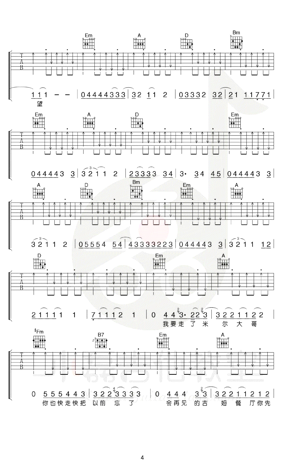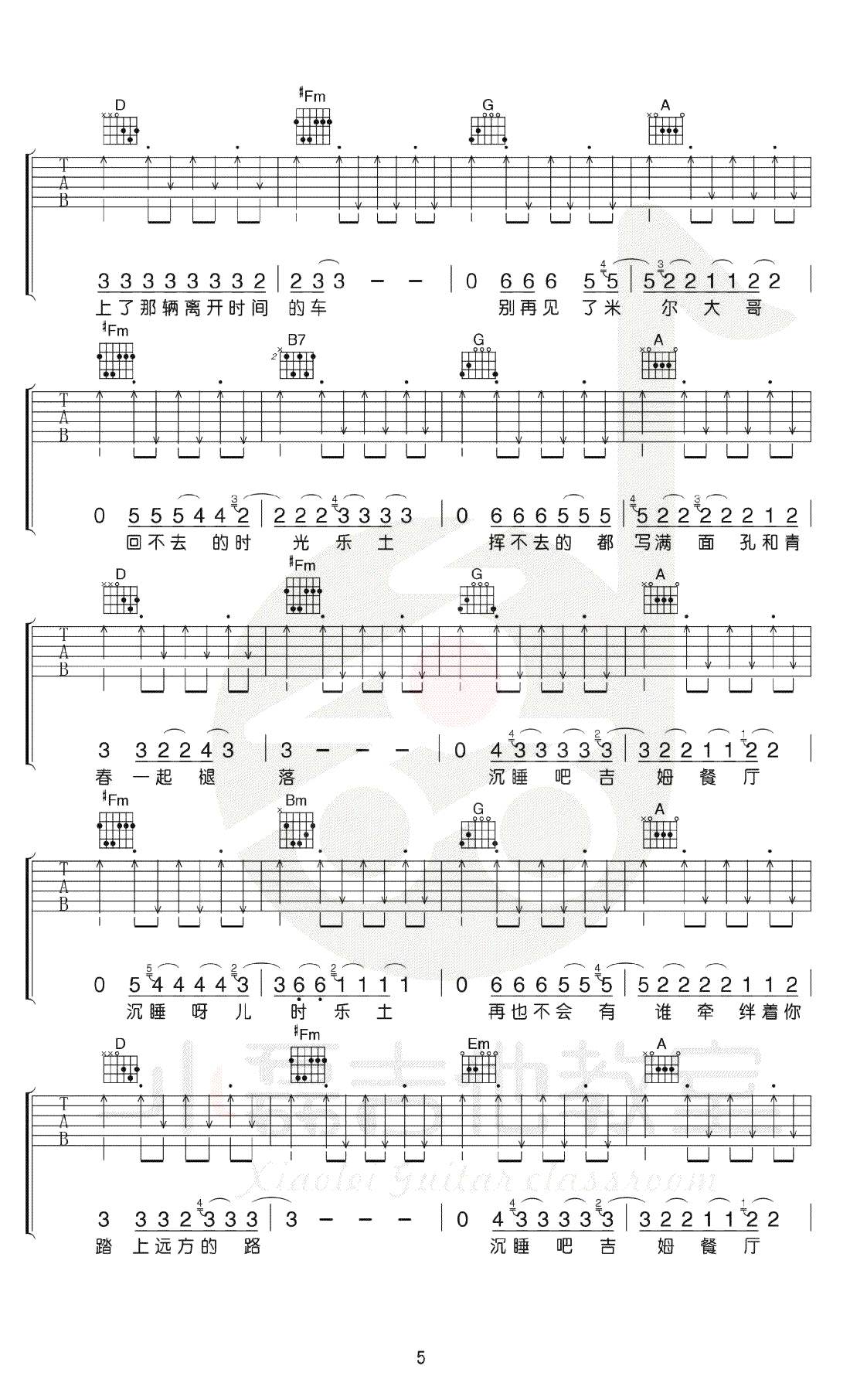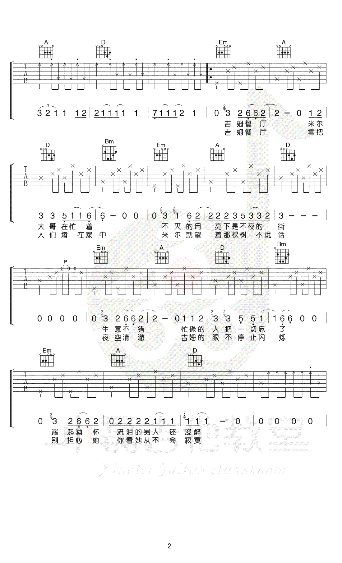 赵雷《吉姆餐厅》吉他谱,原调Eb,选用D调指法,Capo夹一品,吉姆餐厅六线谱,完整版共六张图片谱例。感谢小磊吉他编配出品,吉他吧网站推荐分享。随谱附上配套吉他弹唱教学,一把吉他编配,这首歌曲有扫弦和分解和弦的成分,体现乐曲旋律的前后反差,使得歌曲呈现更加丰富。前奏部分编配也接近原版。喜欢赵雷歌曲的琴友们跟随老师的讲解示范练习起来吧。